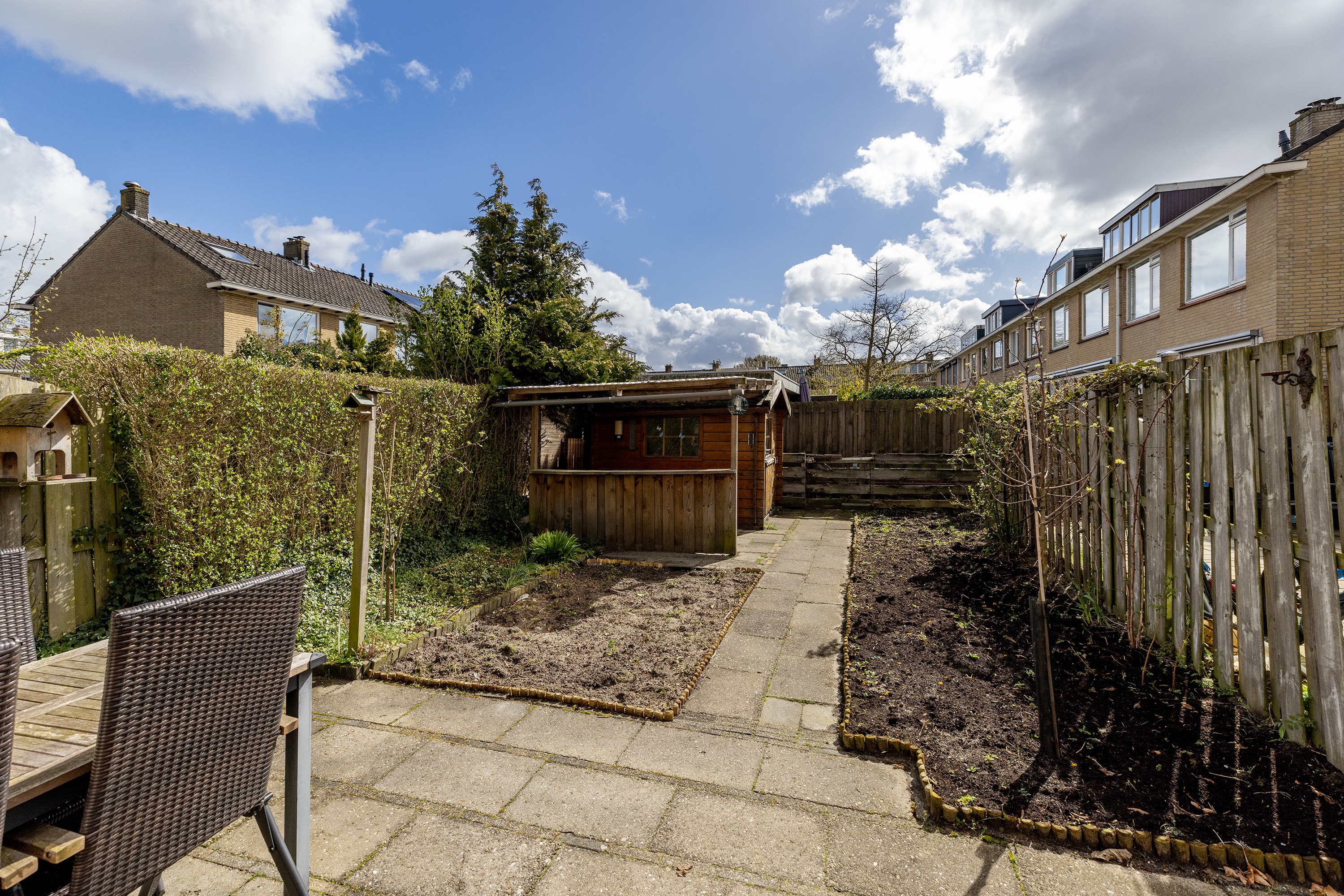De achtertuin is gelegen op het zuiden en is een heerlijke plek om te ontspannen. Met een overkapping achterin de tuin, een vrijstaande houten berging, een elektrisch bedienbaar zonnescherm en een achterom is deze tuin compleet en praktisch ingericht.