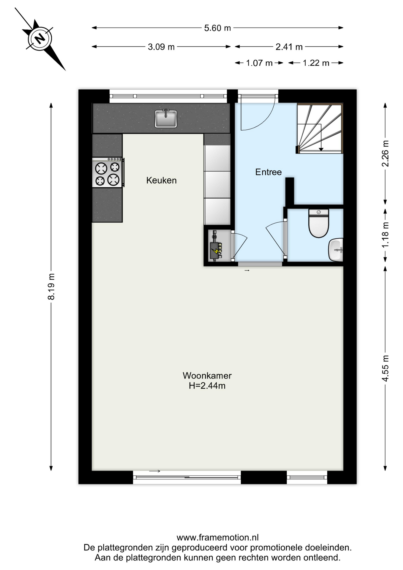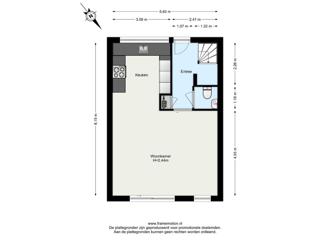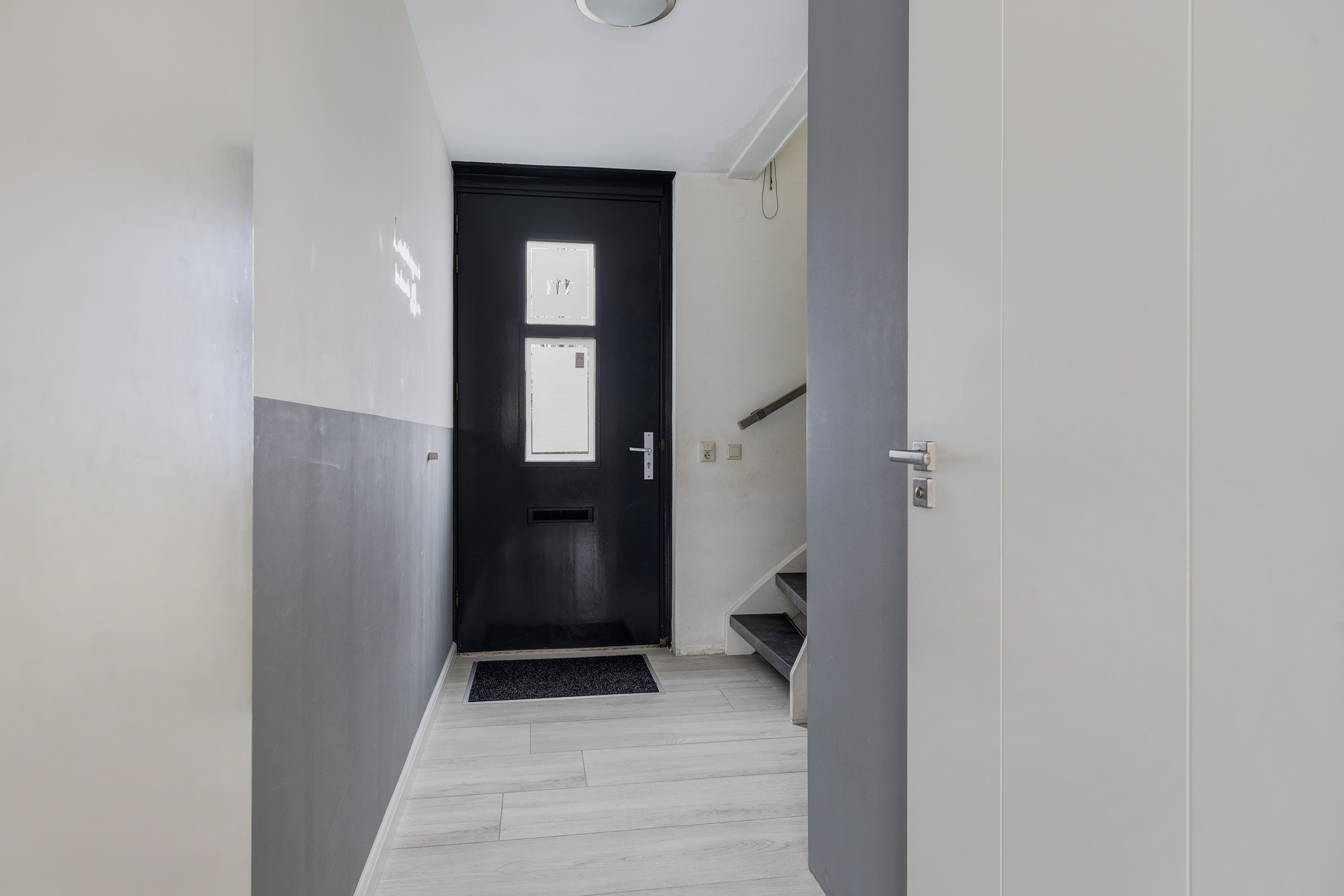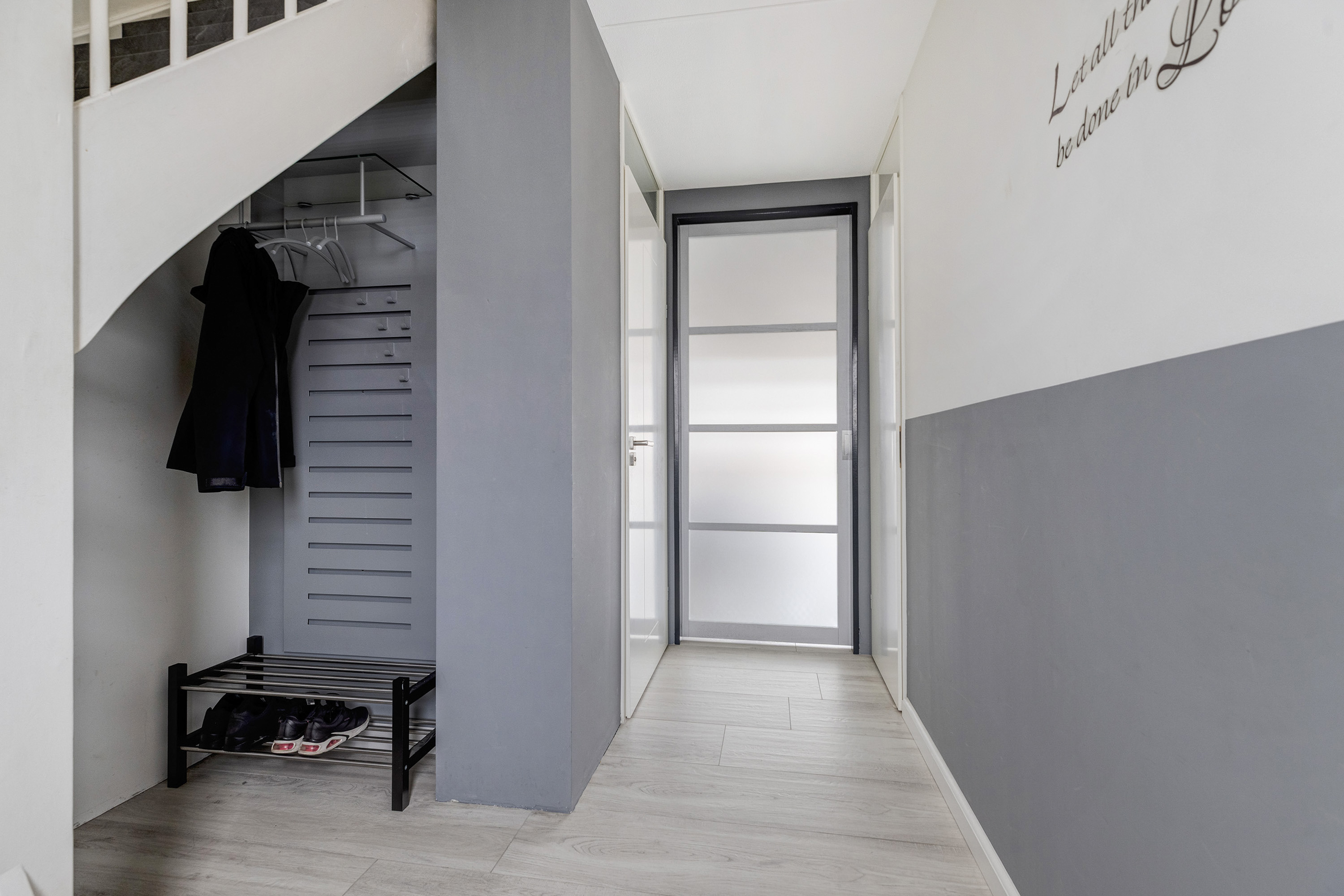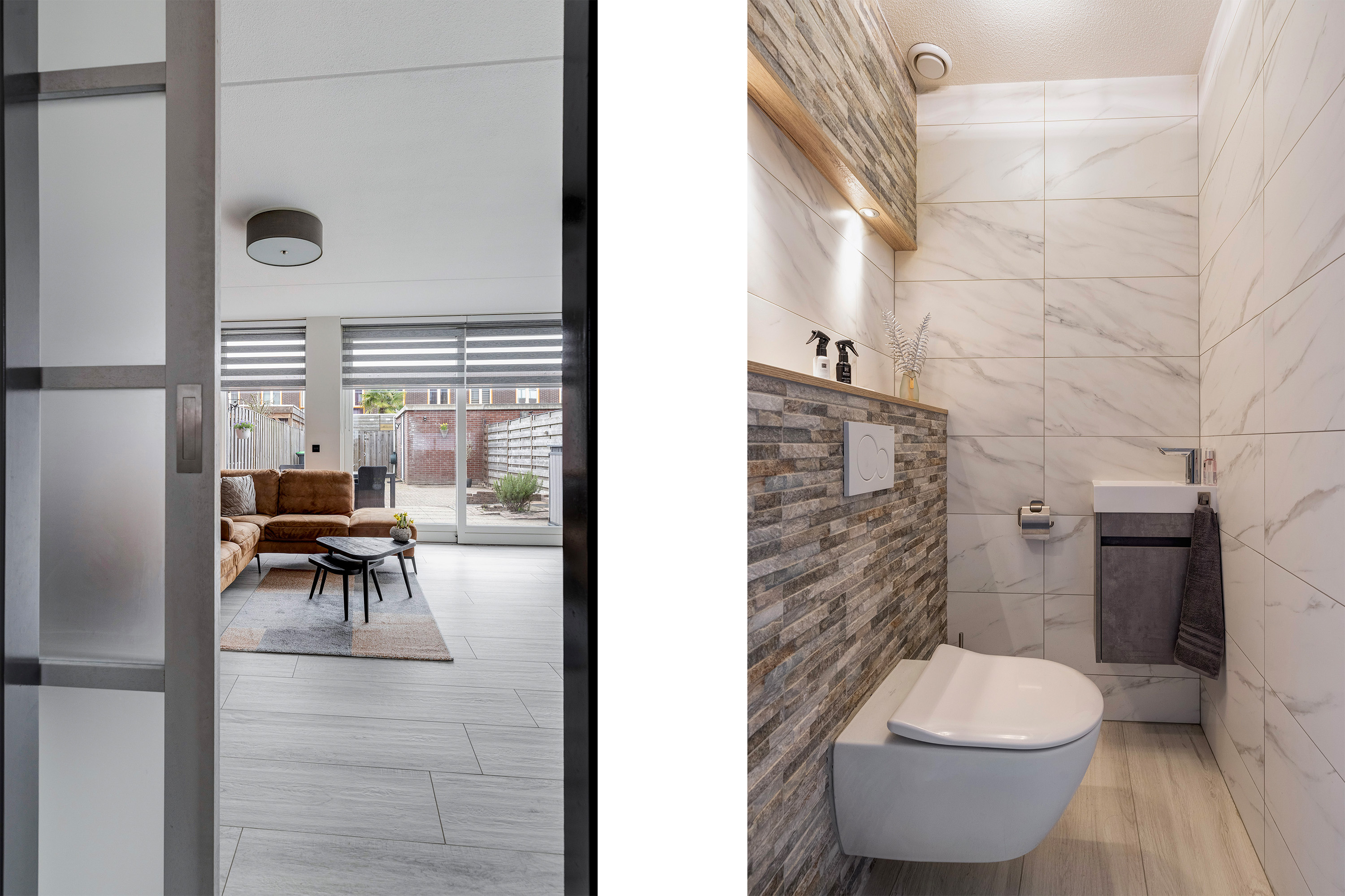Via de entree komt u in de hal met meterkast, modern toilet, vernieuwd in 2022, volledig betegeld en voorzien van fonteintje, toegang tot de woonkamer. De trap naar de eerste verdieping is netjes gerenoveerd en afgewerkt in dezelfde stijl als de rest van de woning.