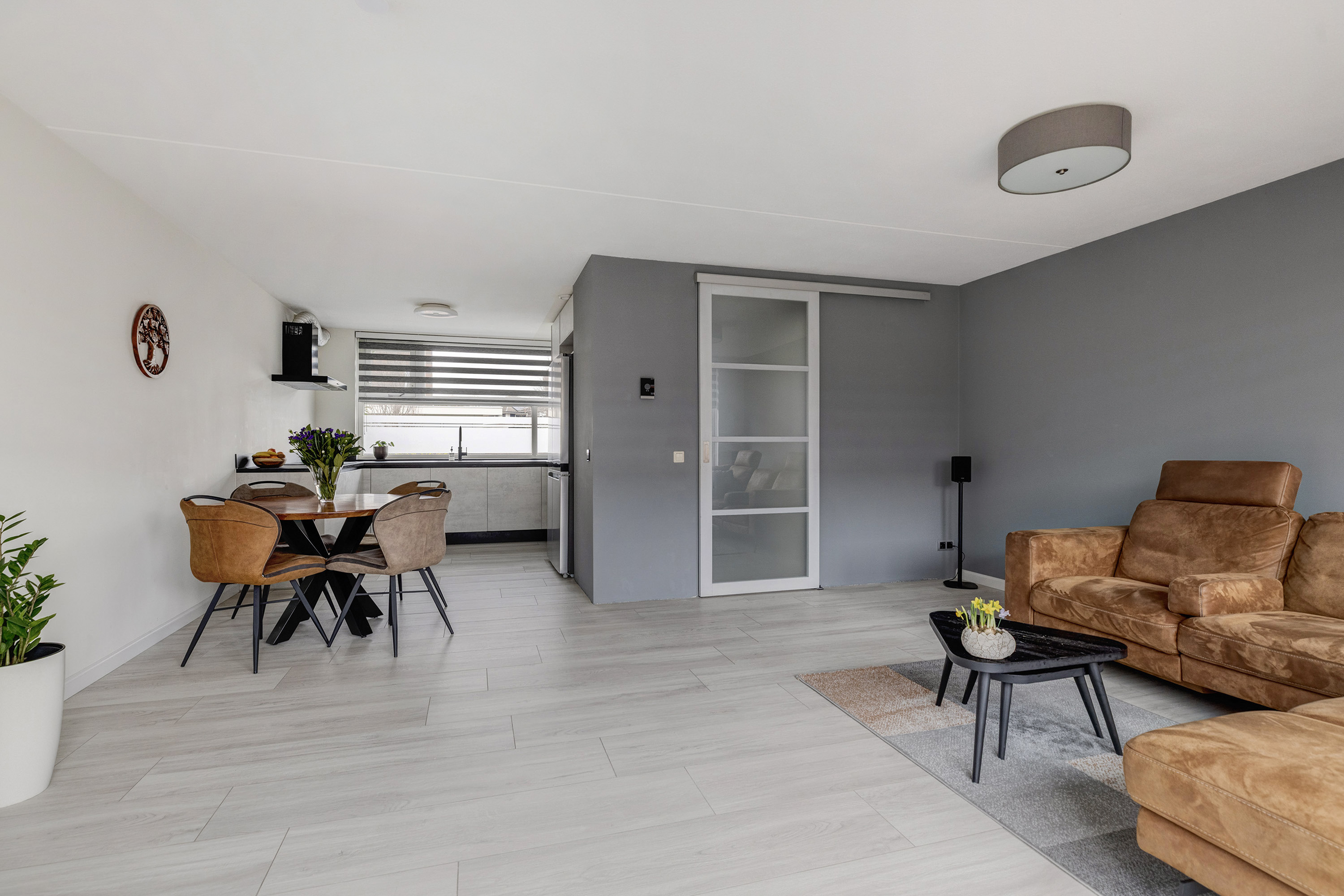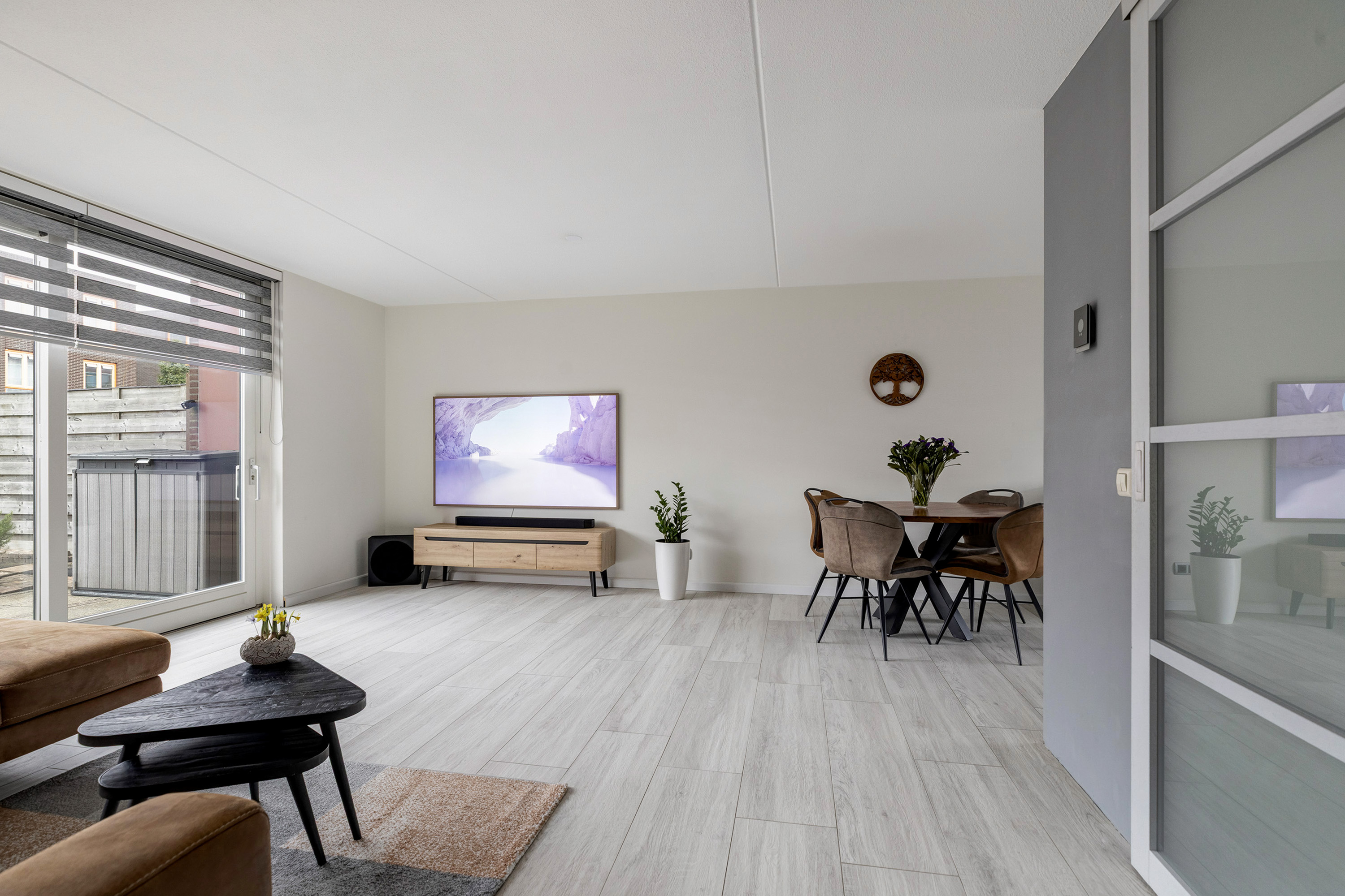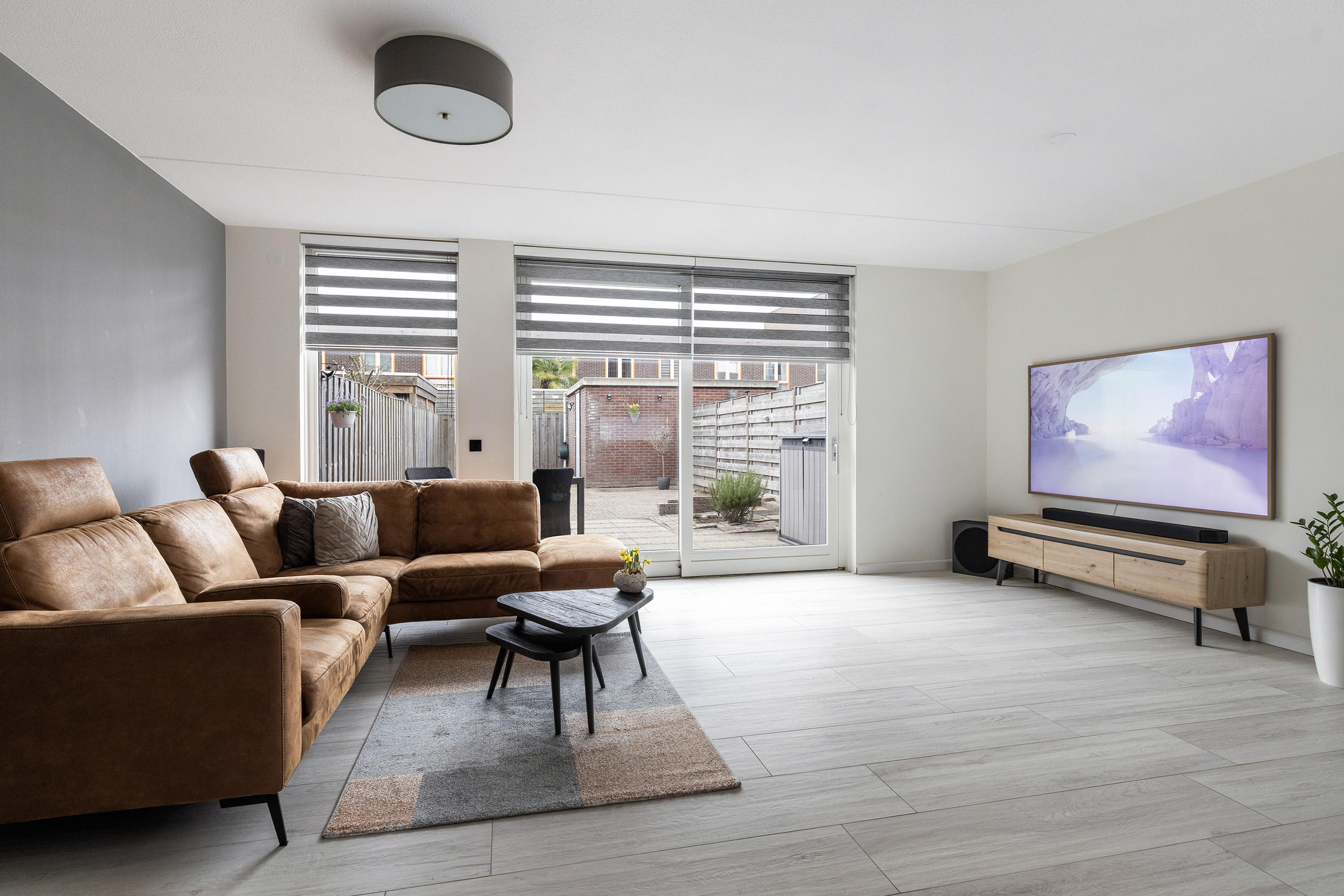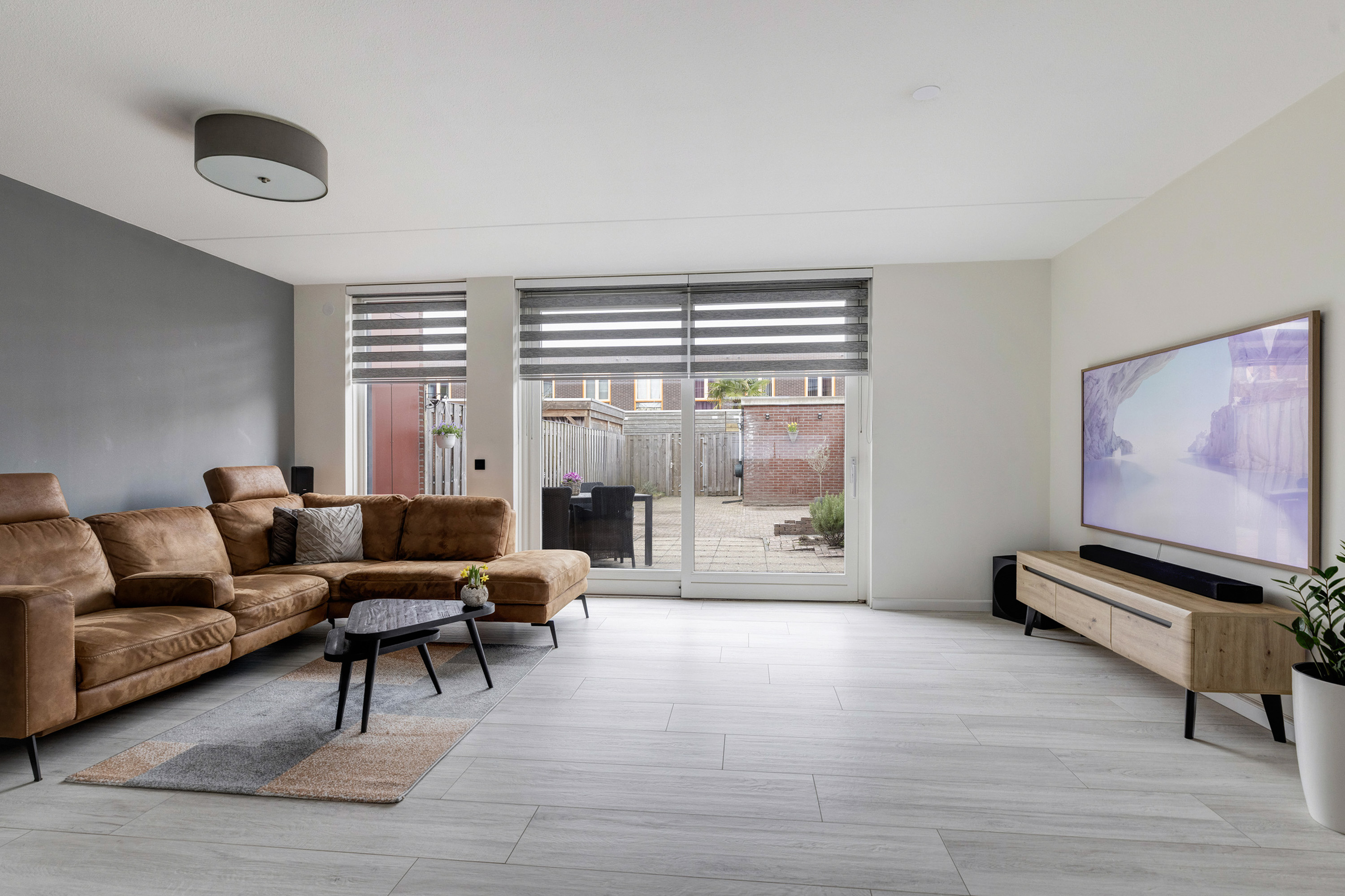 De tuingerichte woonkamer is sfeervol en comfortabel afgewerkt met vloerverwarming en een keramische parketvloer (2022). Vanuit de woonkamer heeft u via een schuifpui toegang tot de diepe en zonnige achtertuin welke is gelegen op het westen. Hier vindt u een stenen berging en een achterom. Aan de achterzijde is een zonnescherm geplaatst voor extra comfort op warme dagen.