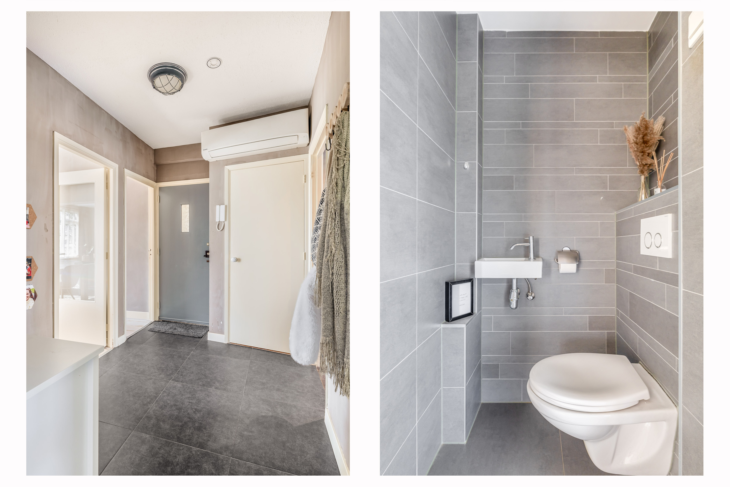 Entree met meterkast, hal met toegang tot alle vertrekken, toiletruimte voorzien van een hangcloset toilet en een fonteintje. De toiletruimte is geheel betegeld in een neutrale kleurstelling.