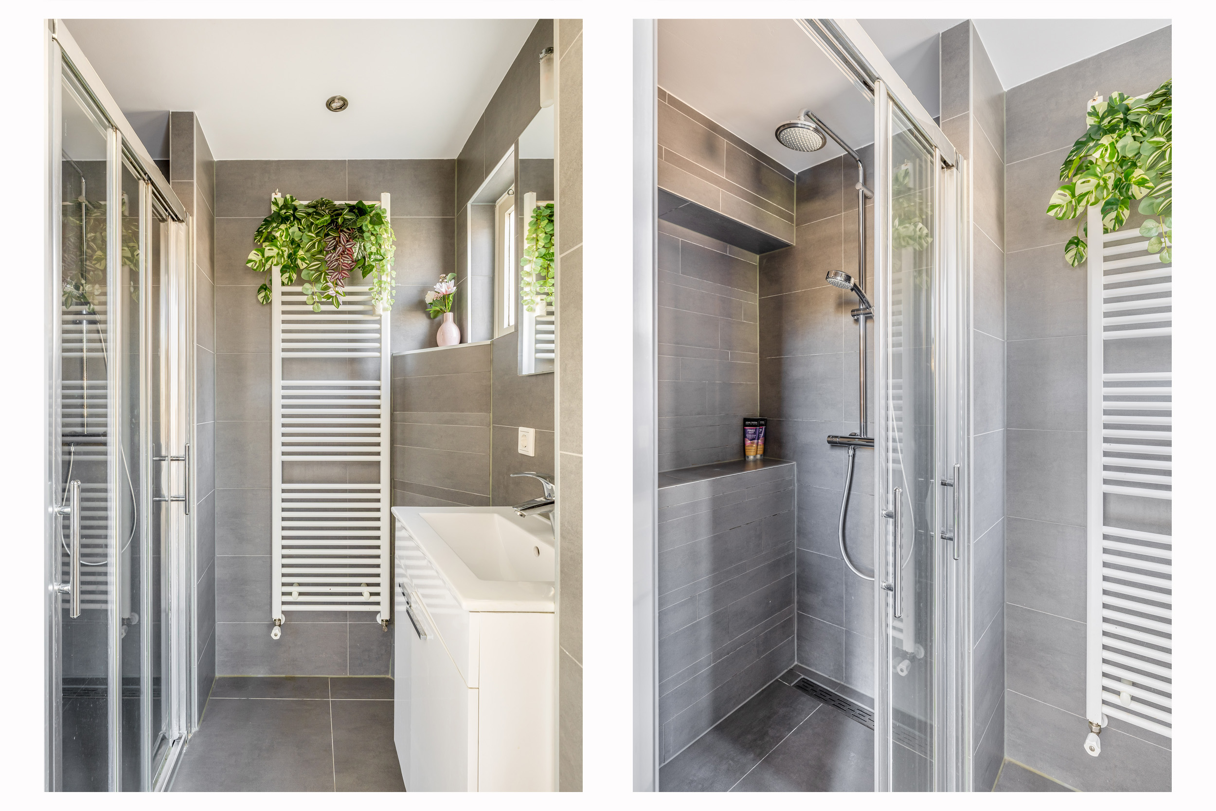 Badkamer (ca. 3 m2) met sanitaire voorzieningen zoals een wastafel met wastafelmeubel, spiegel, verlichting, designradiator en een inloopdouche met regendouche. De badkamer is geheel betegeld in een grijze kleurstelling.