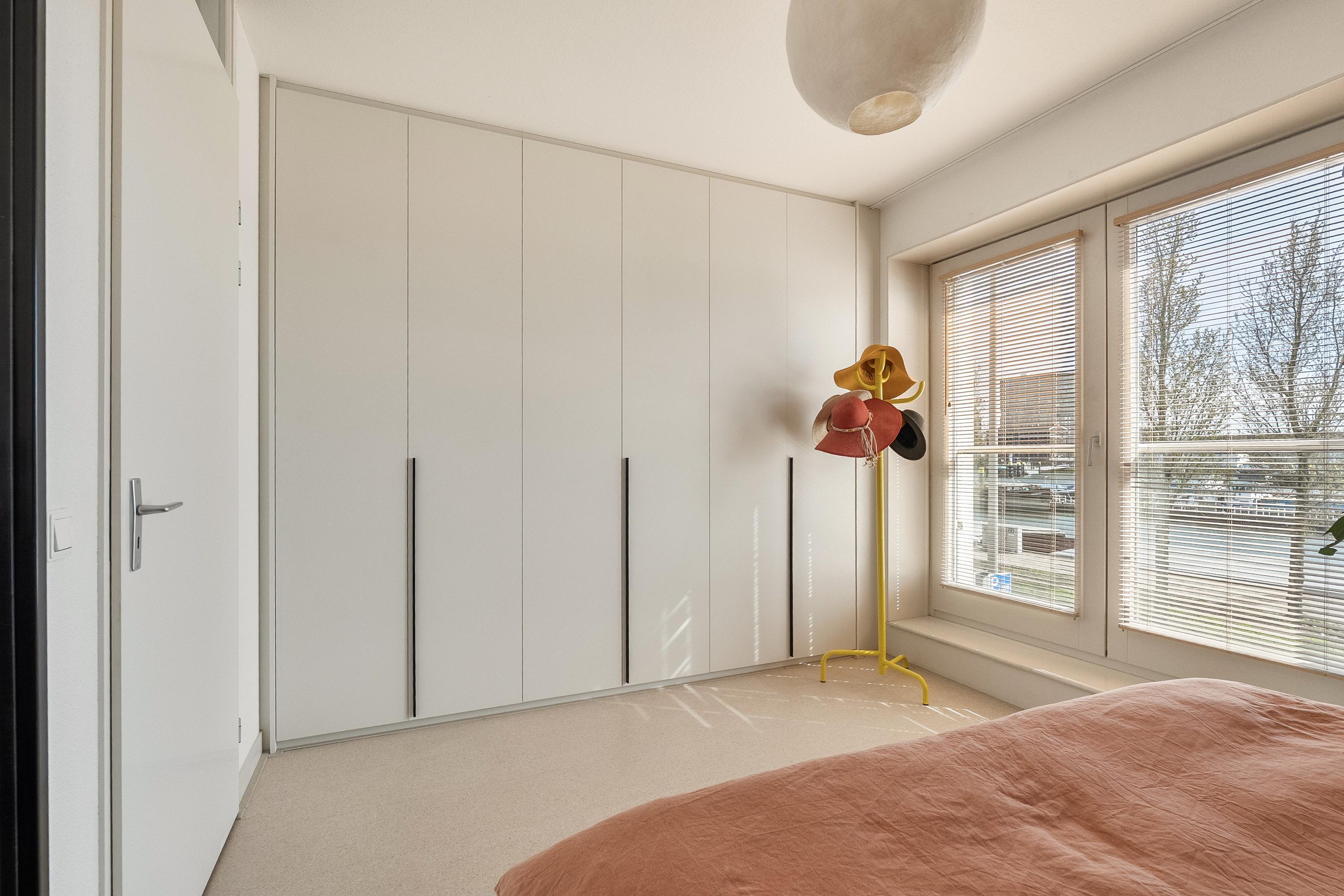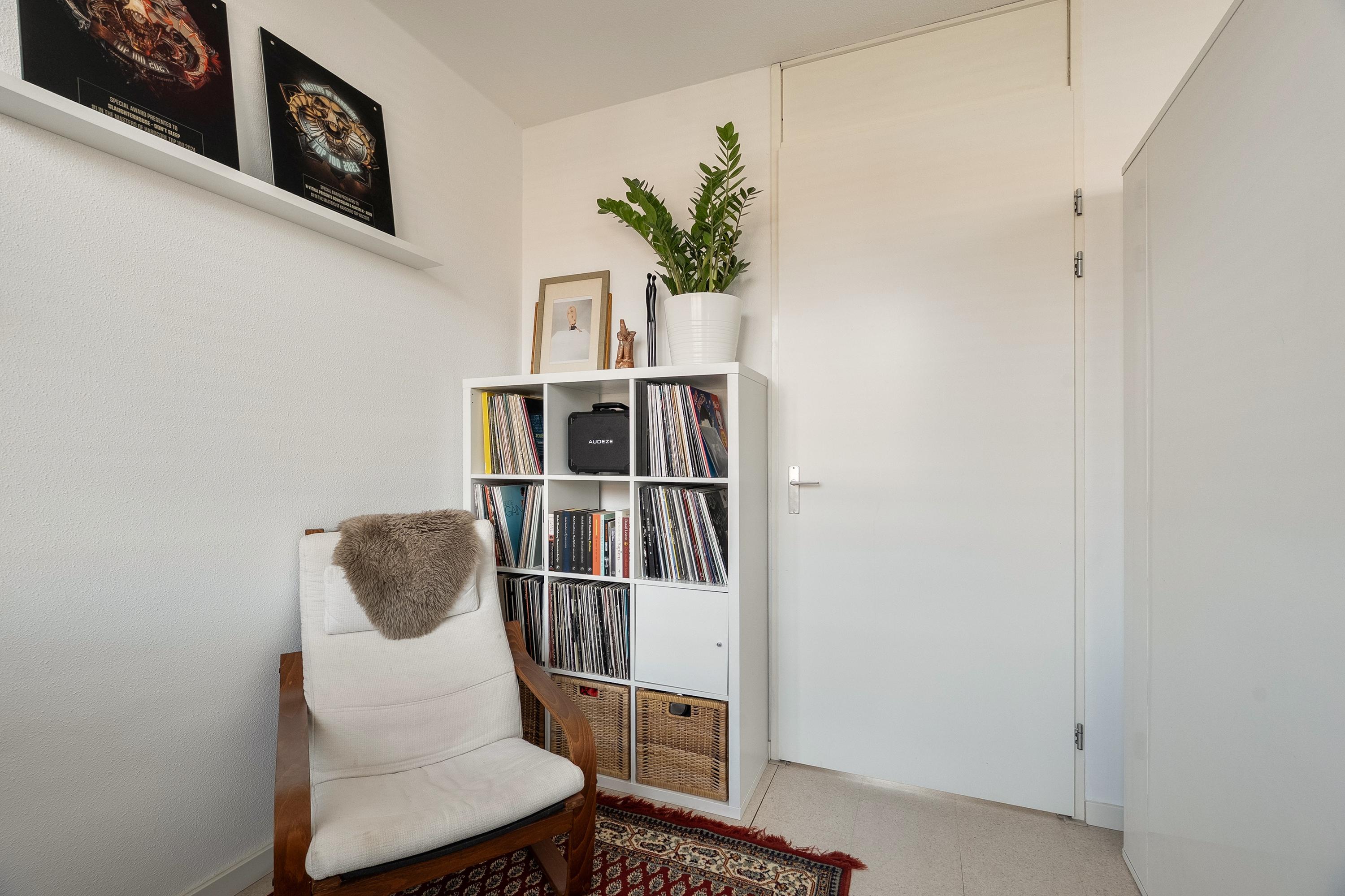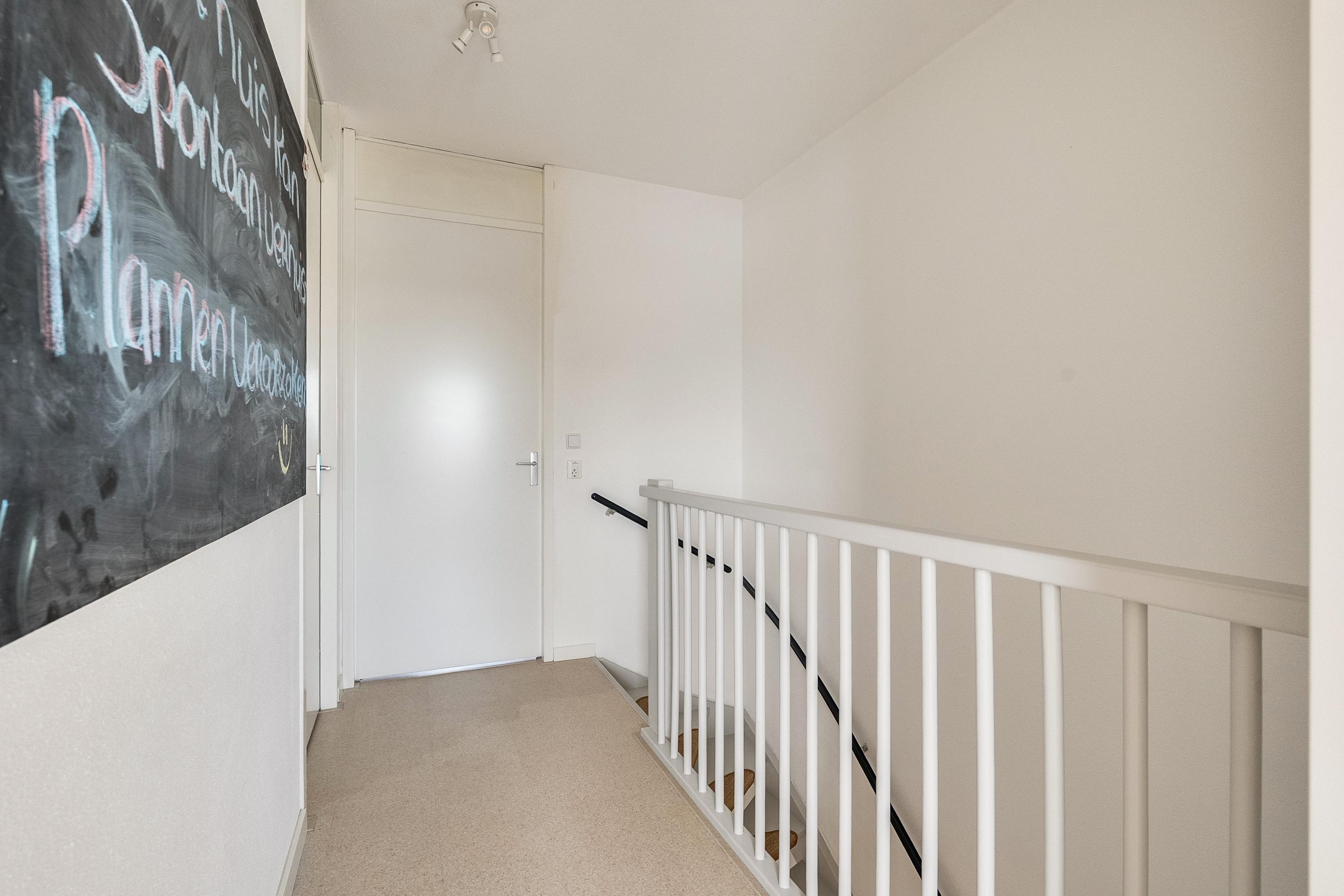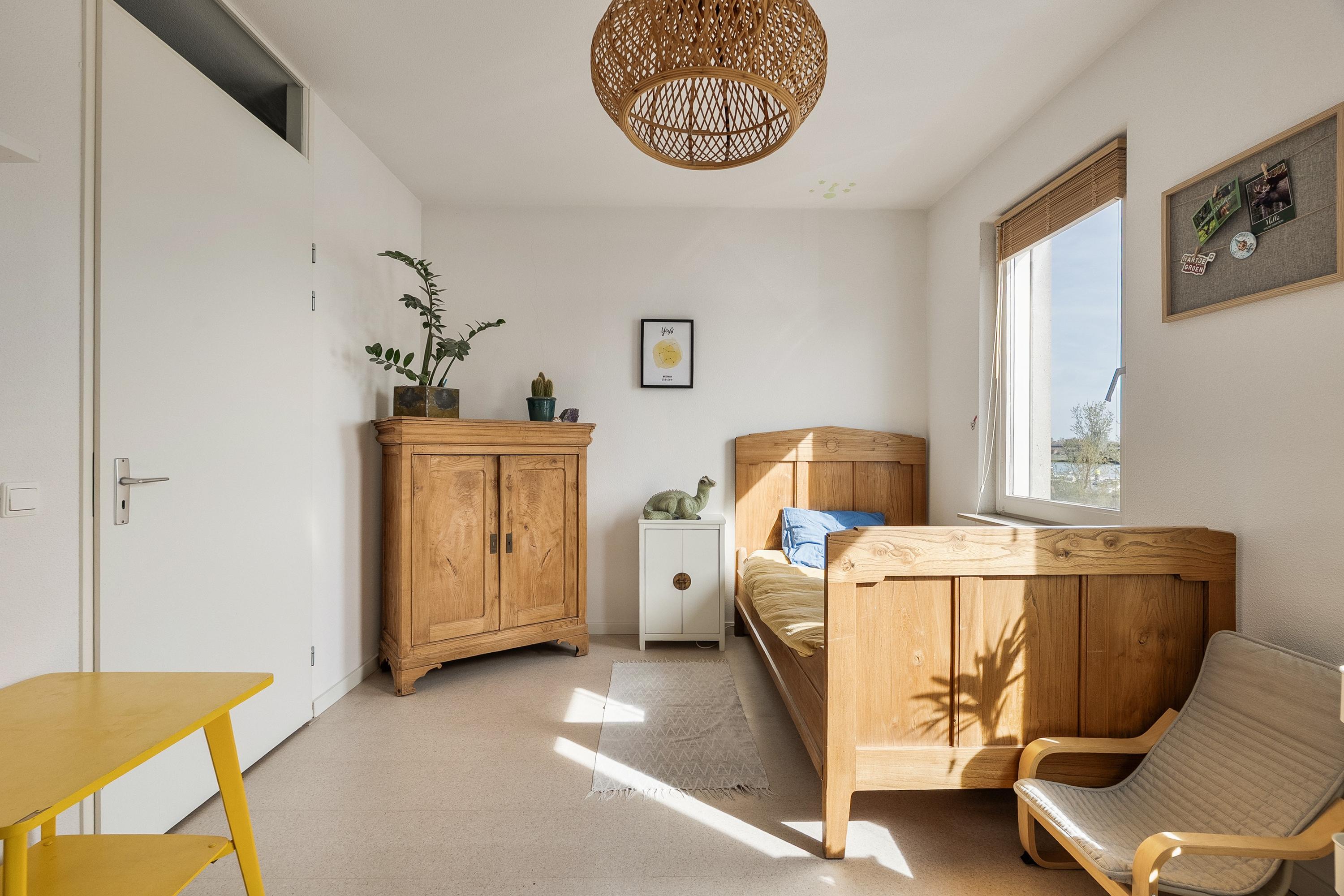 Op de tweede verdieping treffen we nog eens twee slaapkamers en een overloop met een inpandige berging — handig voor de wasmachine en opslag. De slaapkamer aan de voorzijde is ook hier voorzien van een inbouwkast die achterblijft. Ook hier zijn de vloeren in 2023 vernieuwd. Er is geen badkamer op deze verdieping, maar de ruimte biedt zeker mogelijkheden voor wie dat in de toekomst wil realiseren.