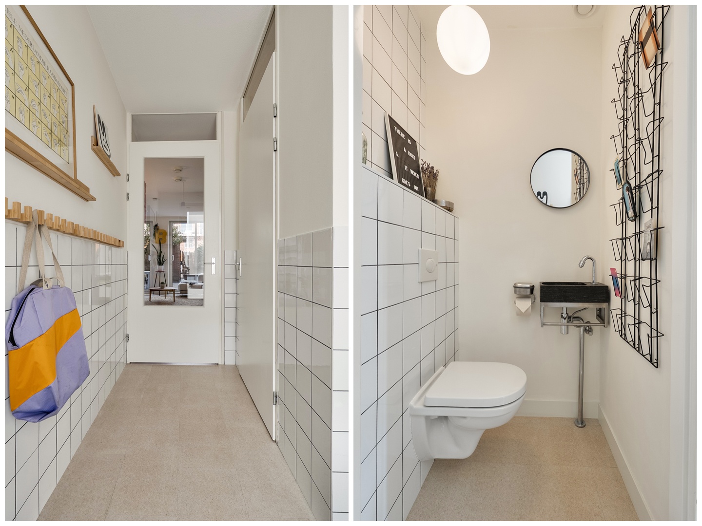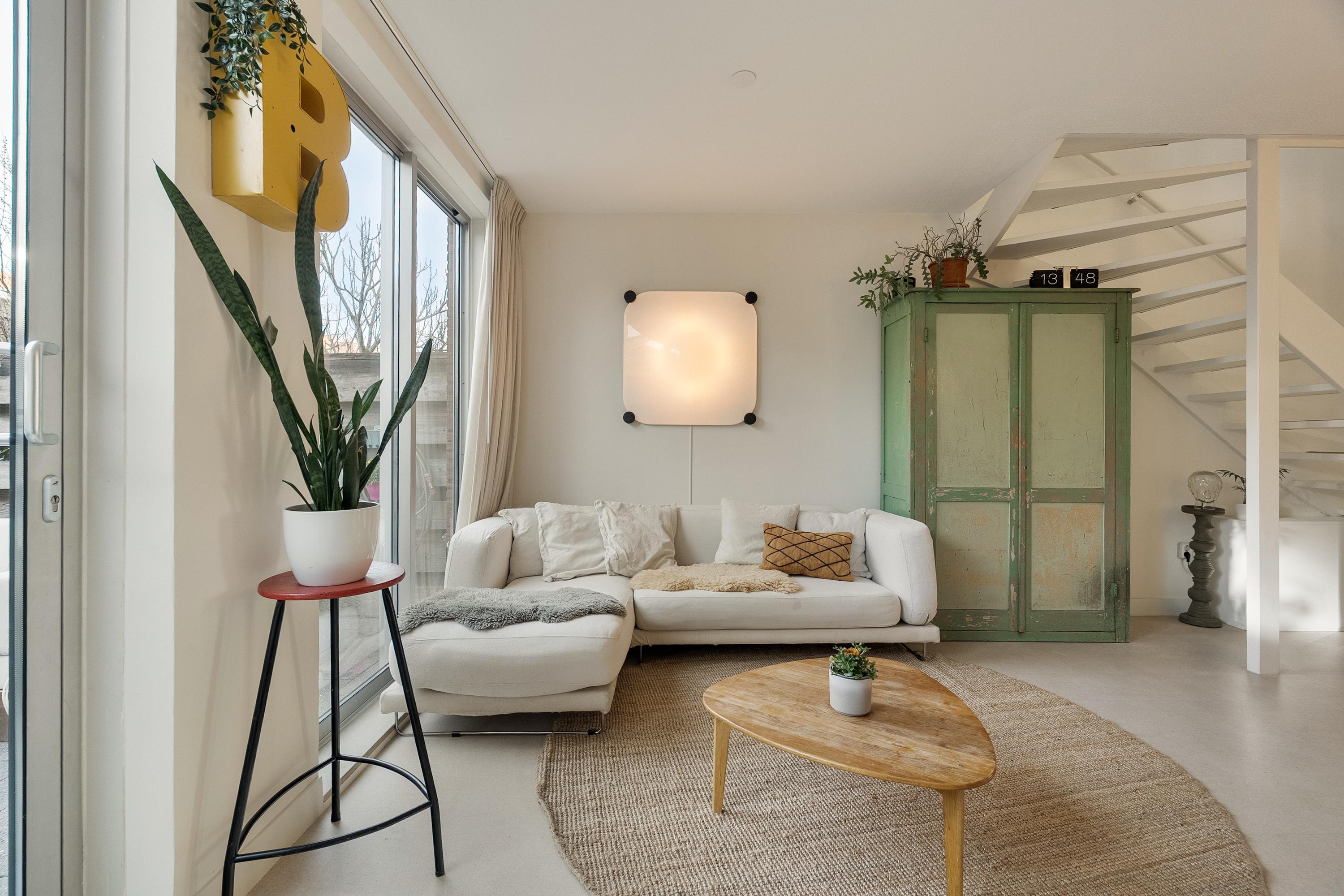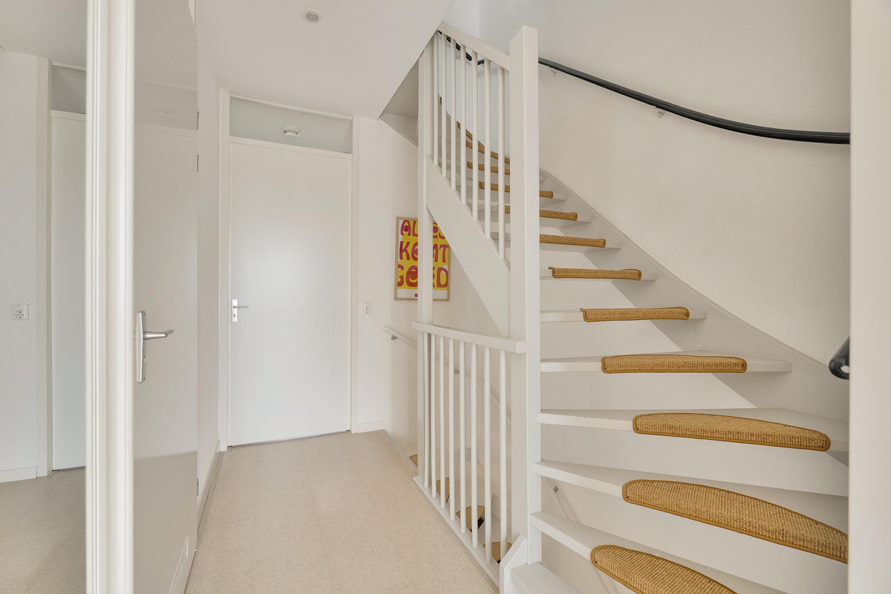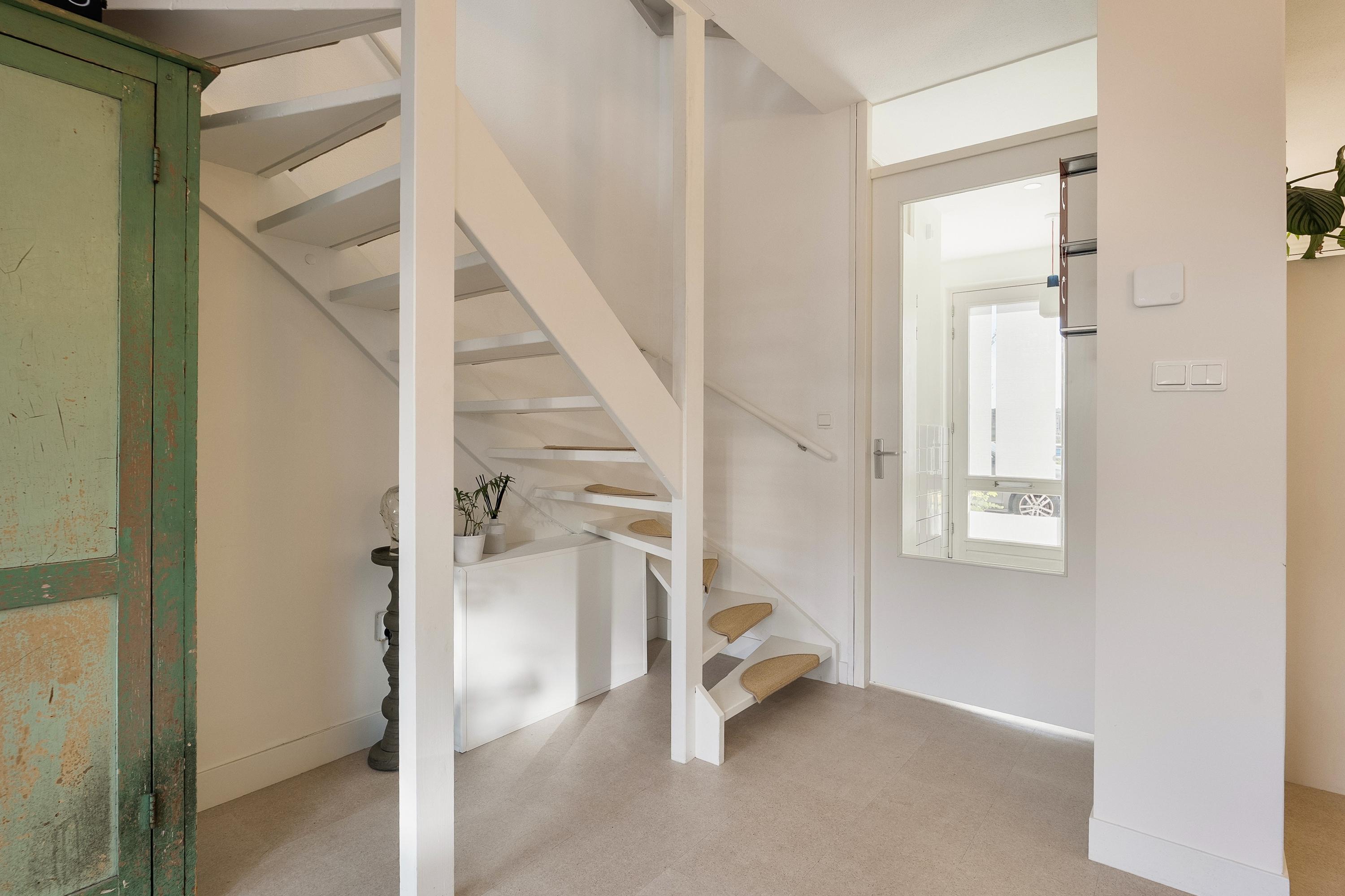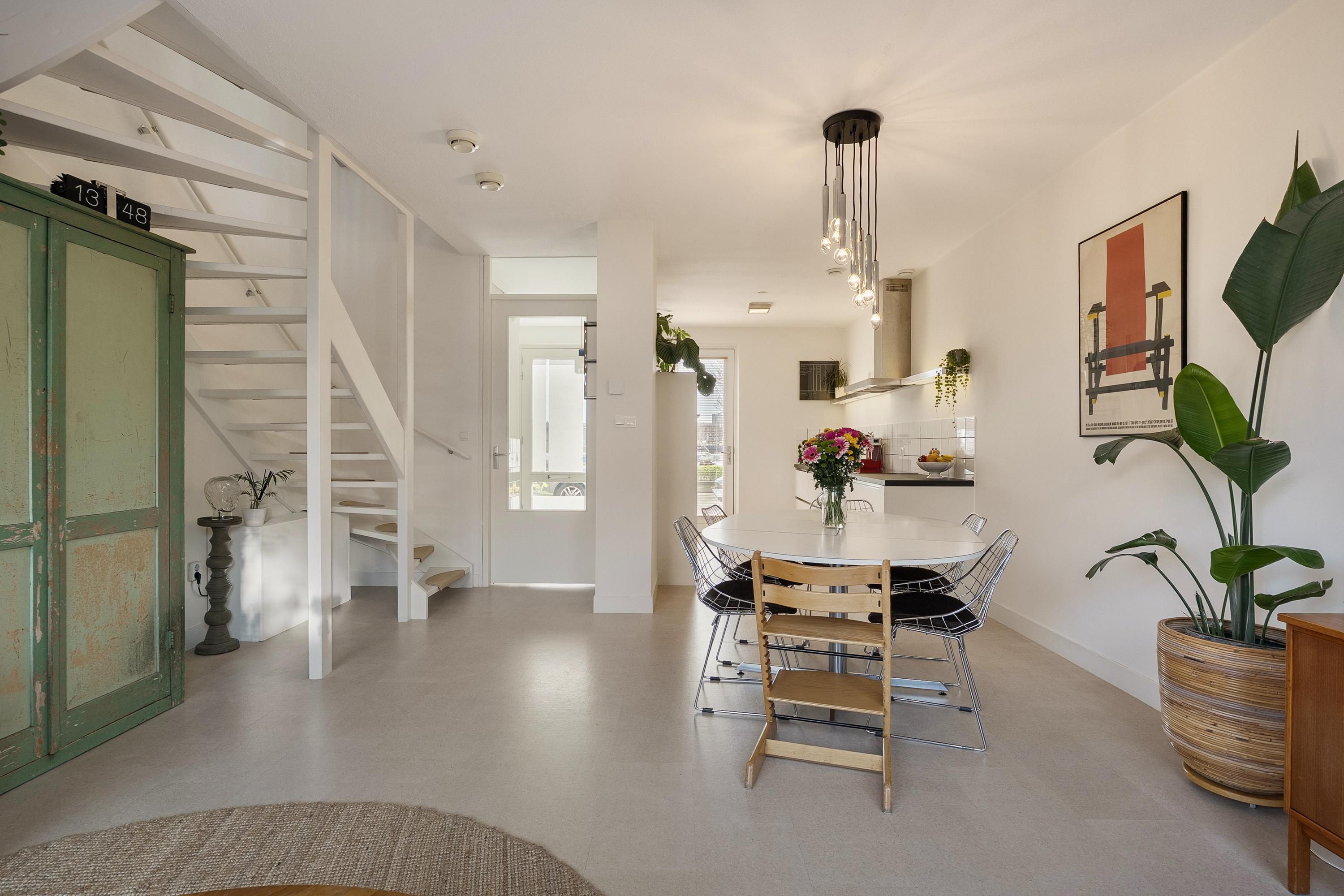 We stappen binnen via de voordeur op de begane grond en komen in de hal. Dankzij de verbouwing van 2023 is deze entree geopend richting de woonkamer: de trap is nu onderdeel van de leefruimte, waardoor de begane grond één open, logische eenheid vormt. Op de vloer ligt een warme kurkvloer van Decork Haarlem — een mooie keuze die direct de toon zet. De vloerverwarming zorgt voor comfortabele warmte, zonder zichtbare radiatoren.