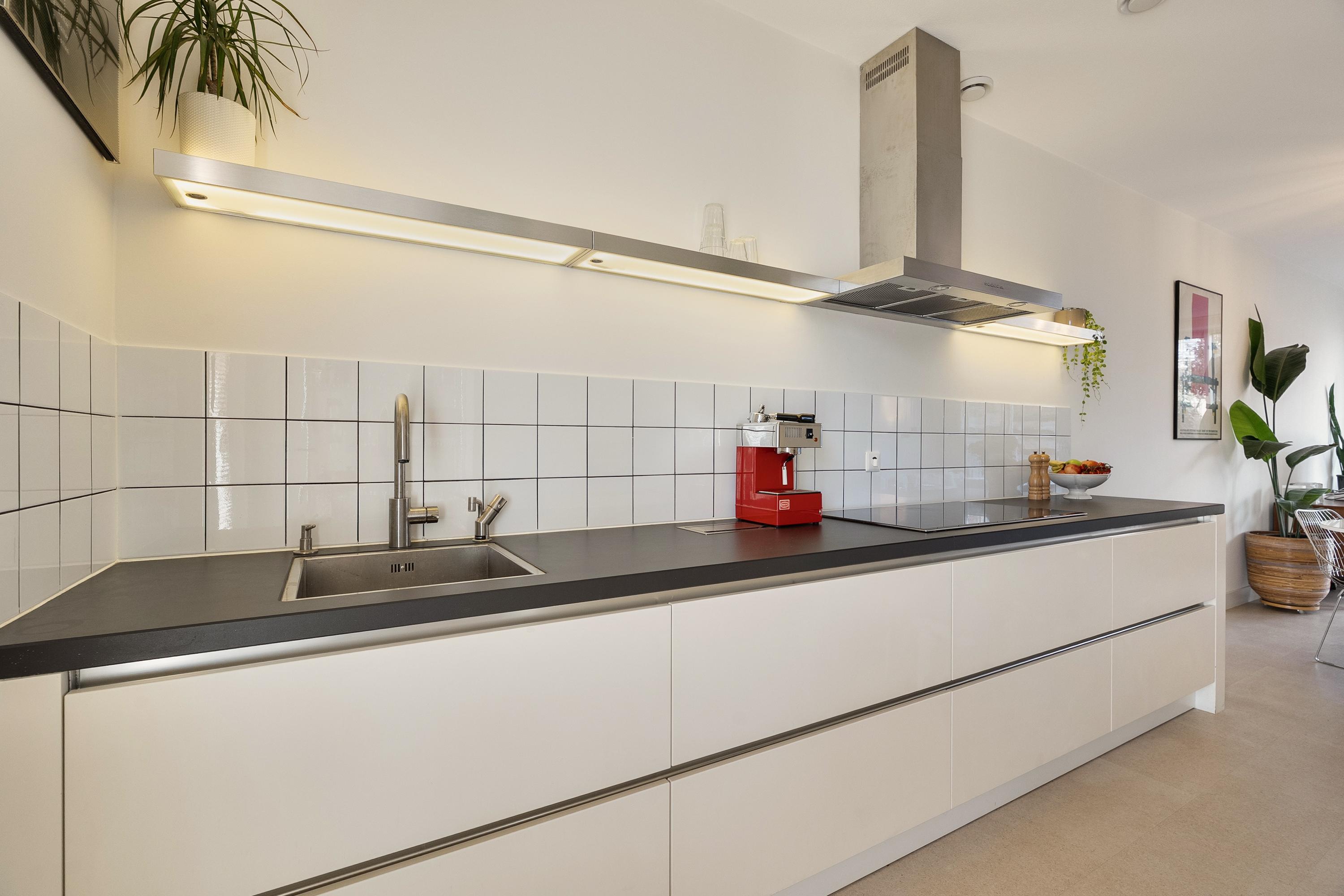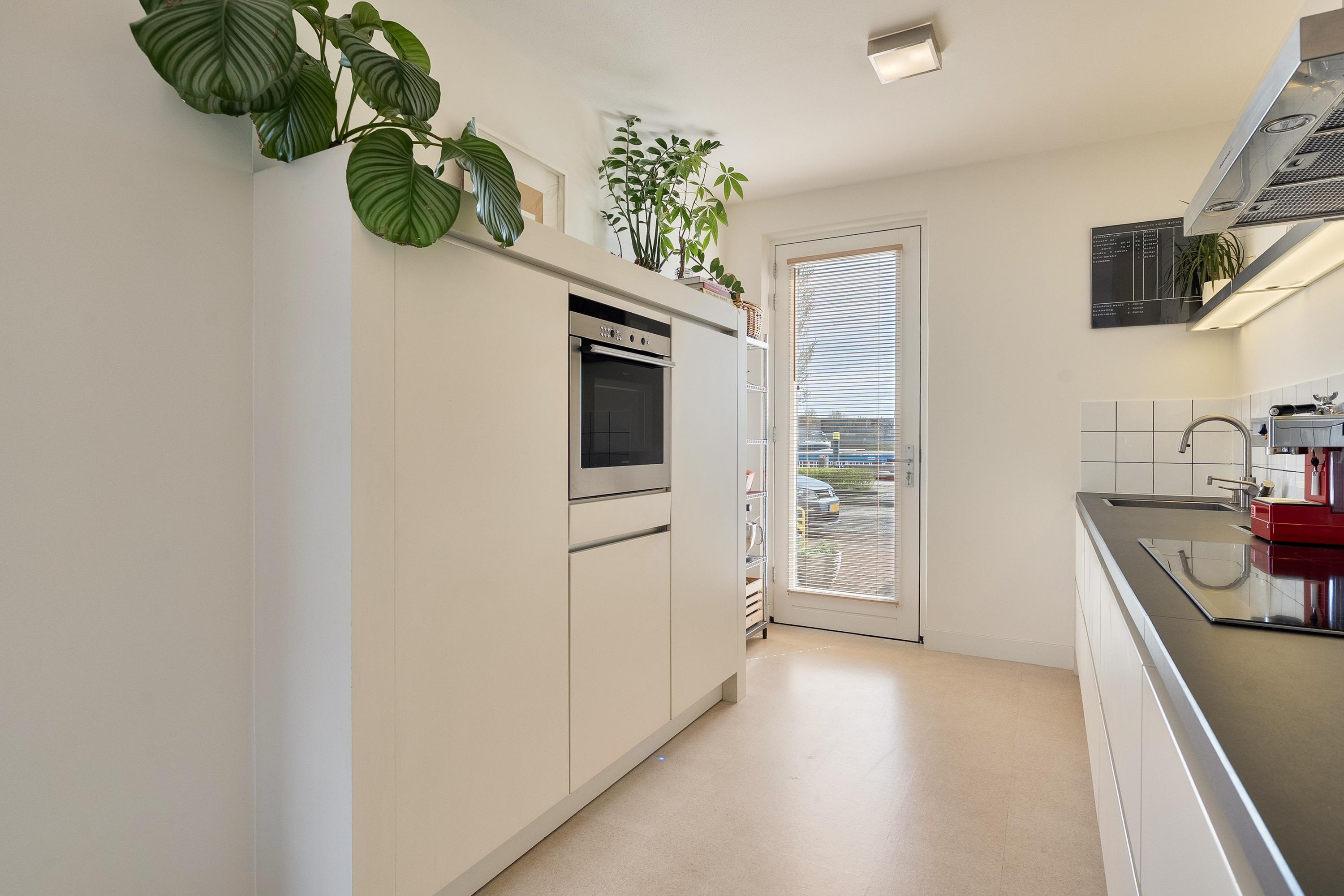 Aangrenzend aan de woonkamer bevindt zich de keuken uit 2008: een gesloten opstelling met witte fronten en een donker aanrechtblad. De apparatuur is volledig aanwezig en functioneert goed — inductiekookplaat, afzuigkap, combi-oven, koelkast, vriezer, vaatwasser en een Quooker. De keukenkraan is in 2026 vernieuwd.