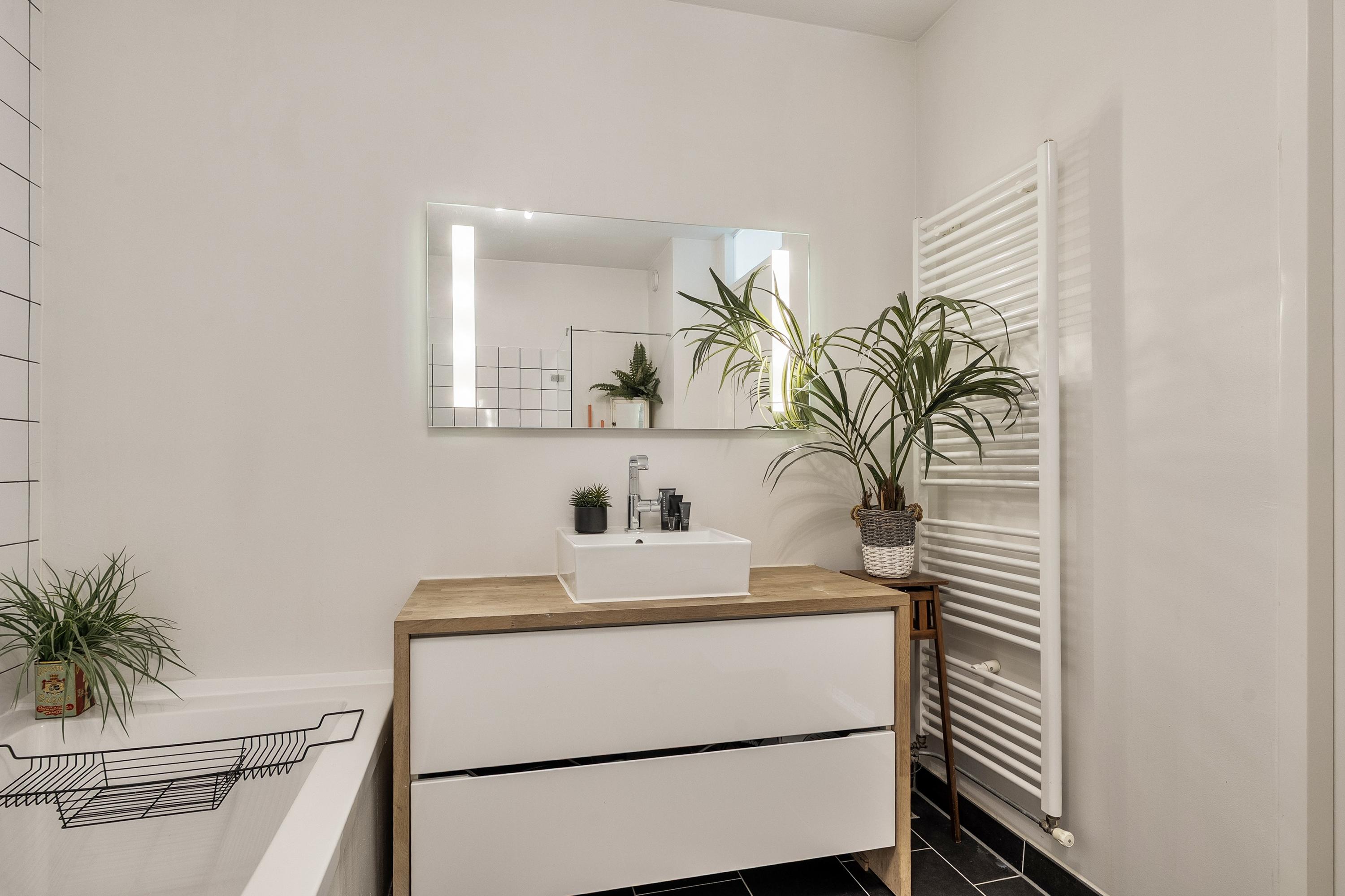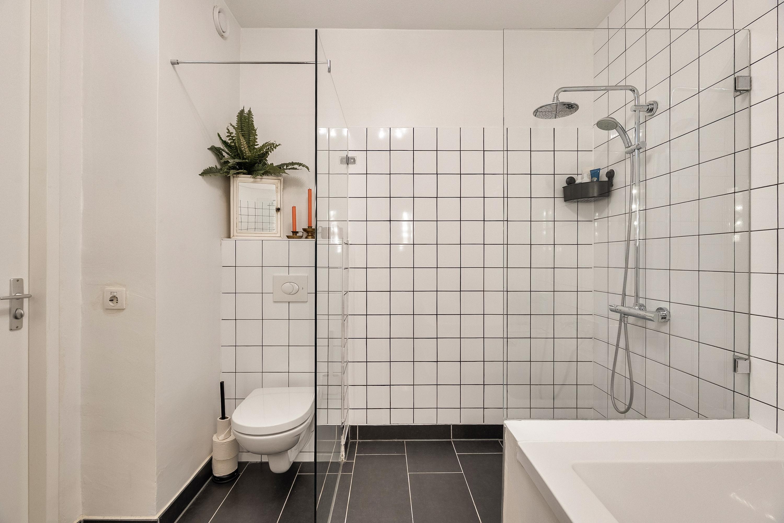 Via de vaste trap lopen we naar de eerste verdieping. Hier treffen de badkamer en twee volwaardige slaapkamers. De slaapkamer aan de voorzijde is voorzien van een inbouwkast die achterblijft. De badkamer is ruim en degelijk afgewerkt: witte tegels met donkere voegen, een bad, een inloopdouche met regendouchekop, een wastafelmeubel met houten blad en een spiegel met geïntegreerde verlichting. De badkamer dateert uit 2008 en is goed onderhouden. De overige vloeren op deze verdieping zijn in 2023 vernieuwd.