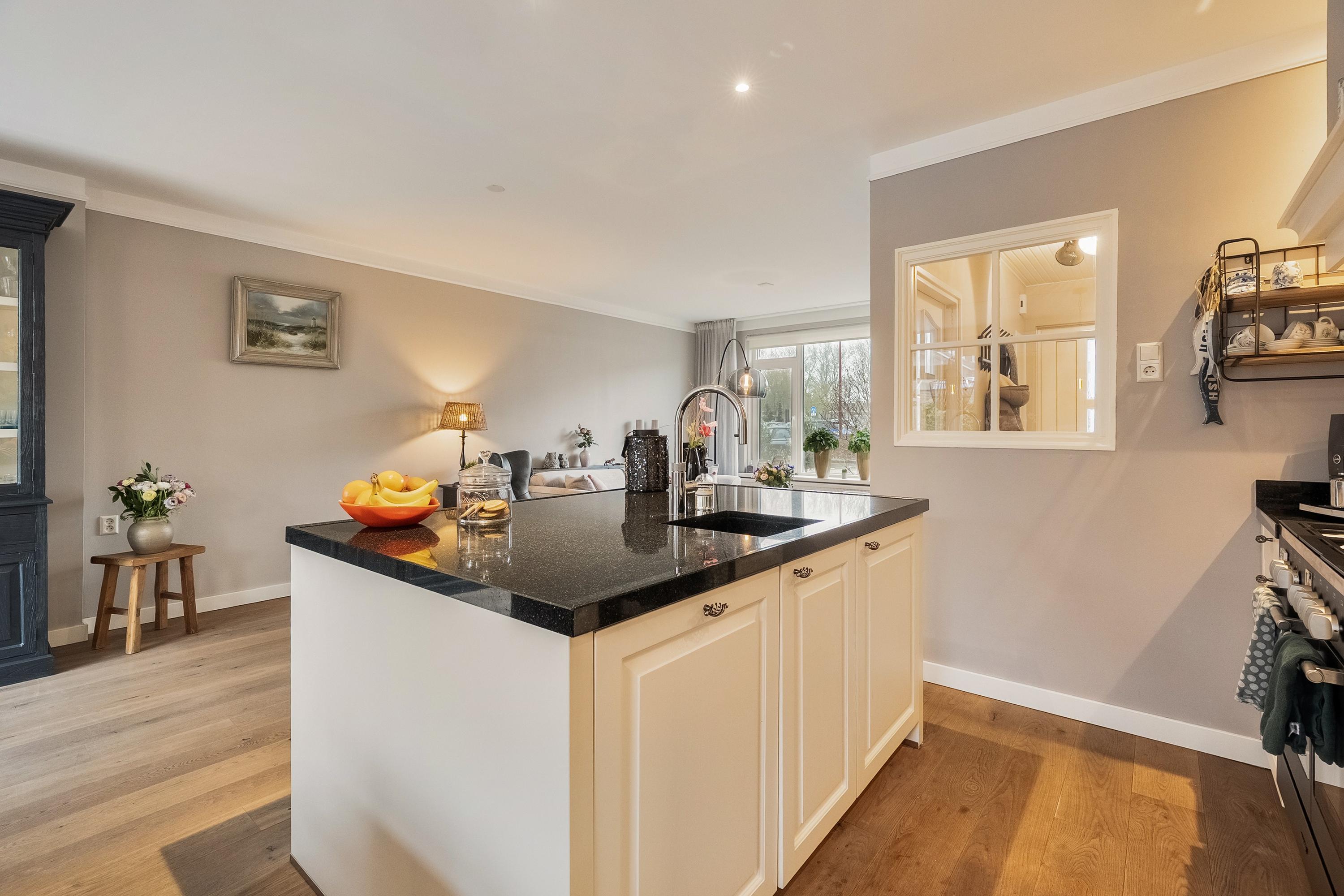 De achterzijde is feitelijk een hele mooie grote leefkeuken! Wat een topruimte en wat is dit slim en ruimtelijk ingedeeld. Tegen de zijwand zijn het grote fornuis met 2 ovens en 5-pits gasstel geplaatst met een grote afzuigkap erboven. Daar treffen we ook de koelkast en vriezer en 6 laden om wat spullen in op te bergen. Er is een mooi plekje voor je koffiemachine. Dan treffen we het prachtige eiland van ca. 120 x 180 cm. Wat top, want dat betekent aan beide kanten diepe kasten! Op de kastjes ligt een mooi granieten keukenblad met daarin de RVS spoelbak met Quooker. Een heerlijk groot werkblad om mooie maaltijden op te bereiden. Hieronder is ook de vaatwasmachine verwerkt.