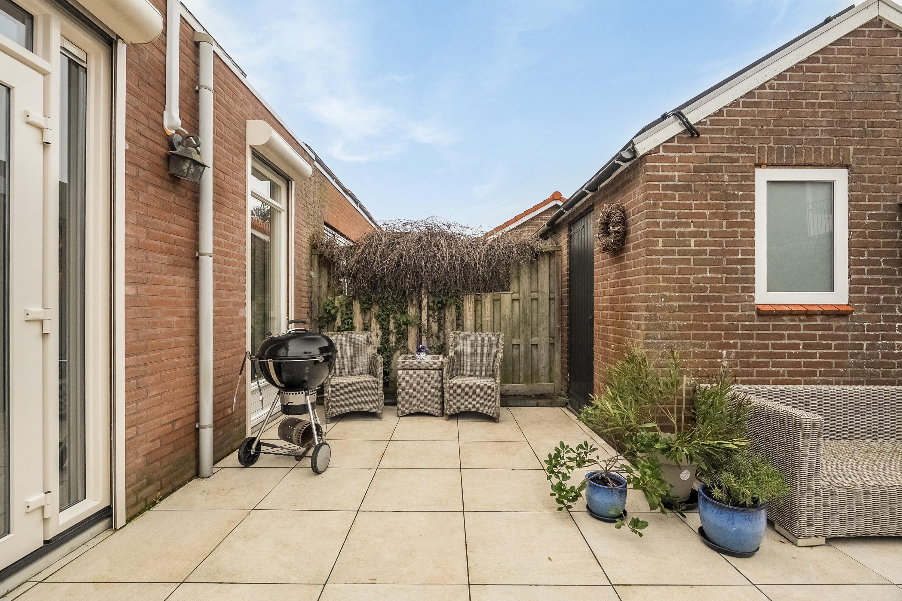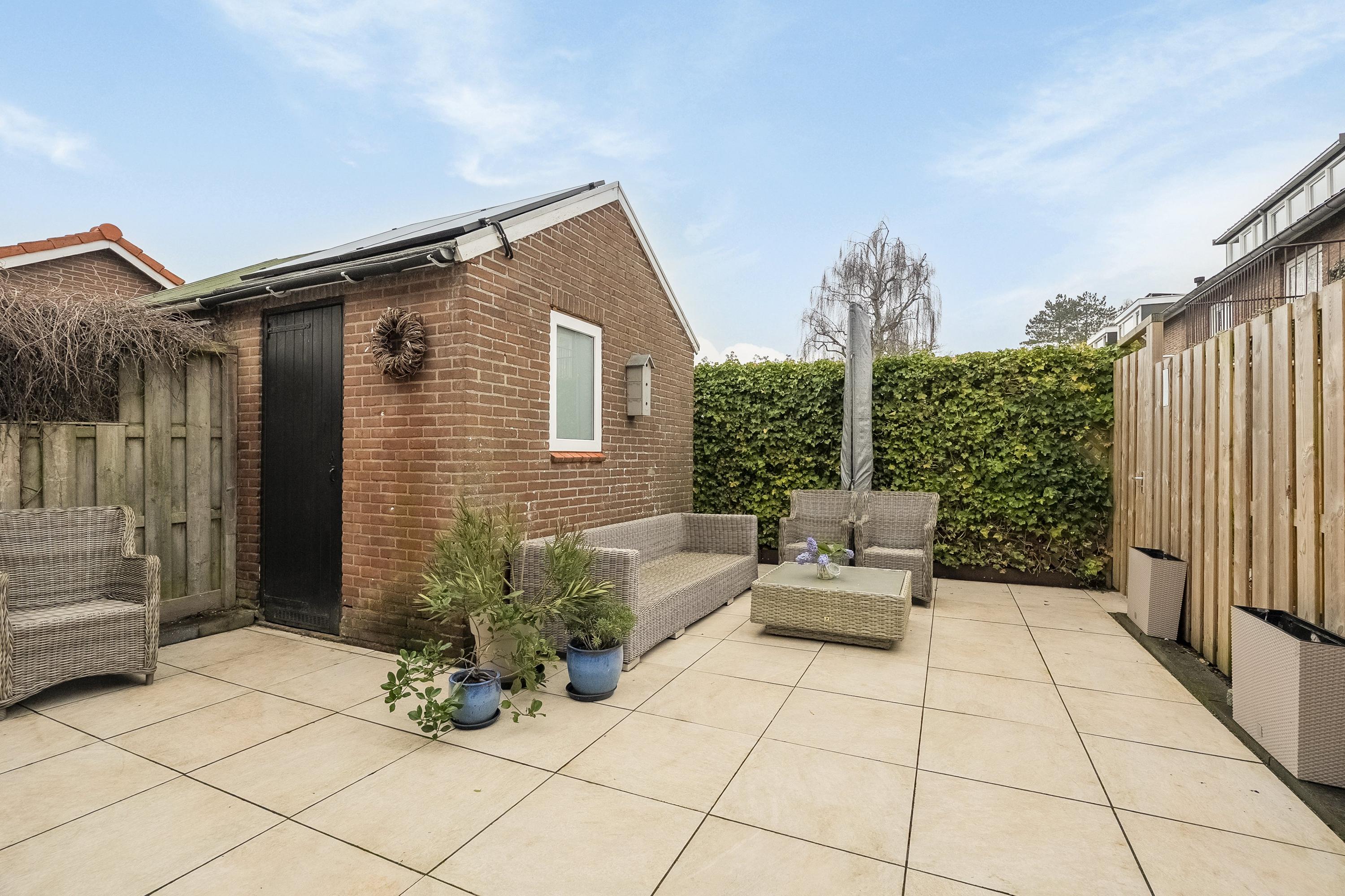 Door de dubbele openslaande deuren lopen we de achtertuin in, deze ligt op het oosten en is circa 44 m² groot. Hier geniet je van de ochtend- en de middagzon. De tuin is verzorgd aangelegd en beschikt over een stenen berging en een achterom. Op de schuur liggen 4 zonnepanelen. De voorzijde van de woonkamer ligt op het westen, vandaar dat er een mooie luifel is geplaatst om de zon in de zomer een beetje buiten te houden.