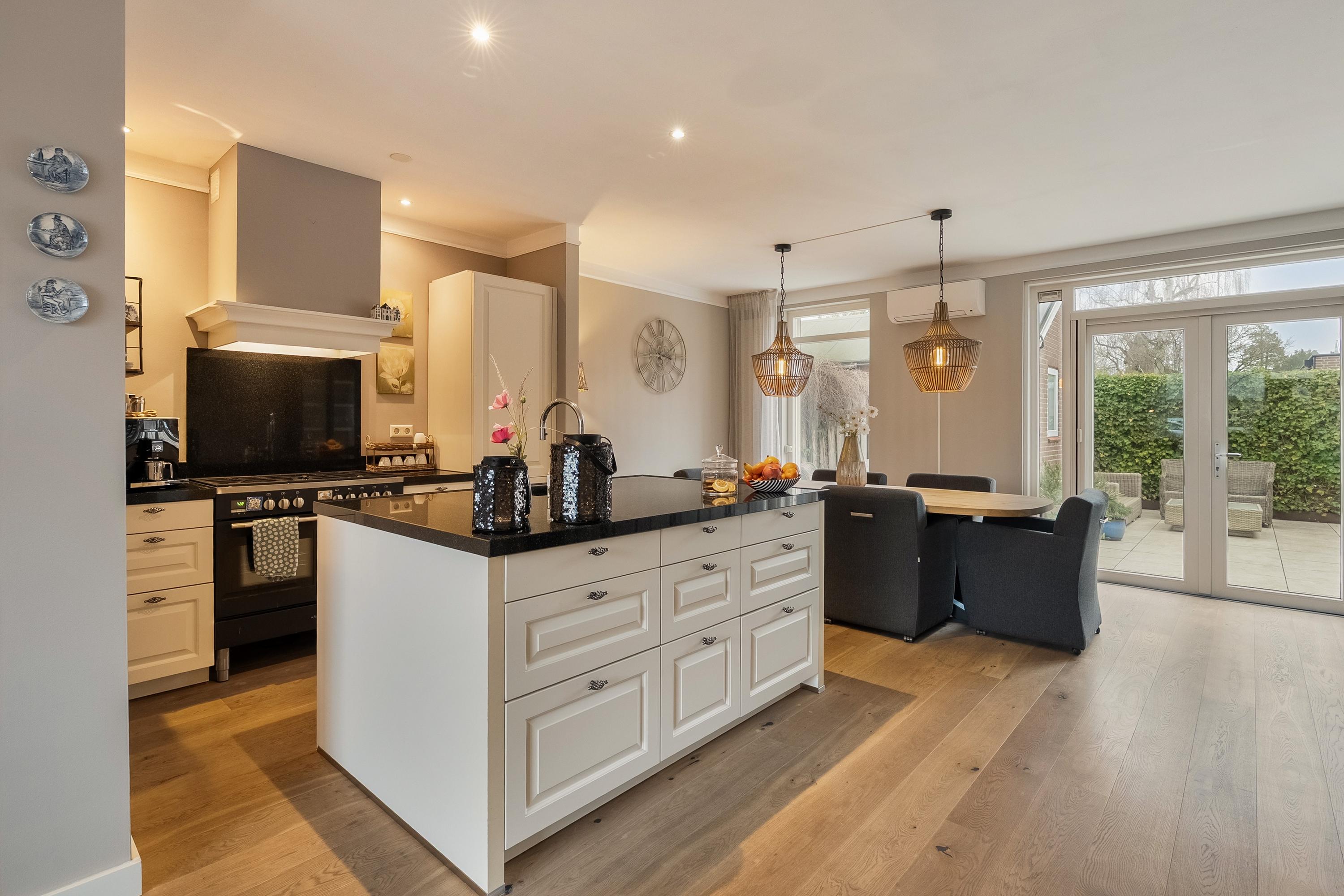 Aansluitend ga je lekker in de uitbouw aan de eettafel zitten. Een plek om heerlijk te tafelen, maar ook een hele fijne plek om de krant te lezen, wat spelletjes te doen en nog even wat mailtjes weg te werken. Er is ruimte voor een grote servieskast en er is zelfs nog ruimte voor een toffe speelhoek voor kids. Op de vloer ligt een mooie houten vloer en de muren en plafond zijn strak gestuukt. Bovendien is de woning voorzien van een airconditioning, waardoor het ook op warme zomerdagen heerlijk koel blijft in huis.