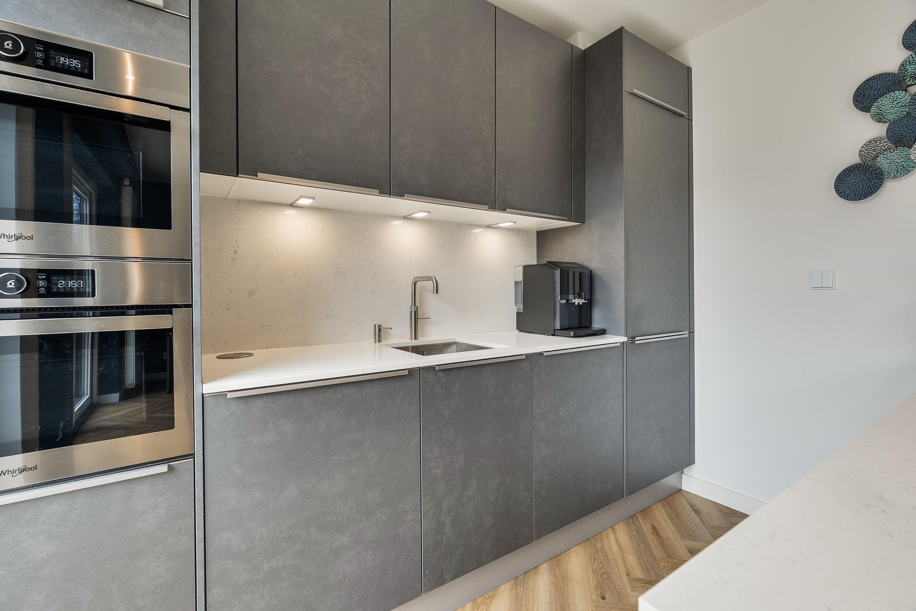 De open keuken (2021) is een echte blikvanger en nodigt uit om samen te koken, borrelen en tafelen. Het kookeiland met Bora kookplaat en eetbar met drie krukken (die gewoon achterblijven) maakt dit dé plek voor ontbijtjes, (t)huiswerkmomenten of een glas wijn terwijl het eten pruttelt. De keuken is compleet uitgerust met onder andere een Quooker, vaatwasser, koel/vriescombinatie en zelfs twee combi-ovens. De grijze fronten in combinatie met het lichte composiet werkblad in marmerlook geven een luxe, tijdloze uitstraling.