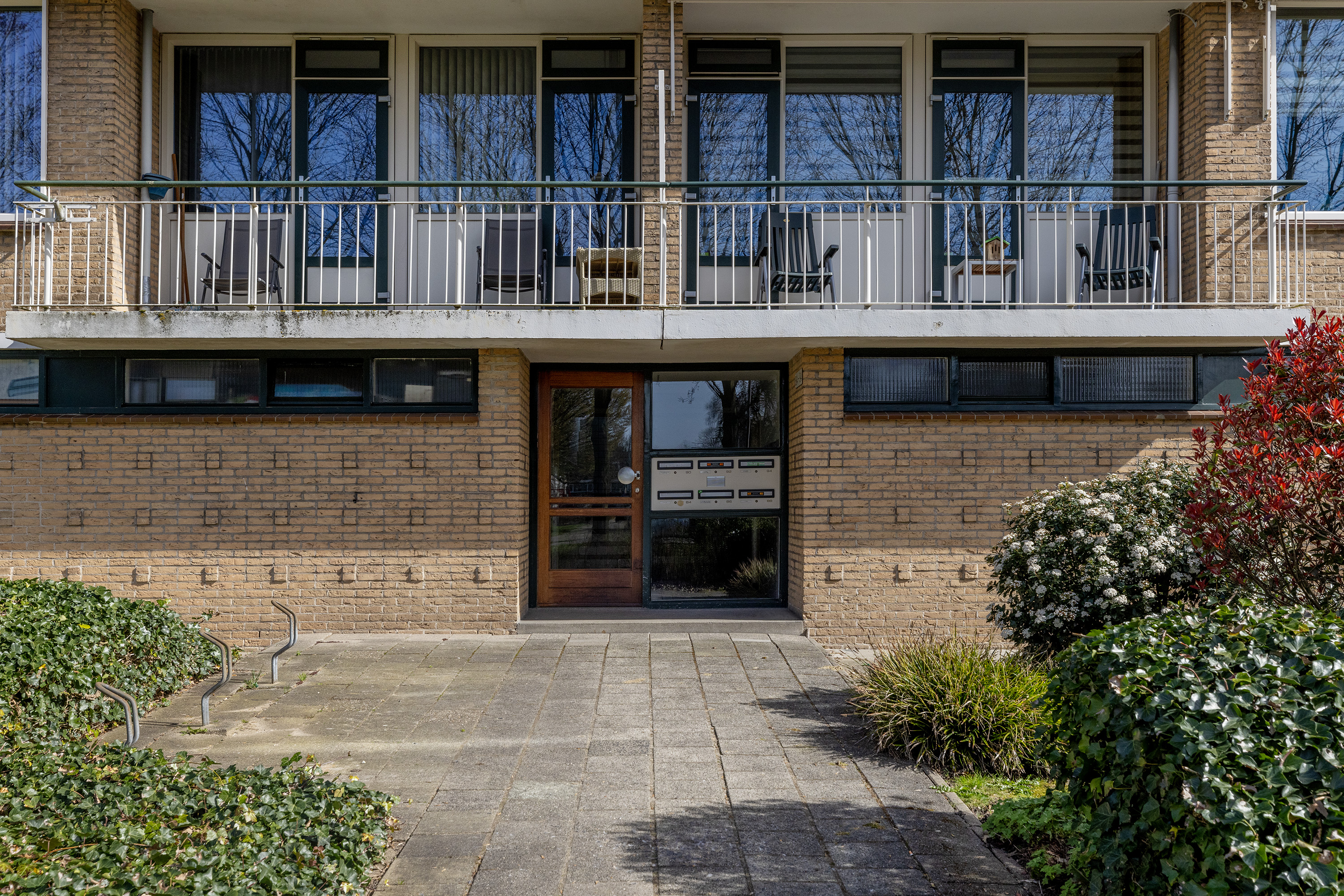 Afgesloten portiek met toegang tot het complex, trappenhuis en de eigen berging in de onderbouw, ideaal voor extra opslag, fietsen of seizoensspullen.