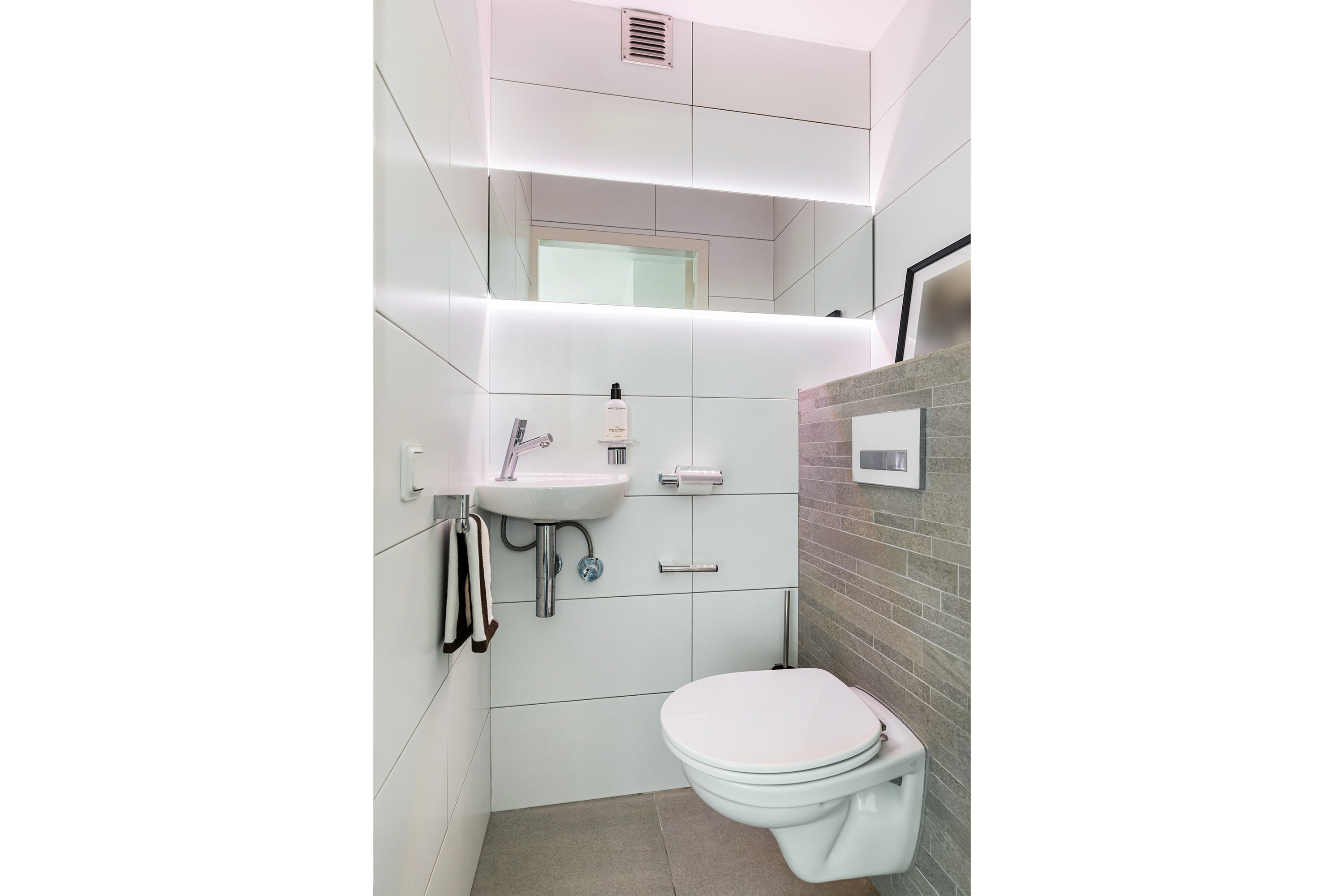 De moderne toiletruimte is stijlvol uitgevoerd met een wandcloset, fonteintje en eigentijdse betegeling. De brede spiegelwand met instelbare LED-verlichting zorgt voor een luxe hotelgevoel.