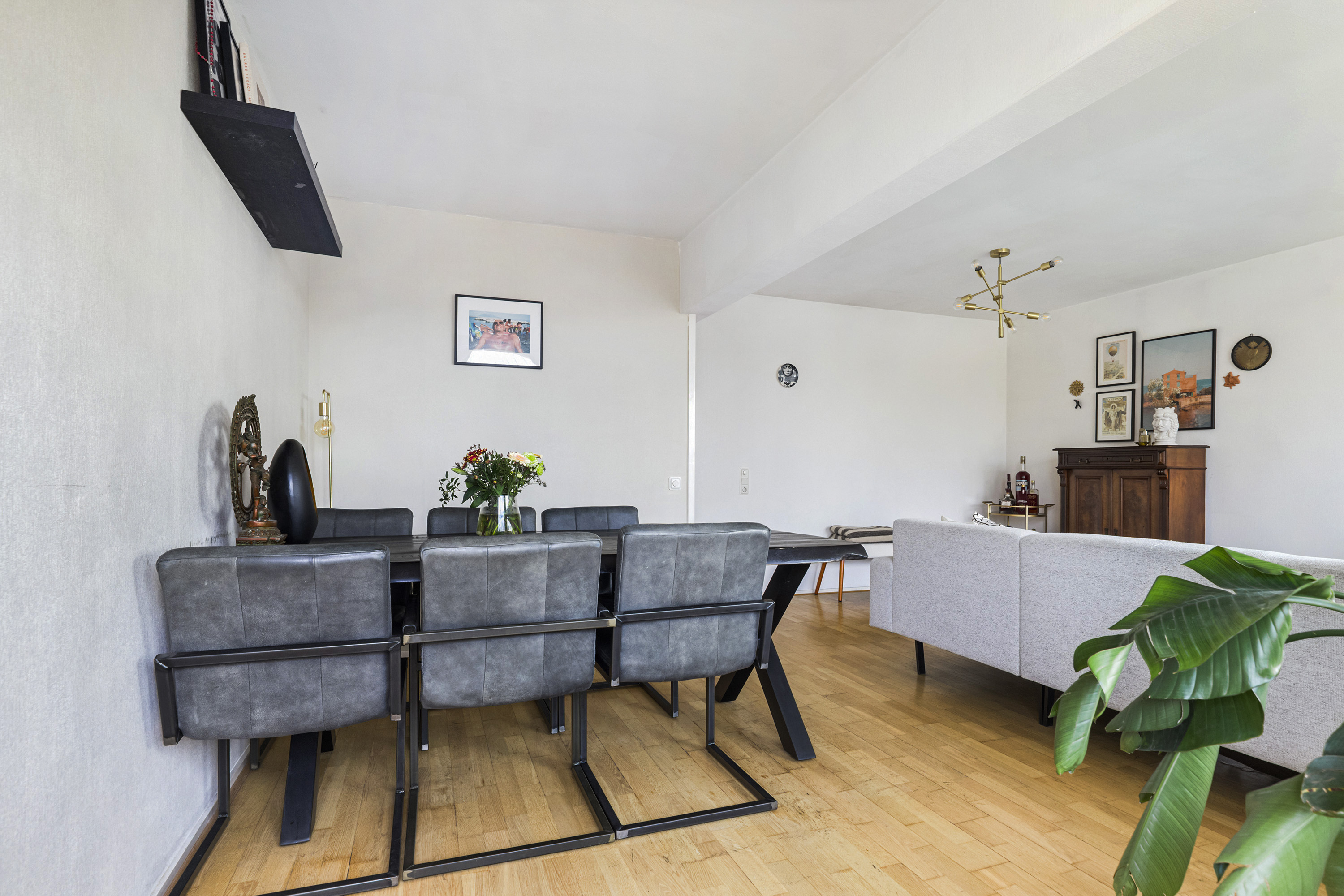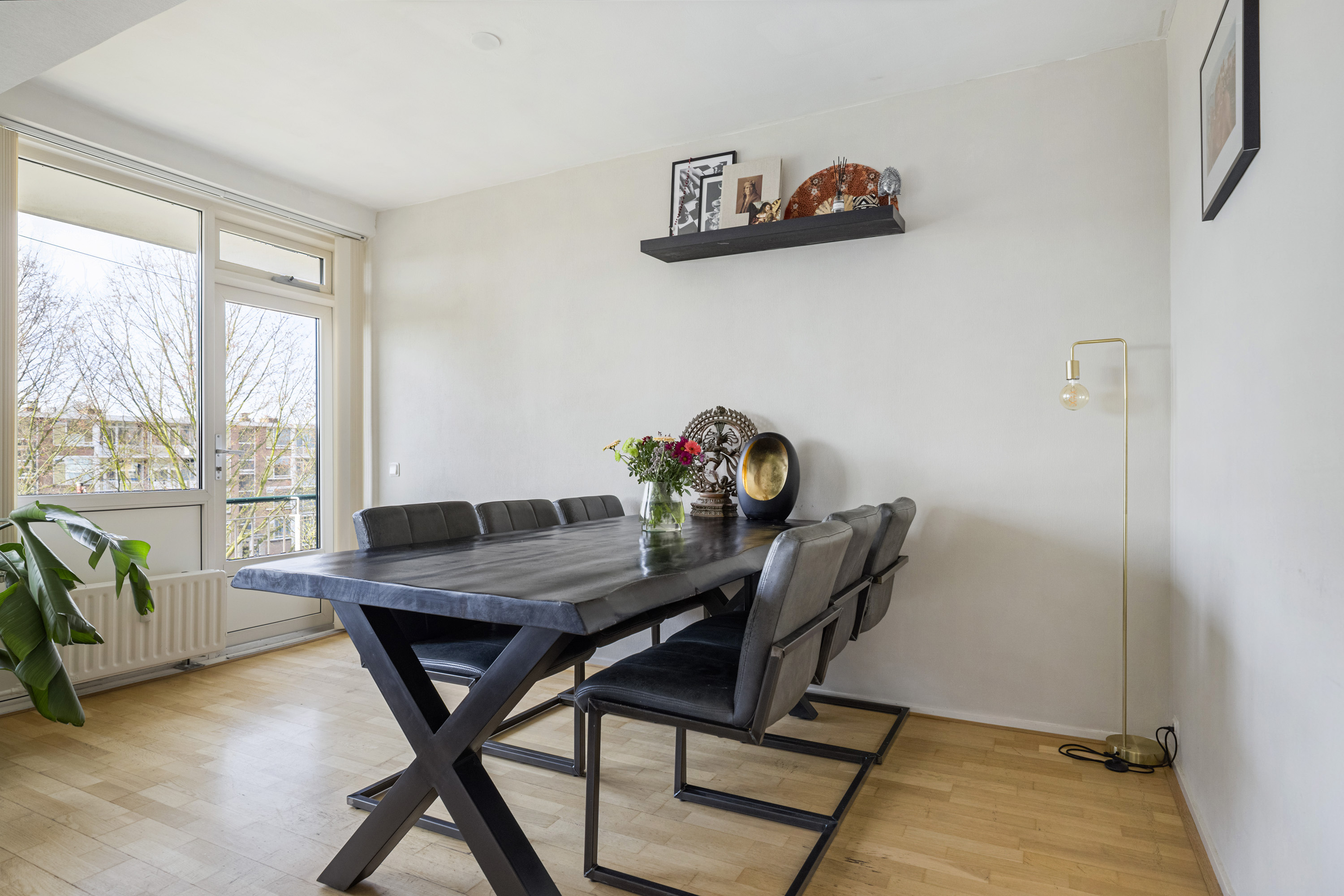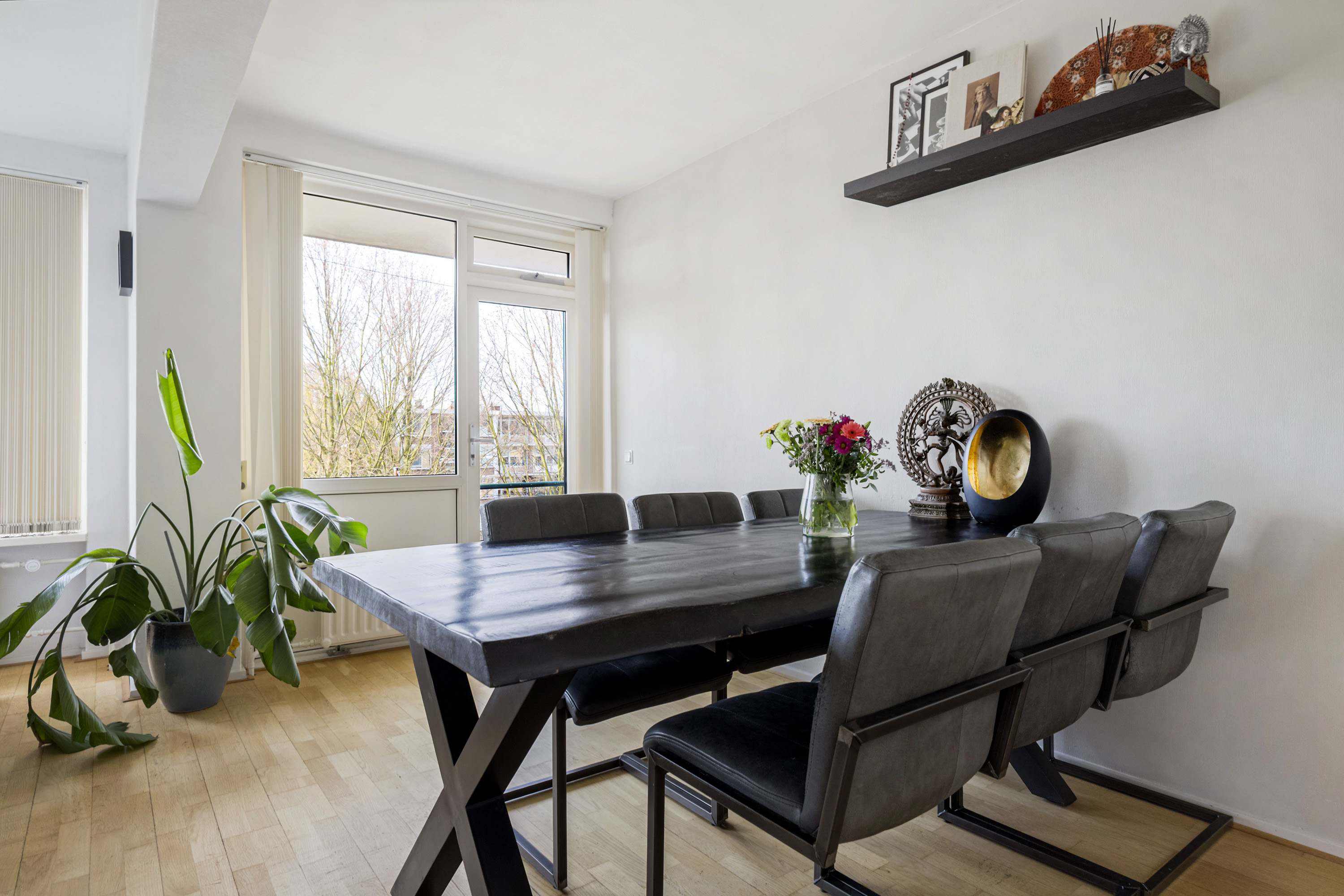 De woonkamer aan de voorzijde is ruim en licht, met een open verbinding naar de eetkamer. De houten vloer, strakke wandafwerking en het gestuukte plafond zorgen voor een warme en verzorgde uitstraling. De eetkamer biedt directe toegang tot het balkon aan de voorzijde en kan desgewenst eenvoudig worden omgevormd tot een derde slaapkamer.