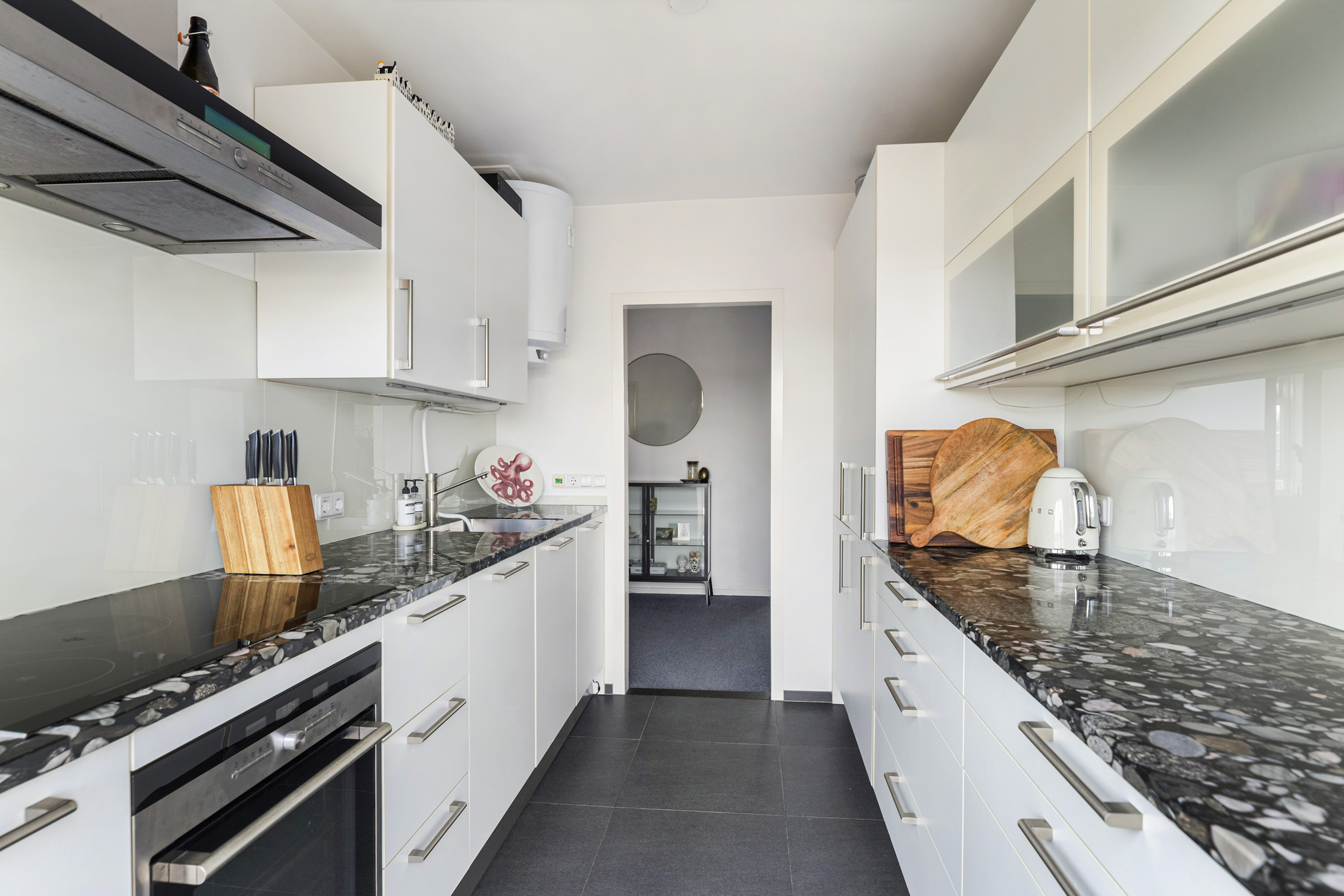 De keuken is modern en praktisch ingericht in een dubbele opstelling en voorzien van diverse Siemens-inbouwapparatuur, waaronder een 5-pits inductiekookplaat, combi-oven, vaatwasser en koel-vriescombinatie. Ook is hier de aansluiting van de wasmachine en is deze netjes weggewerkt in de keuken. De aanwezigheid van vloerverwarming maakt het hier extra comfortabel. Vanuit de keuken heb je toegang tot het tweede balkon aan de achterzijde, gelegen op het noordoosten.