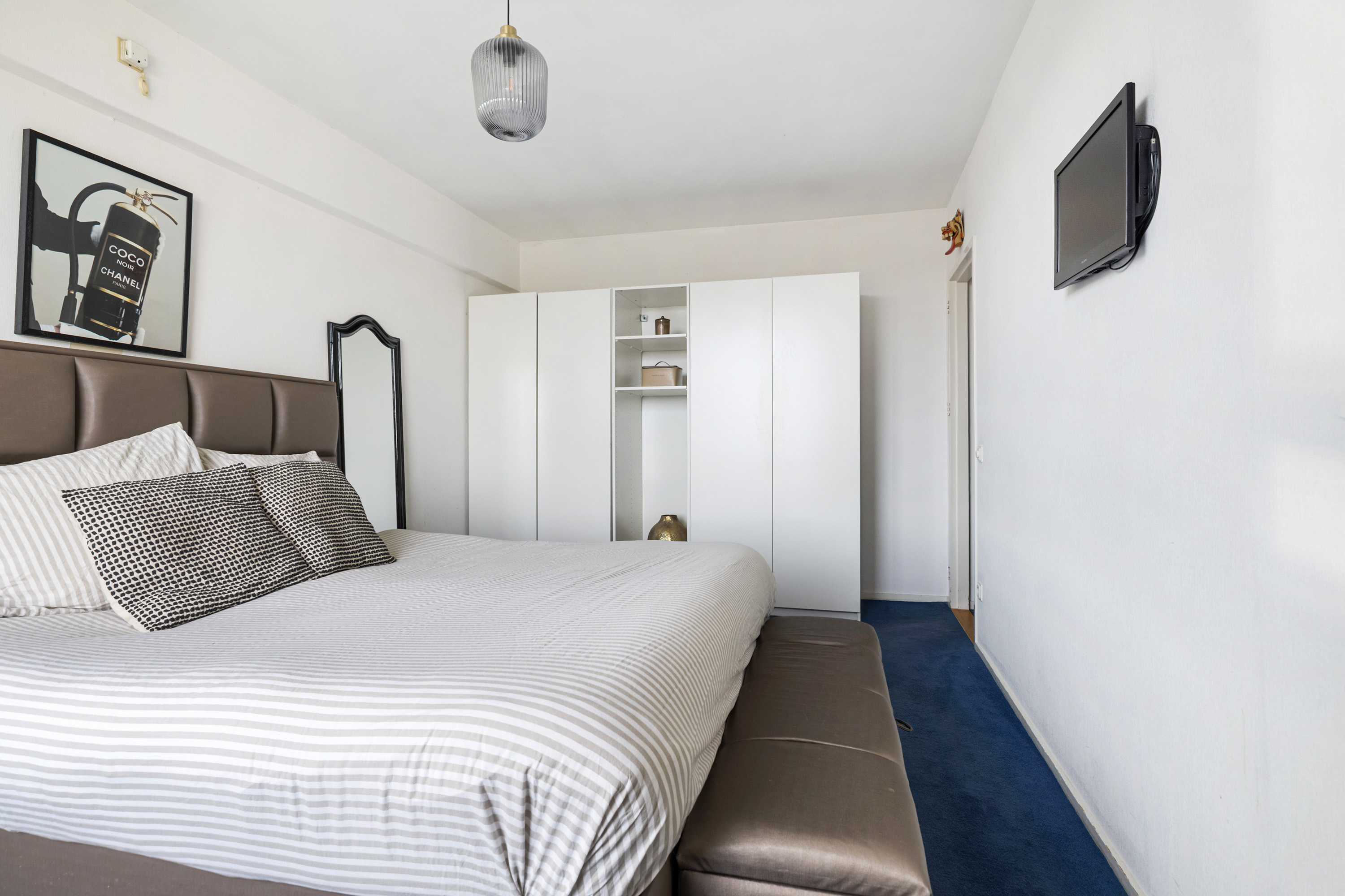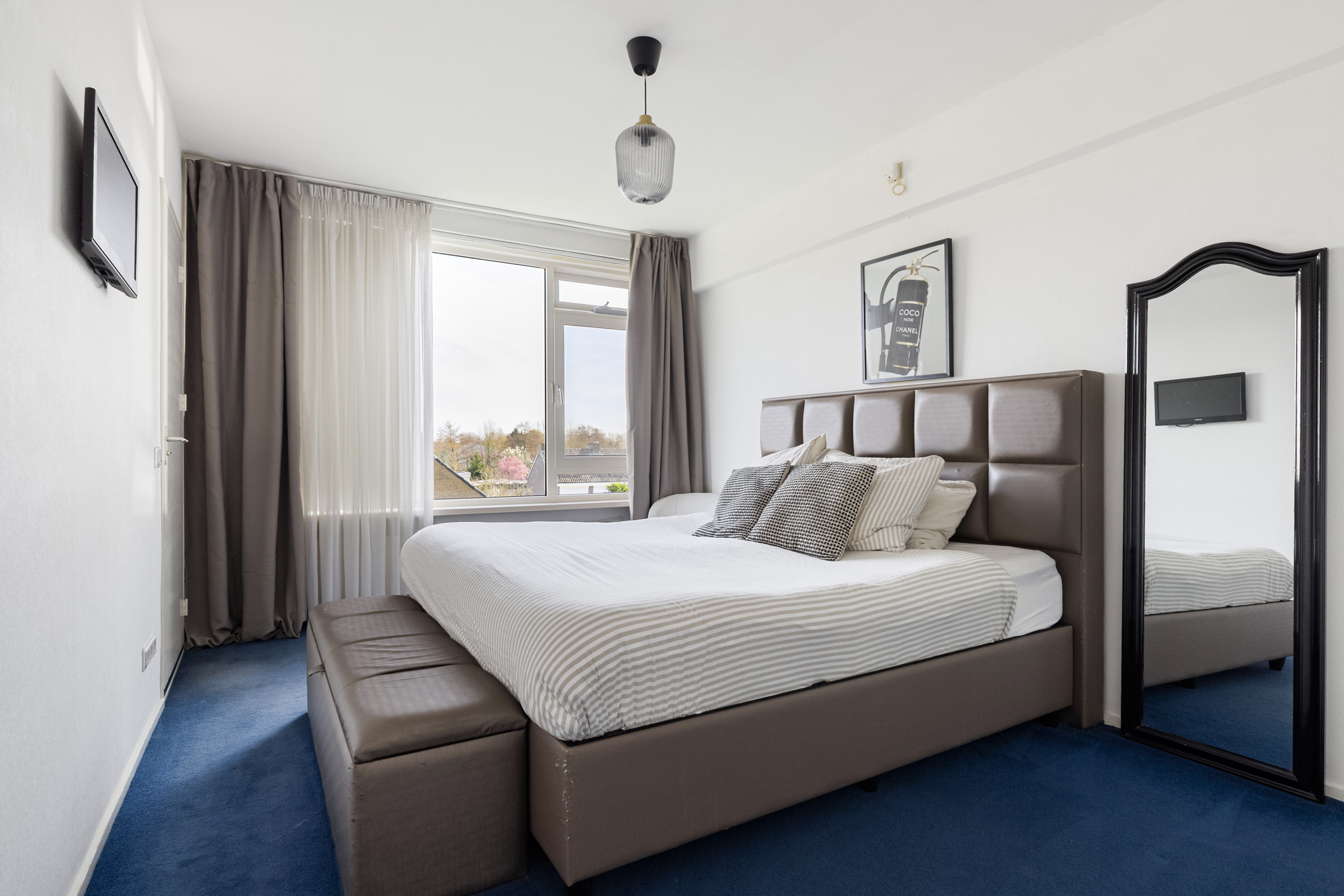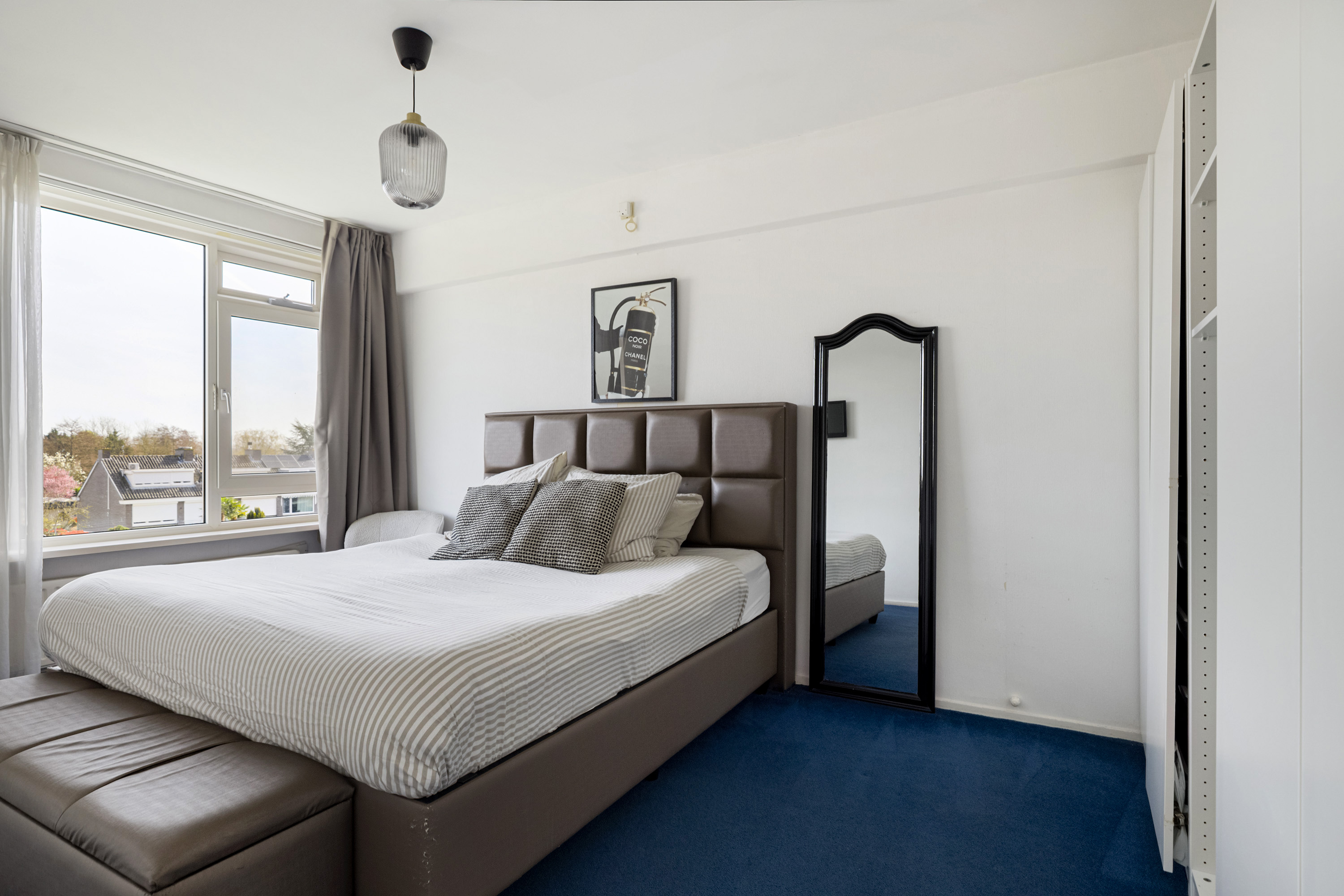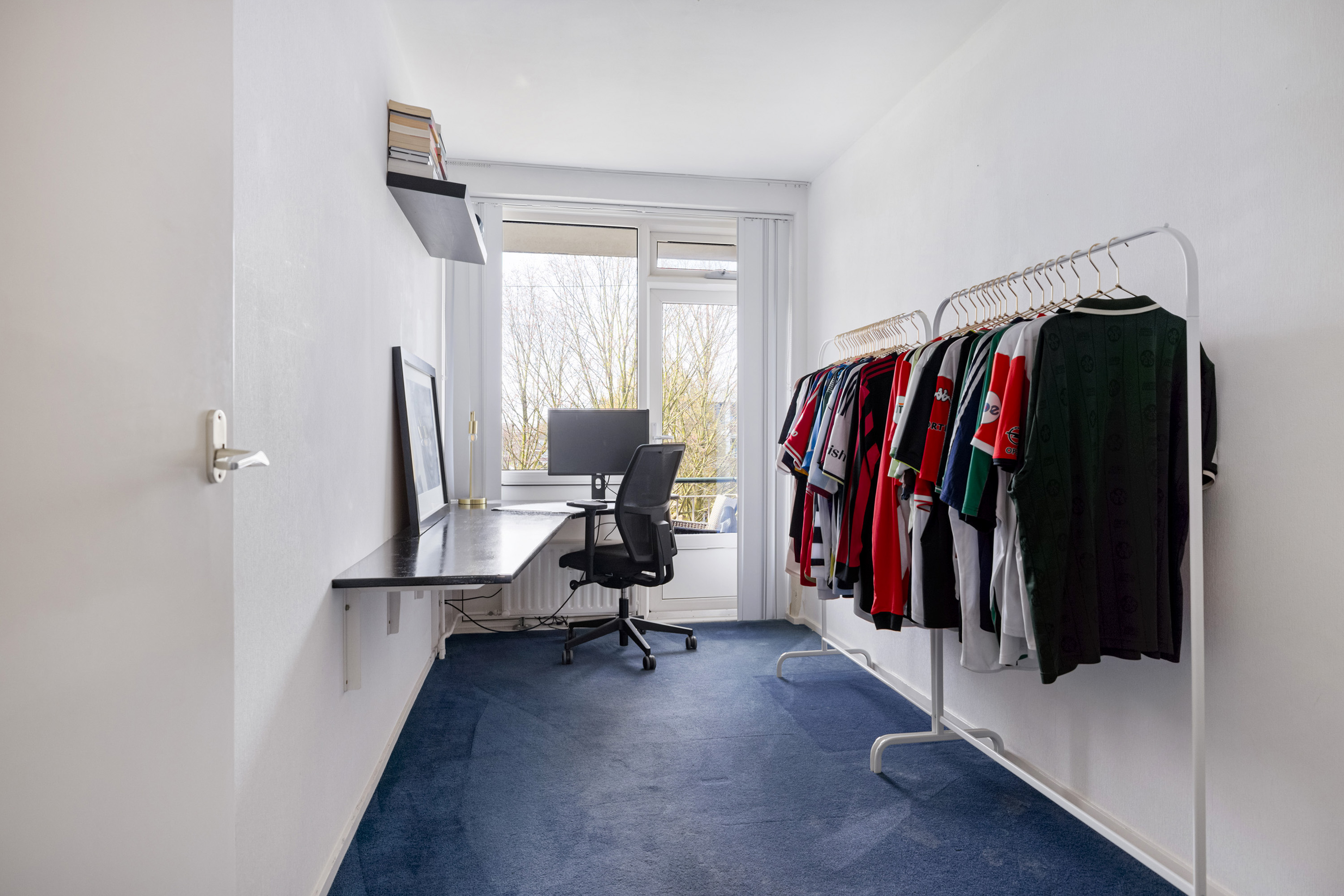 De tweede slaapkamer ligt aan de voorzijde en biedt eveneens toegang tot het zonnige balkon. Ideaal als logeerkamer, werkkamer of kinderkamer.