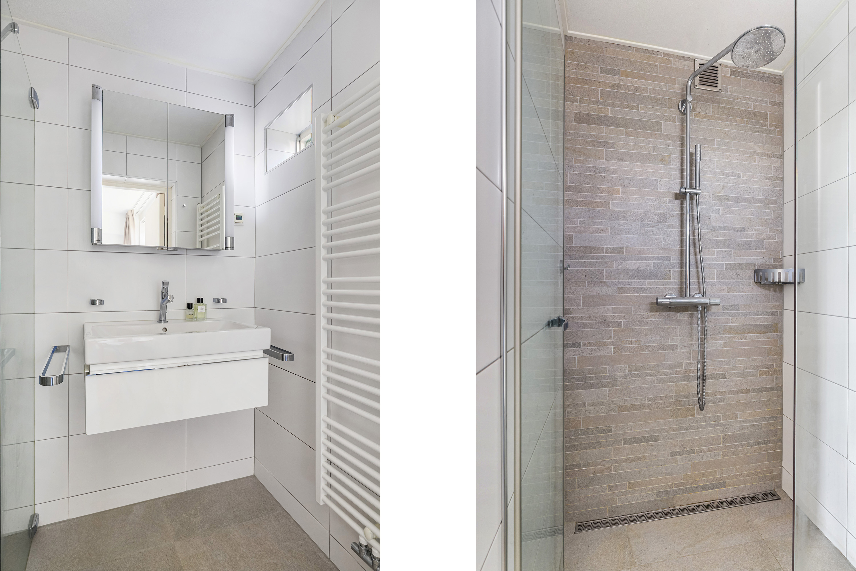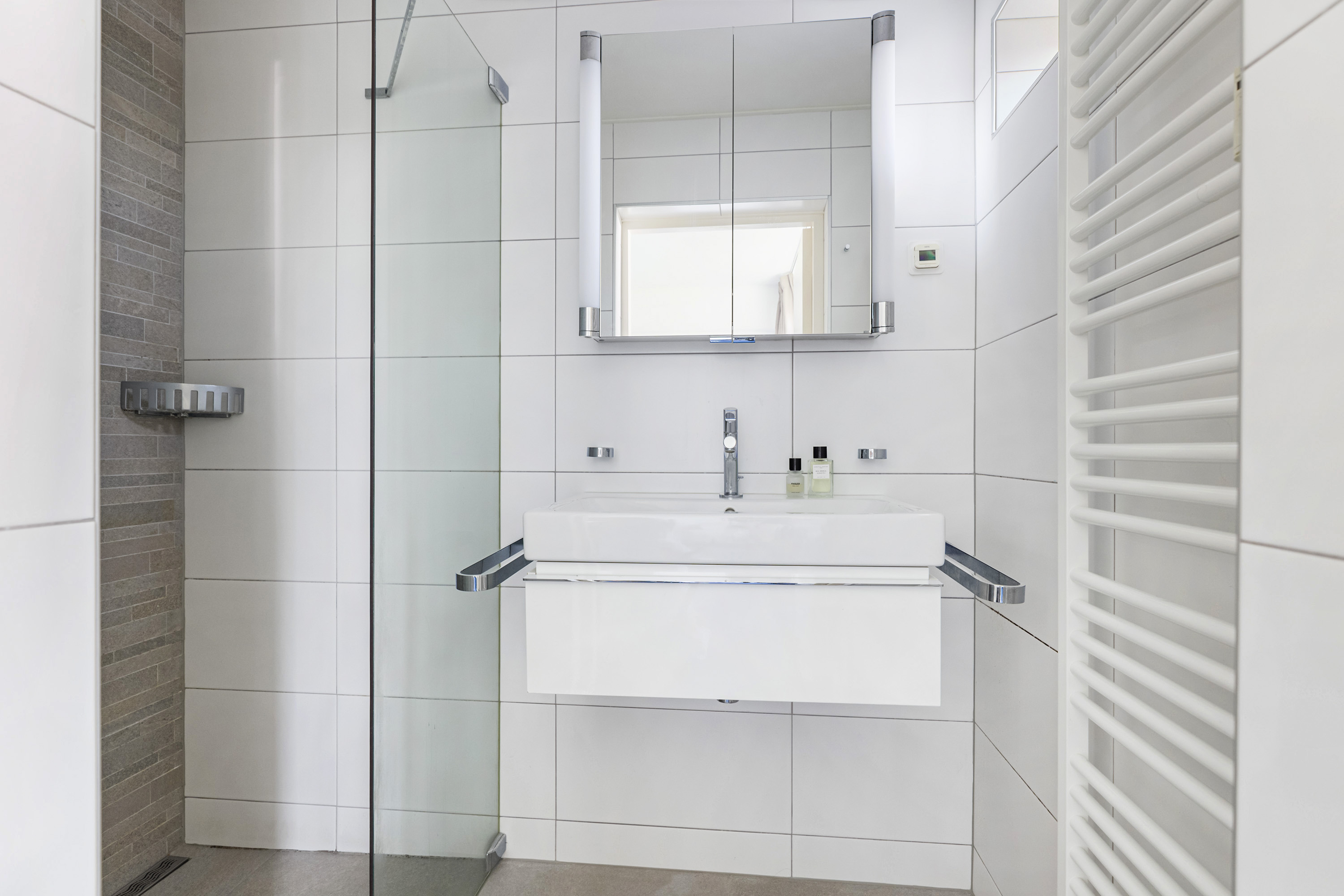 Aan de achterzijde bevindt zich de hoofdslaapkamer, rustig gelegen en voorzien van directe toegang tot de badkamer. Deze badkamer is modern afgewerkt en uitgerust met een inloopdouche met regendouche, een wastafelmeubel, designradiator en vloerverwarming, een fijne plek om de dag ontspannen te beginnen of af te sluiten.