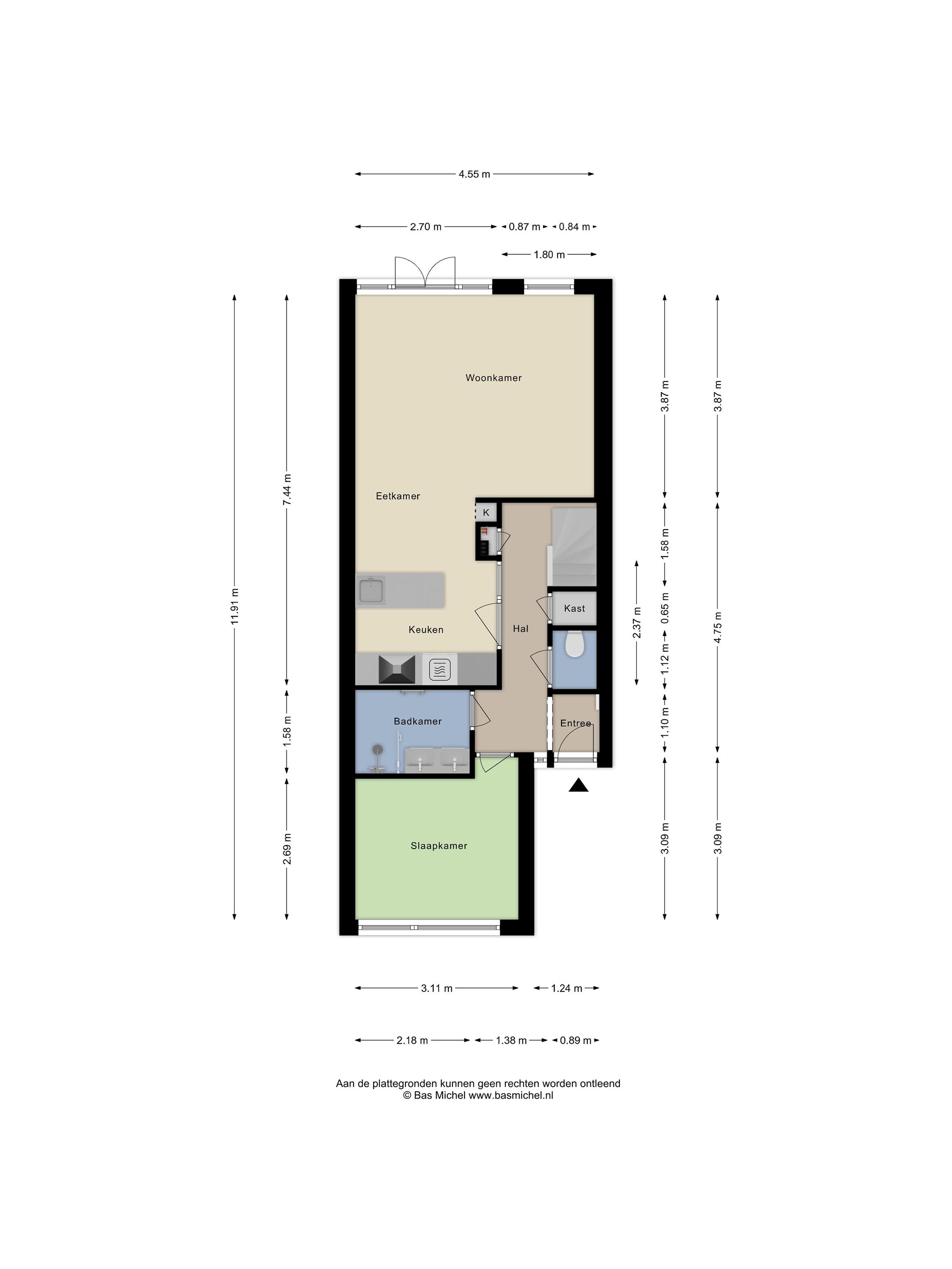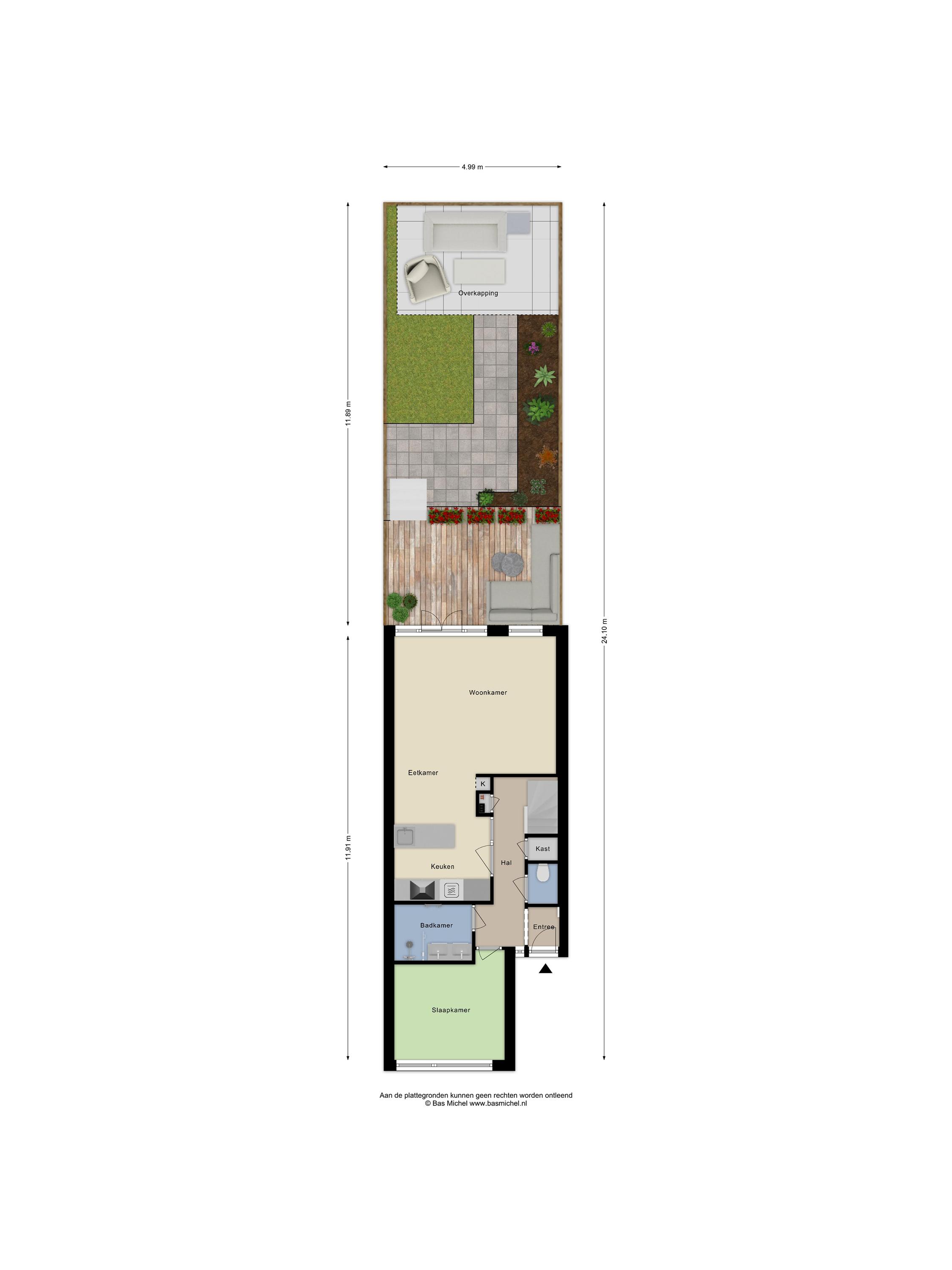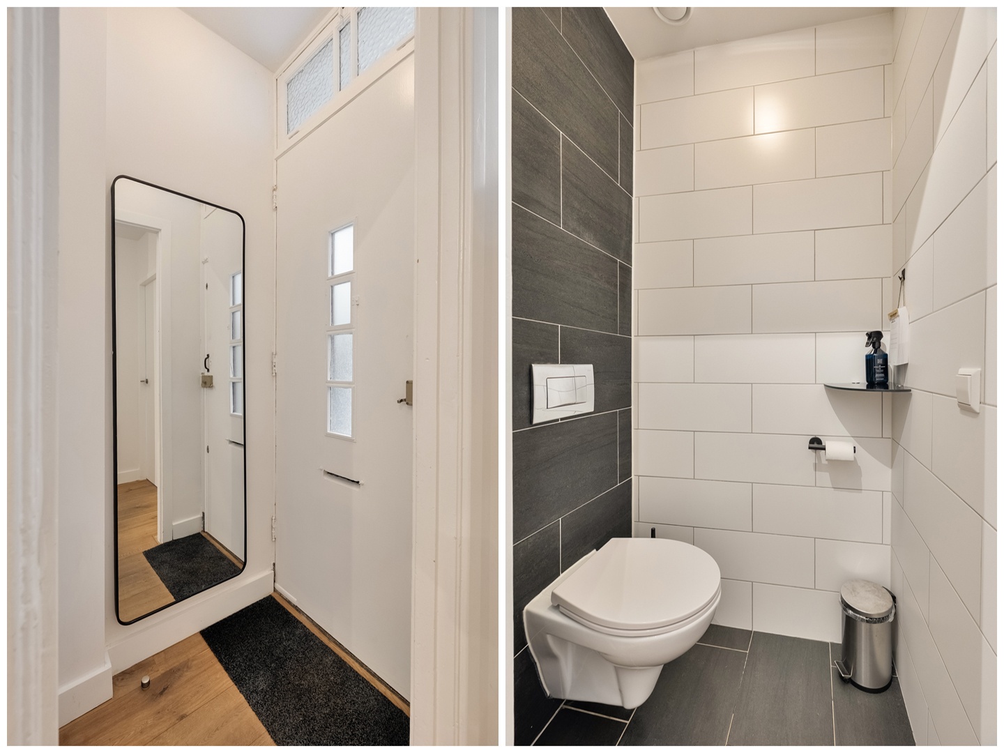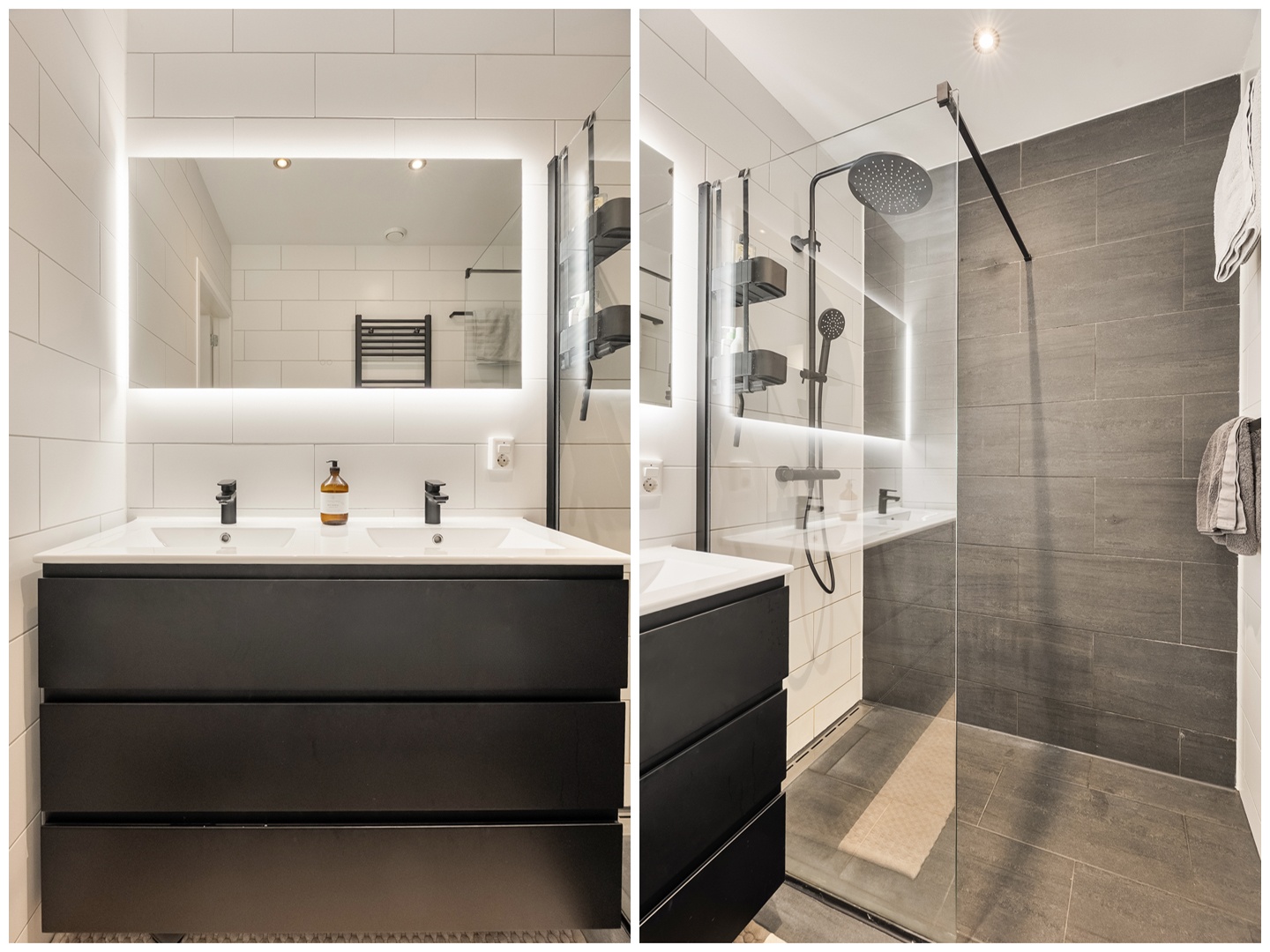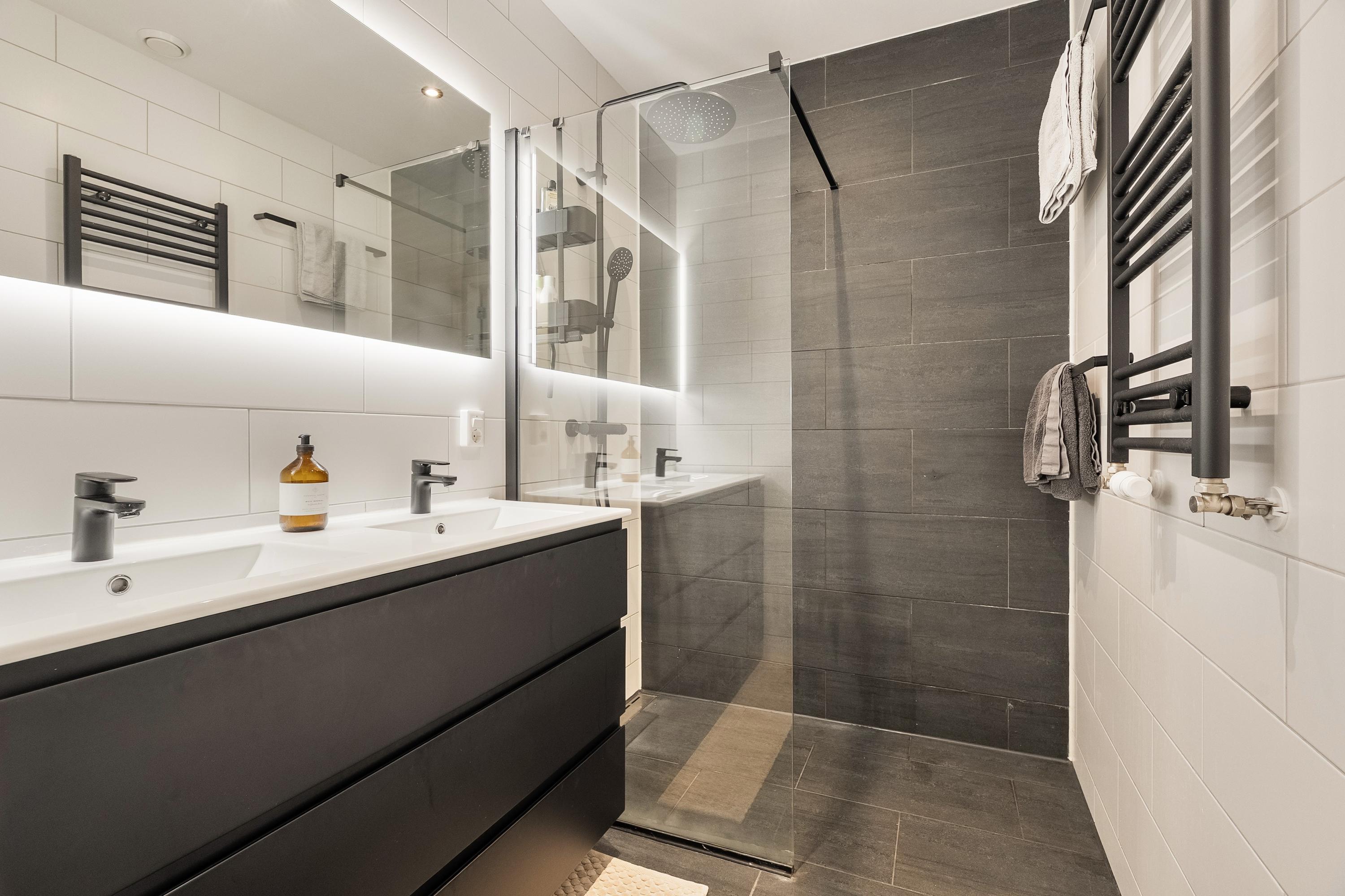 Terug op de begane grond treffen we de badkamer, die zich bevindt tussen de voorkamer en de woonkamer. Deze is voorzien van een moderne inloopdouche, wastafel en designradiator. Strak en functioneel. In de hal treffen we het separate toilet, de meterkast en een aparte kast voor je jas.