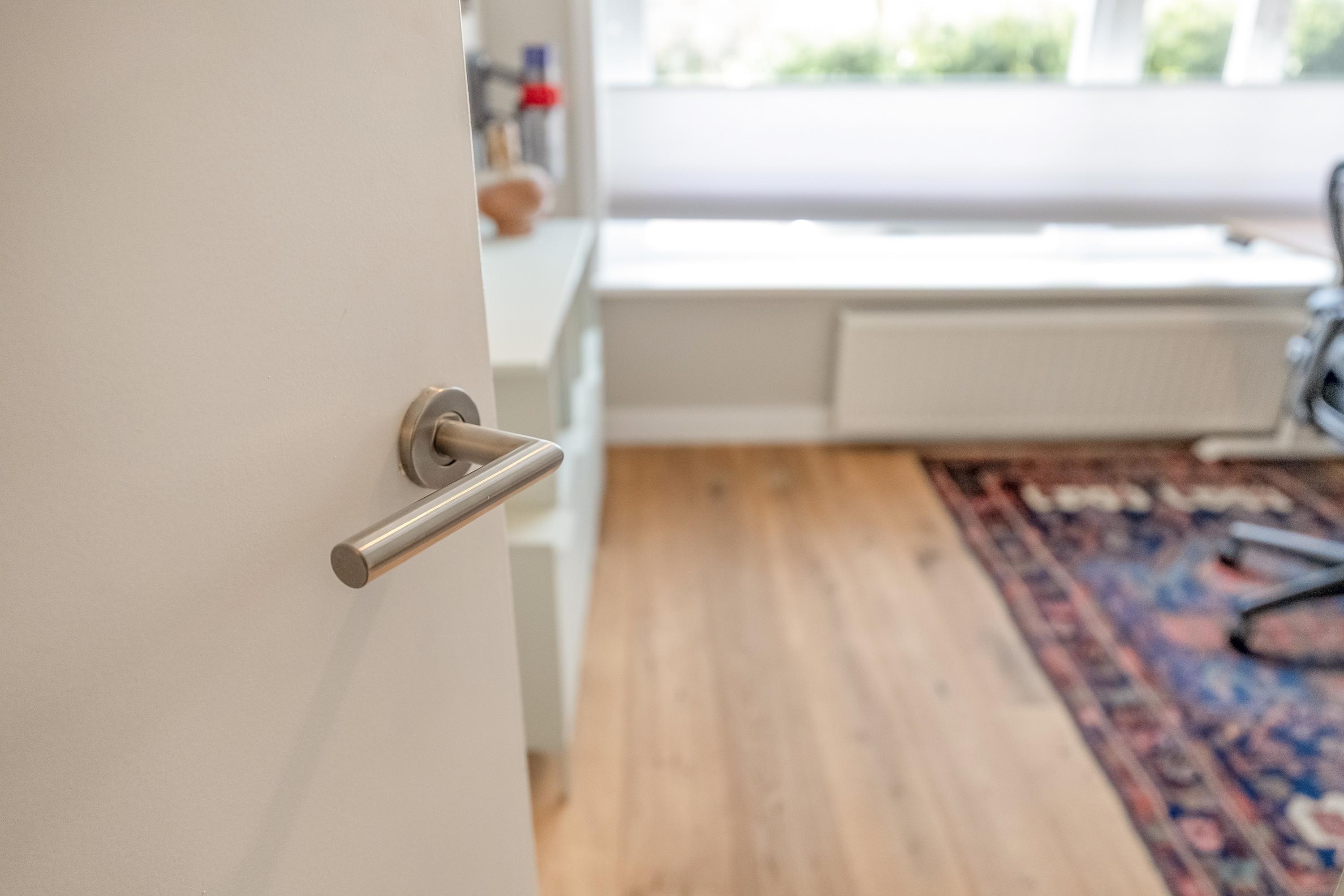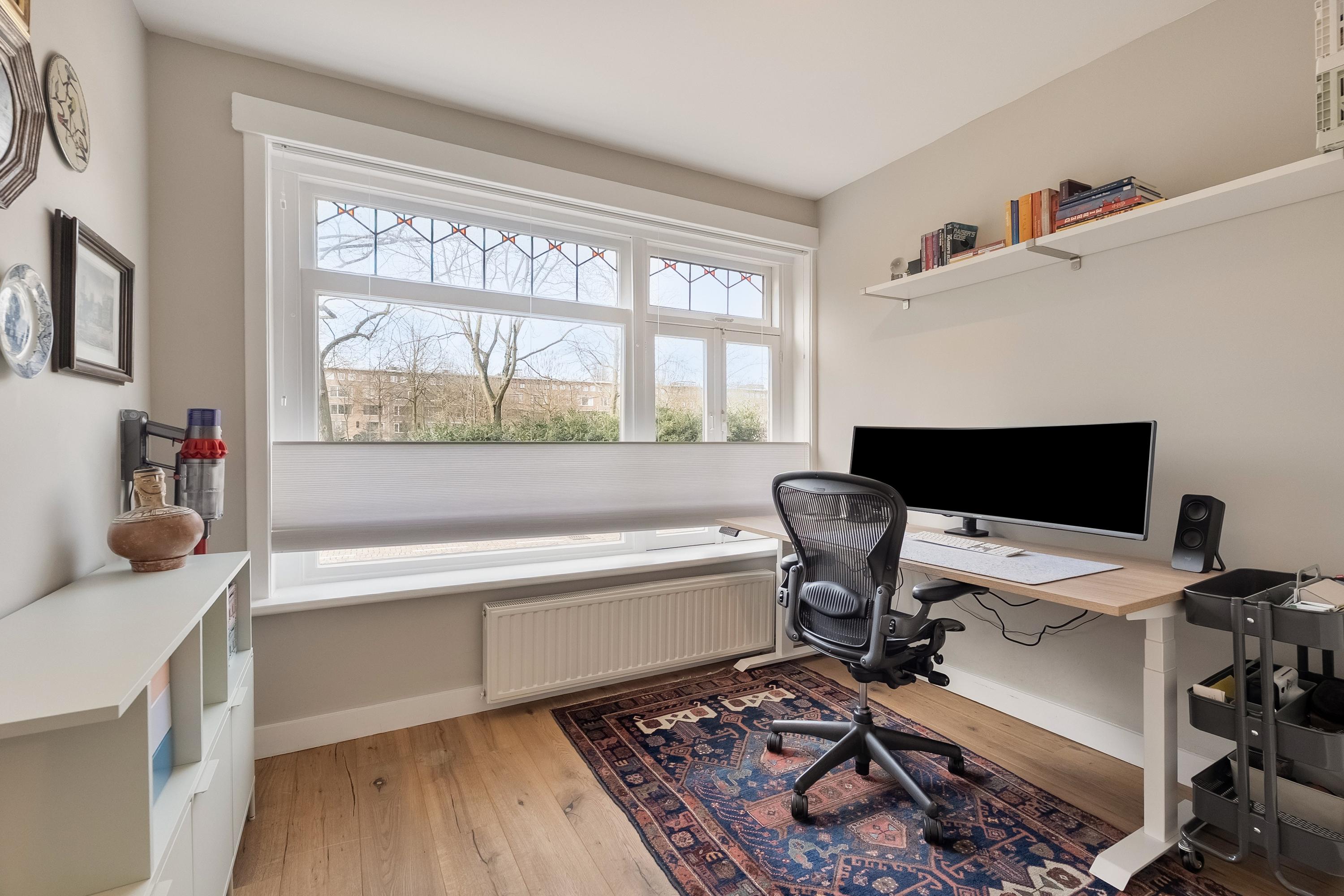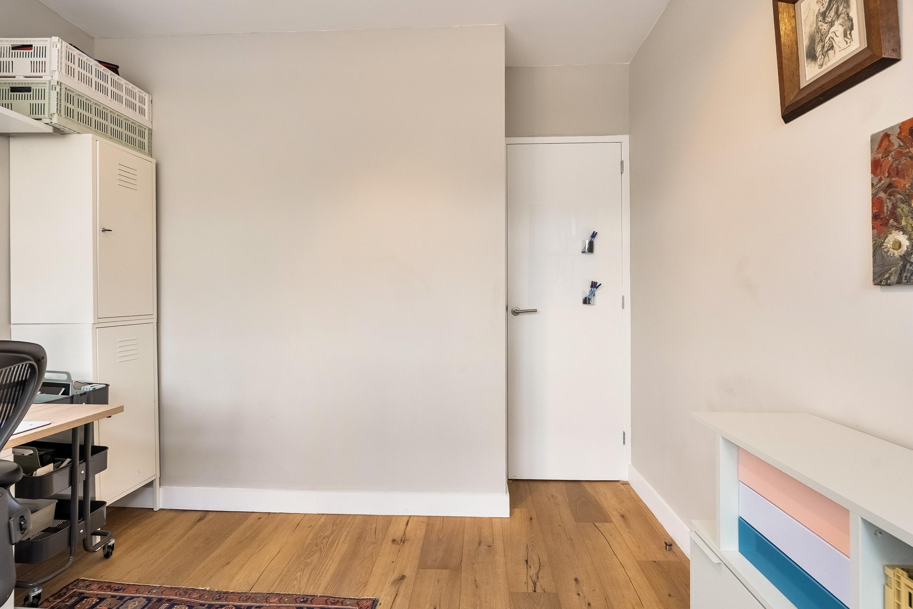 Als je binnenkomt, loop je gelijk even de voorkamer in waar je je werktas neerzet — die komt later wel weer. De voorkamer is een ruime kamer van 9 m², de perfecte slaap-/werkkamer. Heel fijn: de woonverdieping ligt een paar treden hoger dan straatniveau, wat een mooi uitzicht geeft over het groen en waardoor je geen directe inkijk hebt.