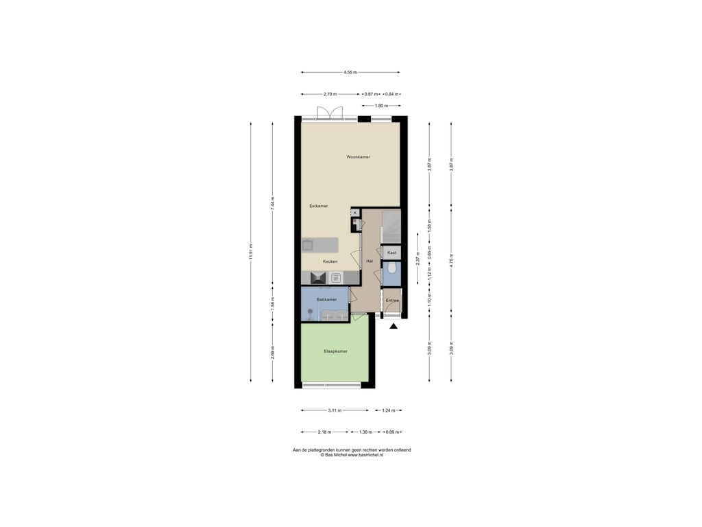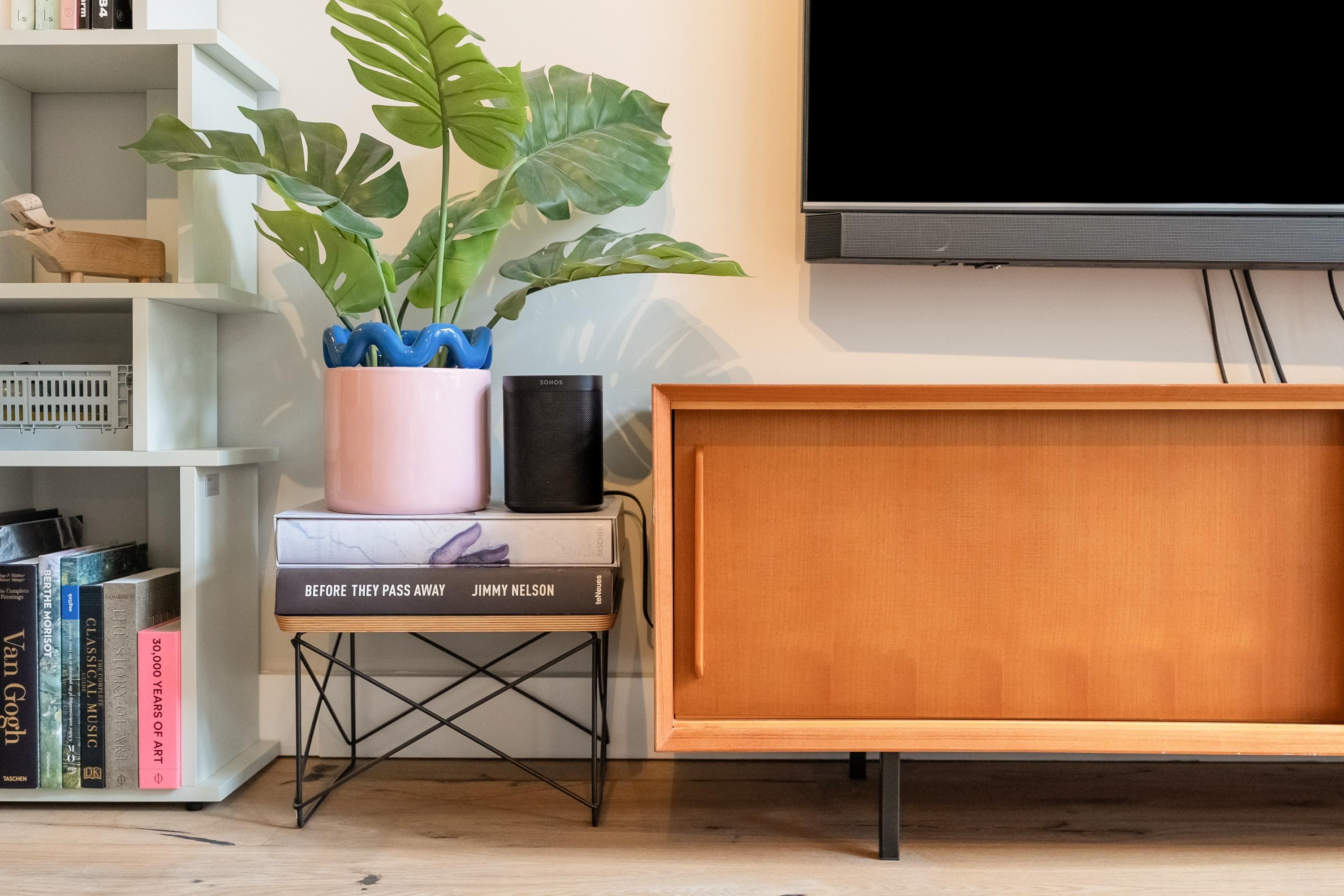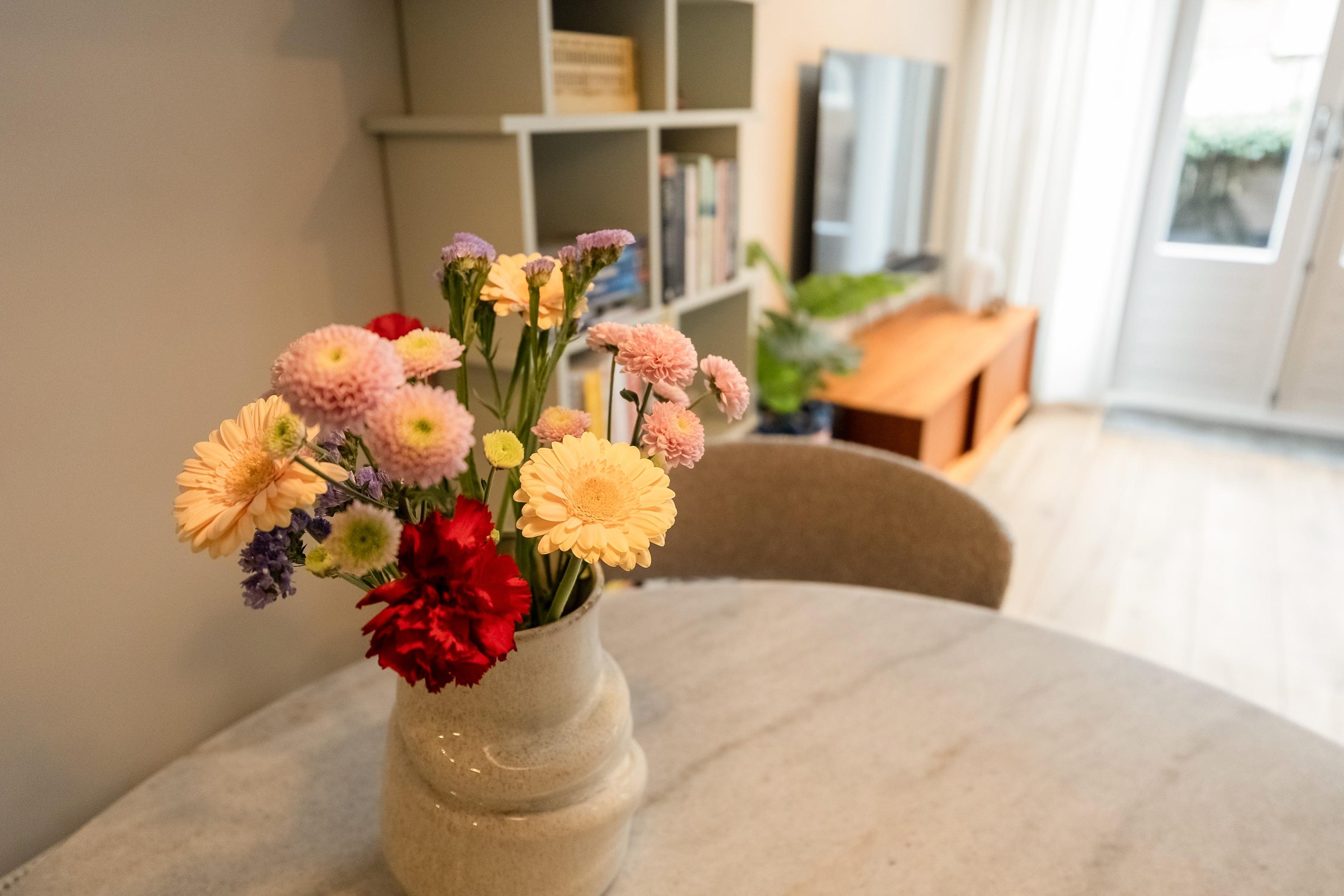 Als je binnenkomt, loop je gelijk even de voorkamer in waar je je werktas neerzet — die komt later wel weer. De voorkamer is een ruime kamer van 9 m², de perfecte slaap-/werkkamer. Heel fijn: de woonverdieping ligt een paar treden hoger dan straatniveau, wat een mooi uitzicht geeft over het groen en waardoor je geen directe inkijk hebt.