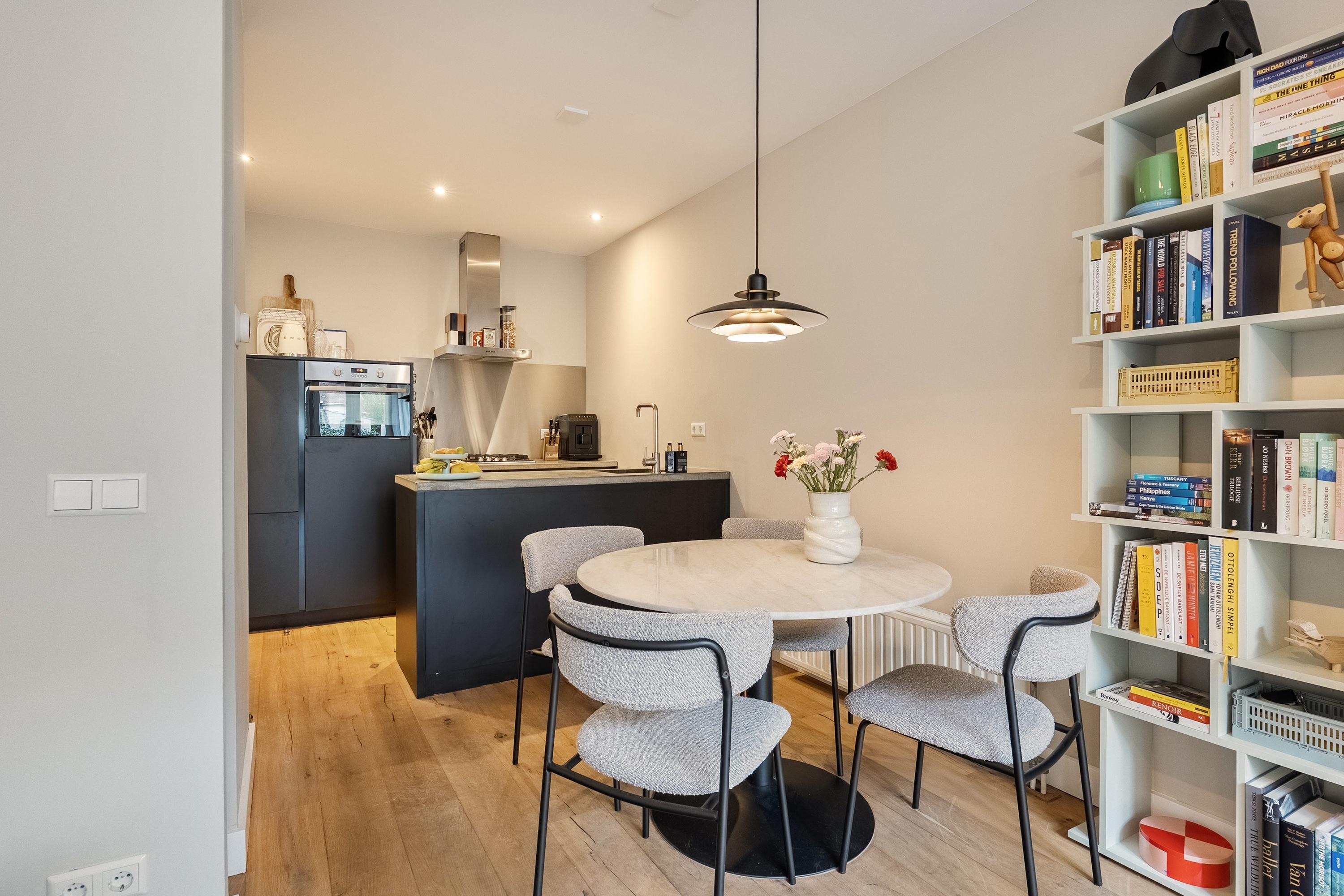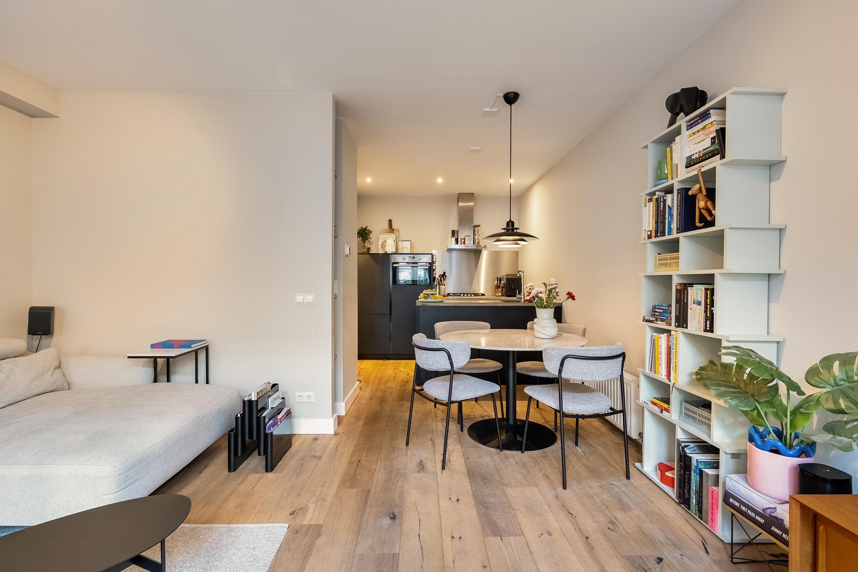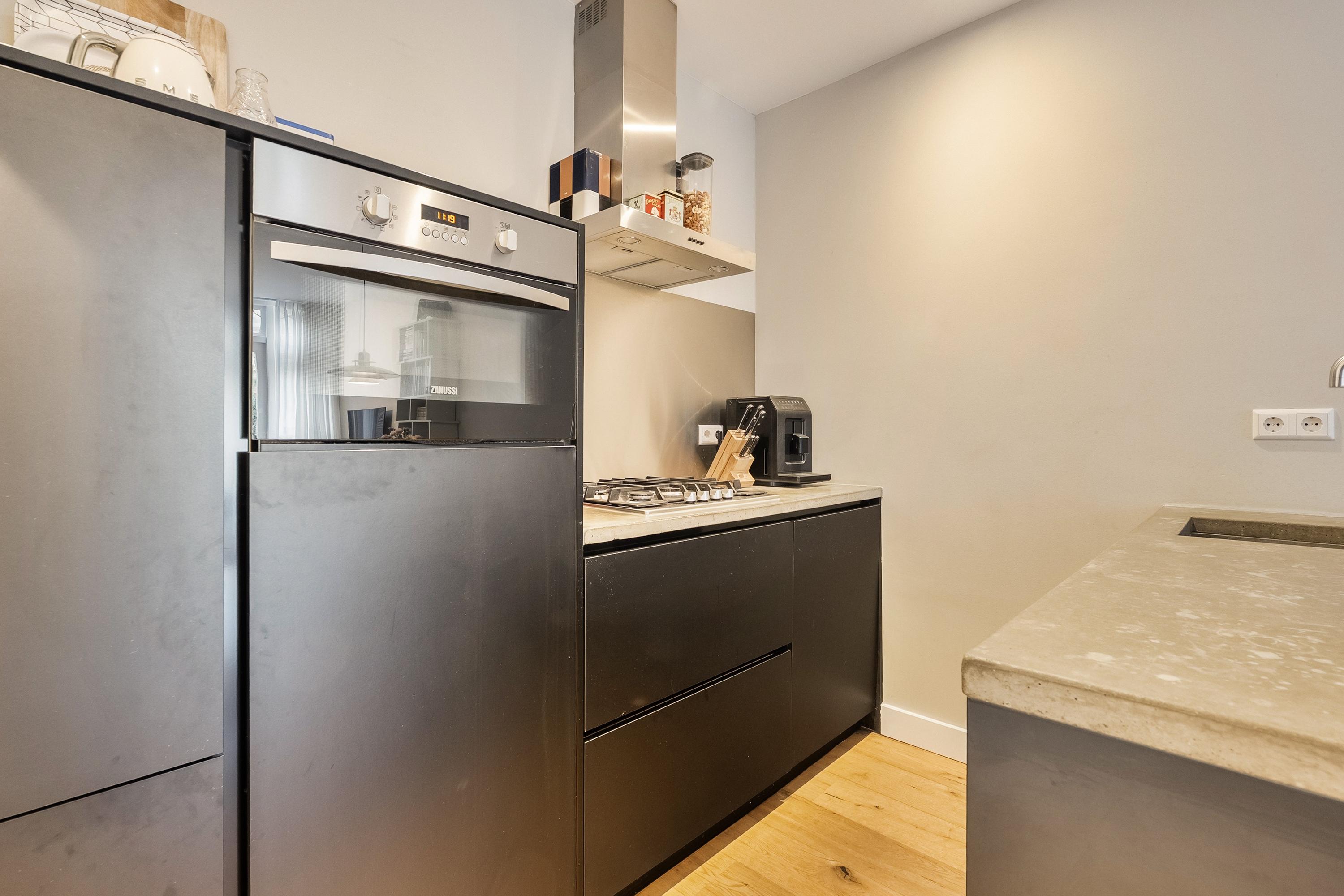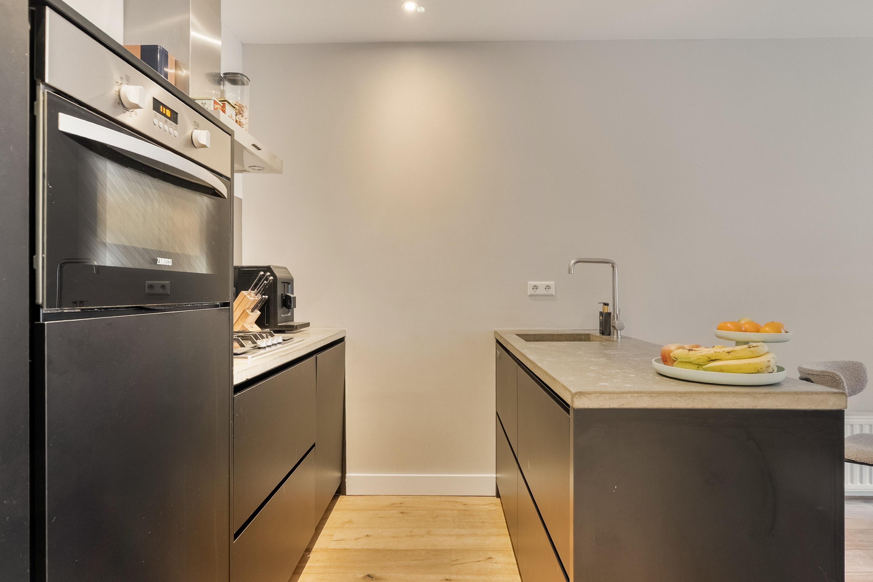 Als je de woonkamer binnenstapt, sta je direct in de open keuken, heel tof weggewerkt in de ruimte. Dat komt ongetwijfeld door het materiaalgebruik, zoals het betonnen aanrechtblad. De keuken is uitgerust met diverse inbouwapparatuur, waaronder een vaatwasser, koelkast, 4-pits gasfornuis met RVS afzuigkap, oven en een spoeleiland. In de vele laden kun je veel spullen kwijt en op het aanrechtblad is voldoende ruimte voor je koffiemachine en waterkoker.