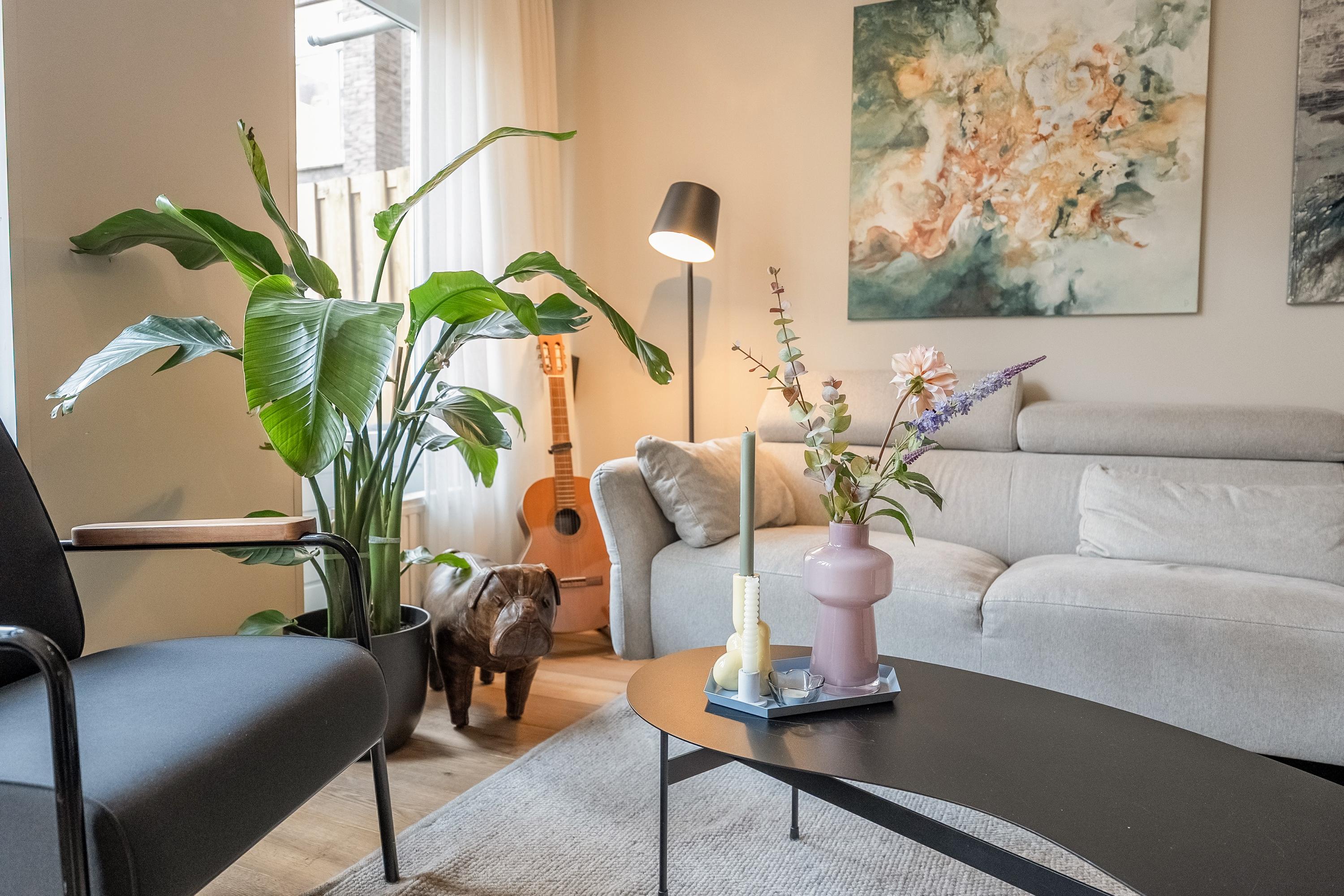 Terug in de hal lopen we aan de achterzijde de woonkamer in. Er hangt een hele fijne sfeer en de verbinding met buiten valt direct op. Het is voorjaar, dus de deuren staan weer lekker open!