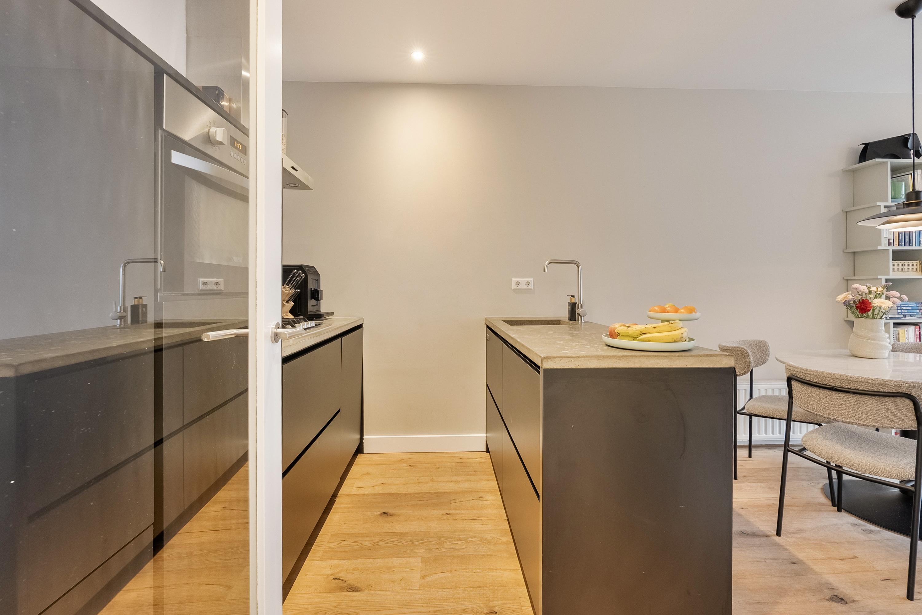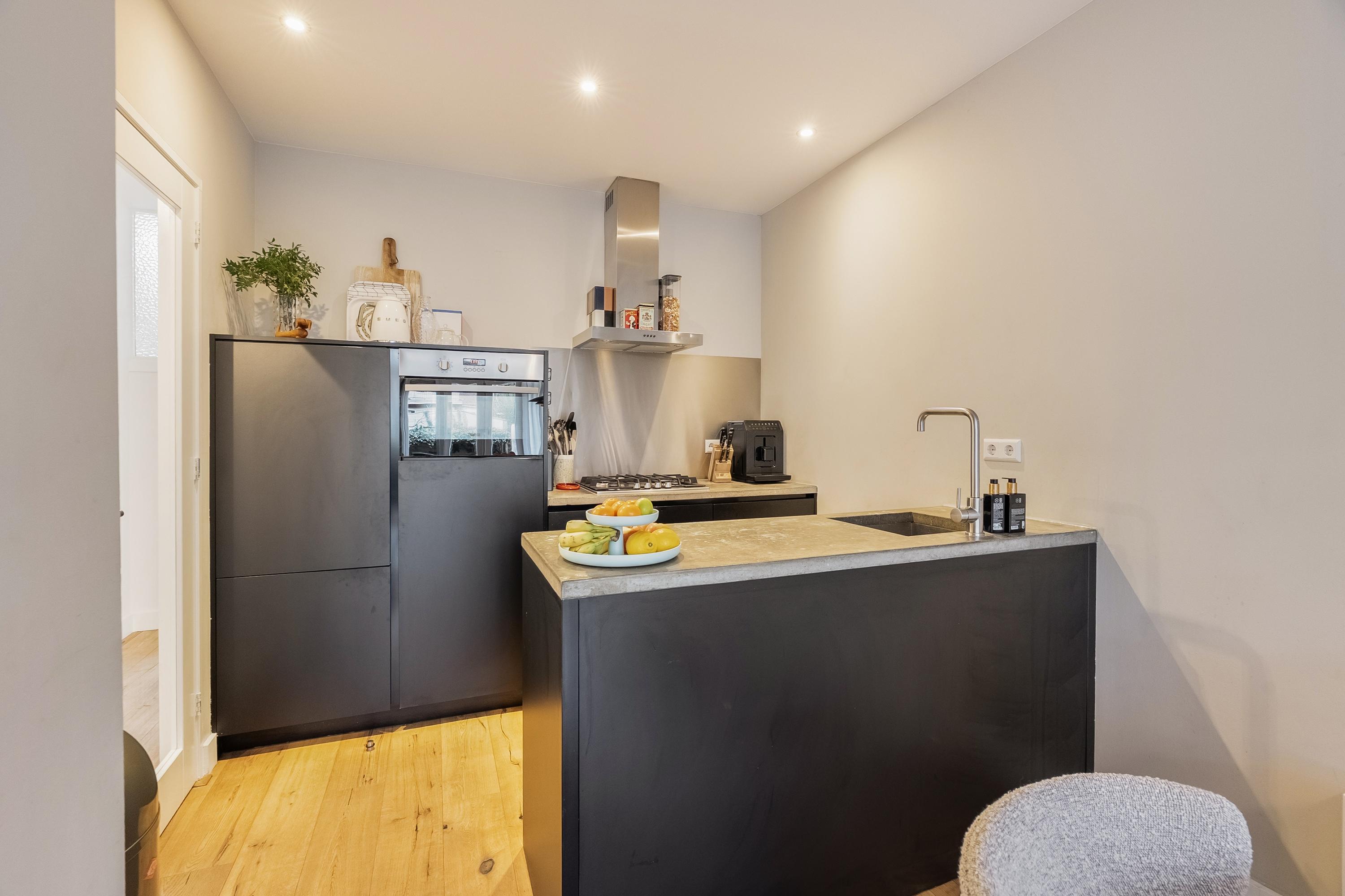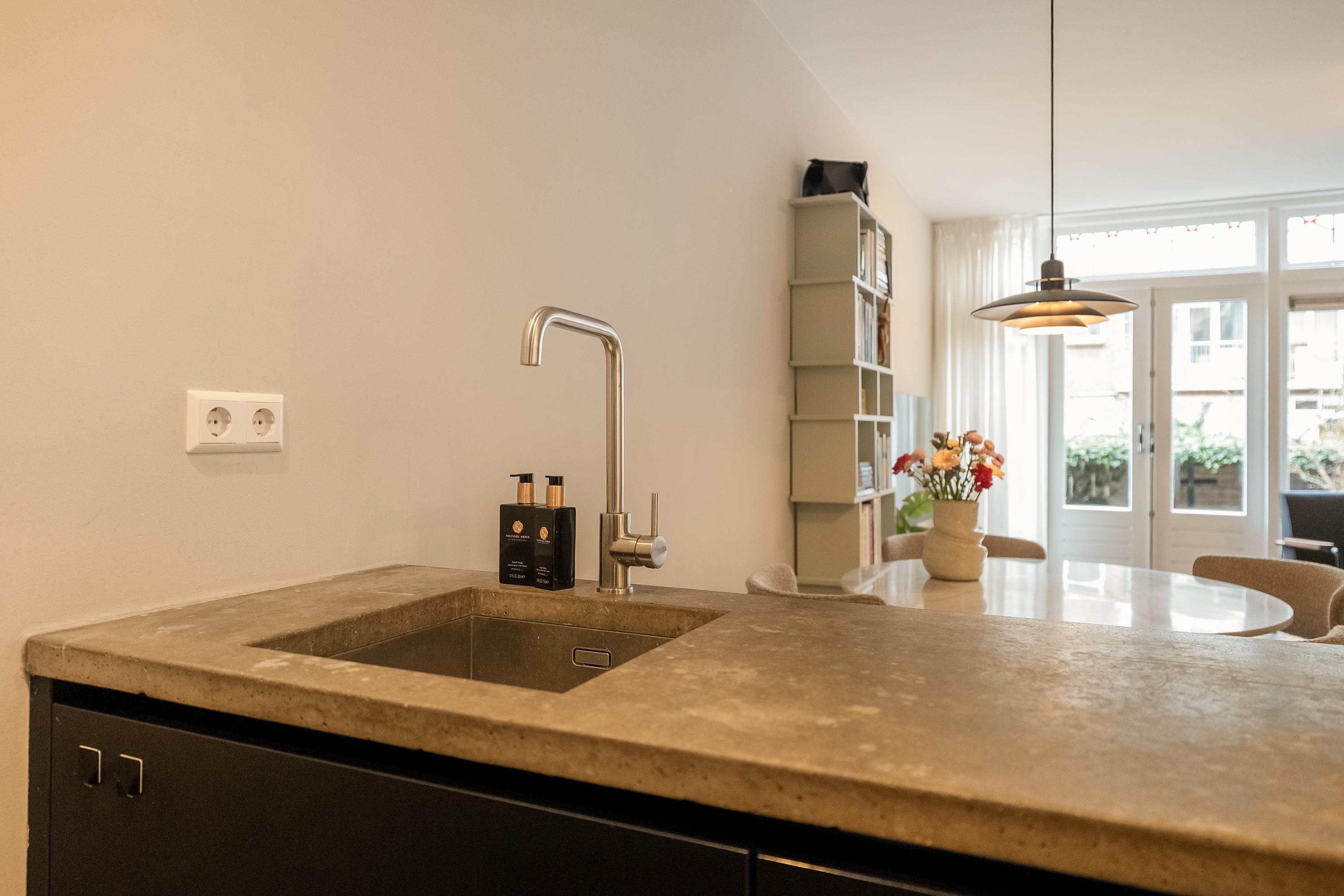 - Open keuken met diverse inbouwapparatuur, betonnen aanrechtblad