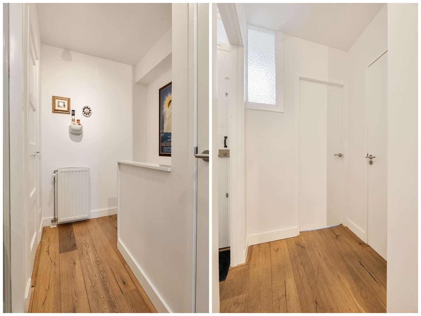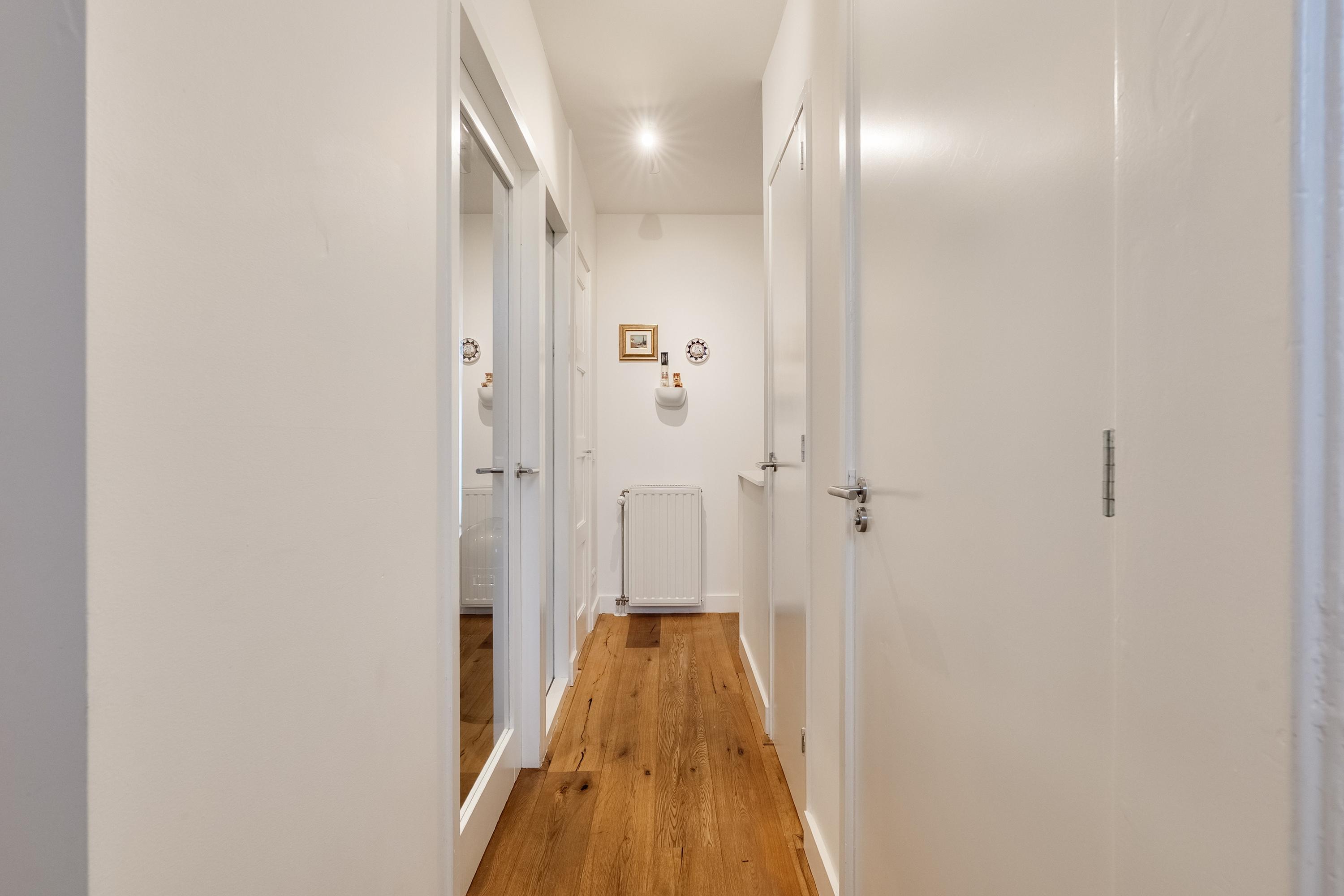 In het open portiek stappen we achter de voordeur de hal in, waar je je jas ophangt. Via de hal heb je toegang tot alle kamers van het appartement.