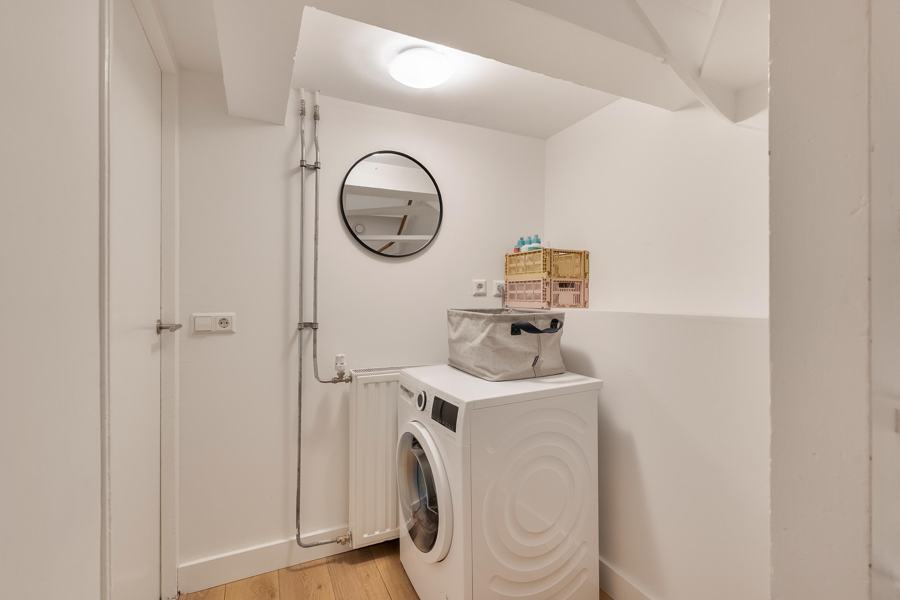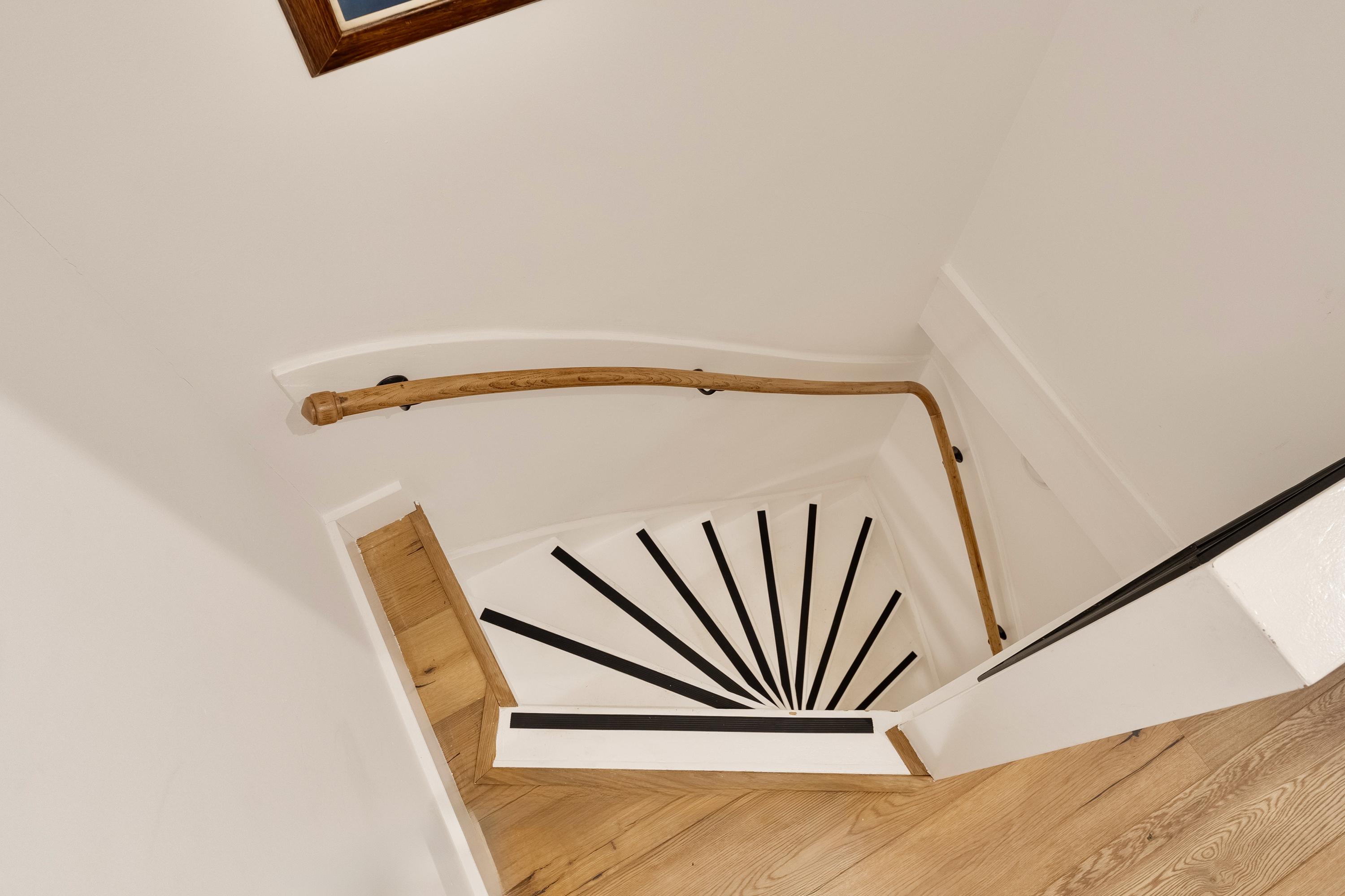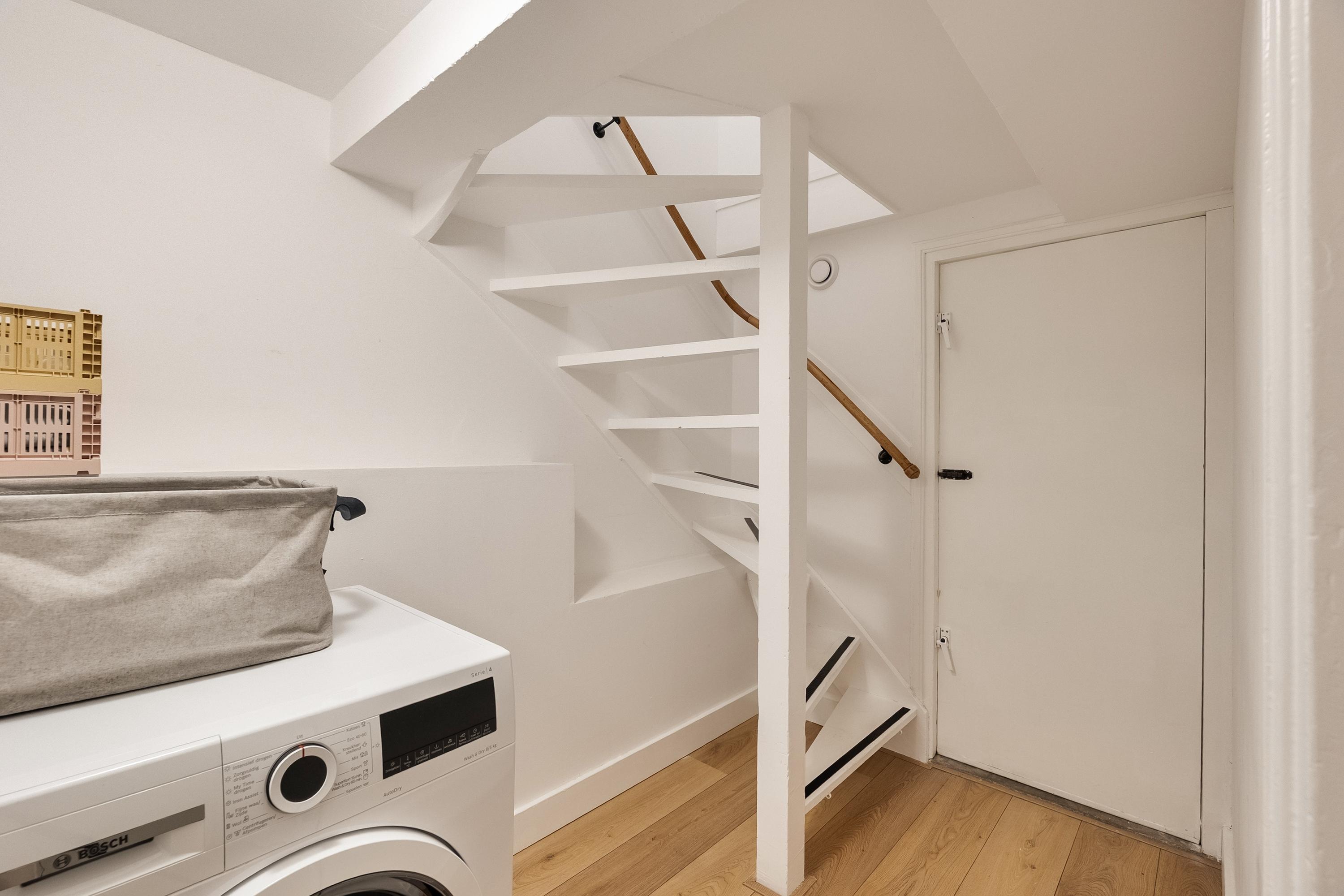 Terug in de woonkamer lopen we via de hal naar beneden, naar de slaapverdieping. Hier kom je uit op de overloop, waar de aansluiting zit voor de wasmachine en waar je toegang hebt tot de slaapkamer.