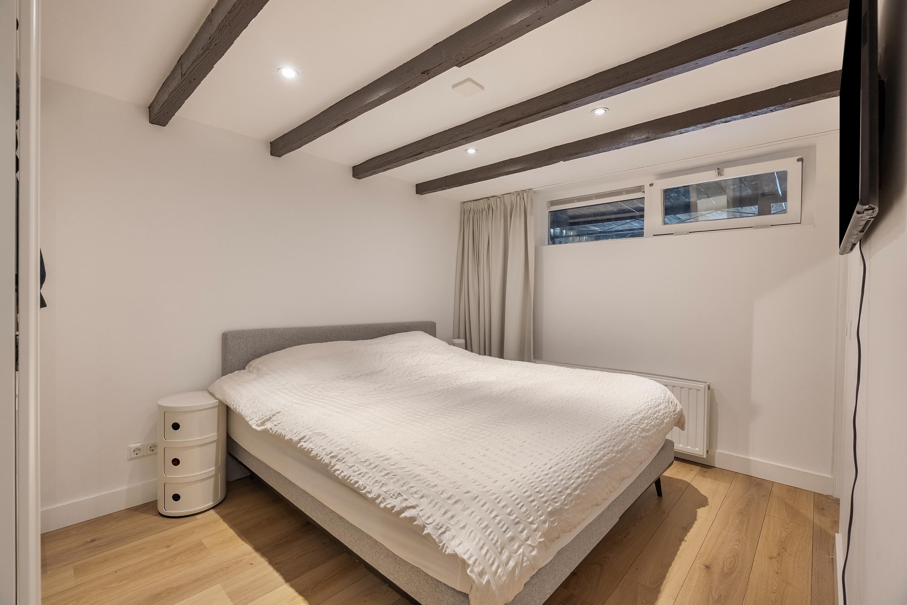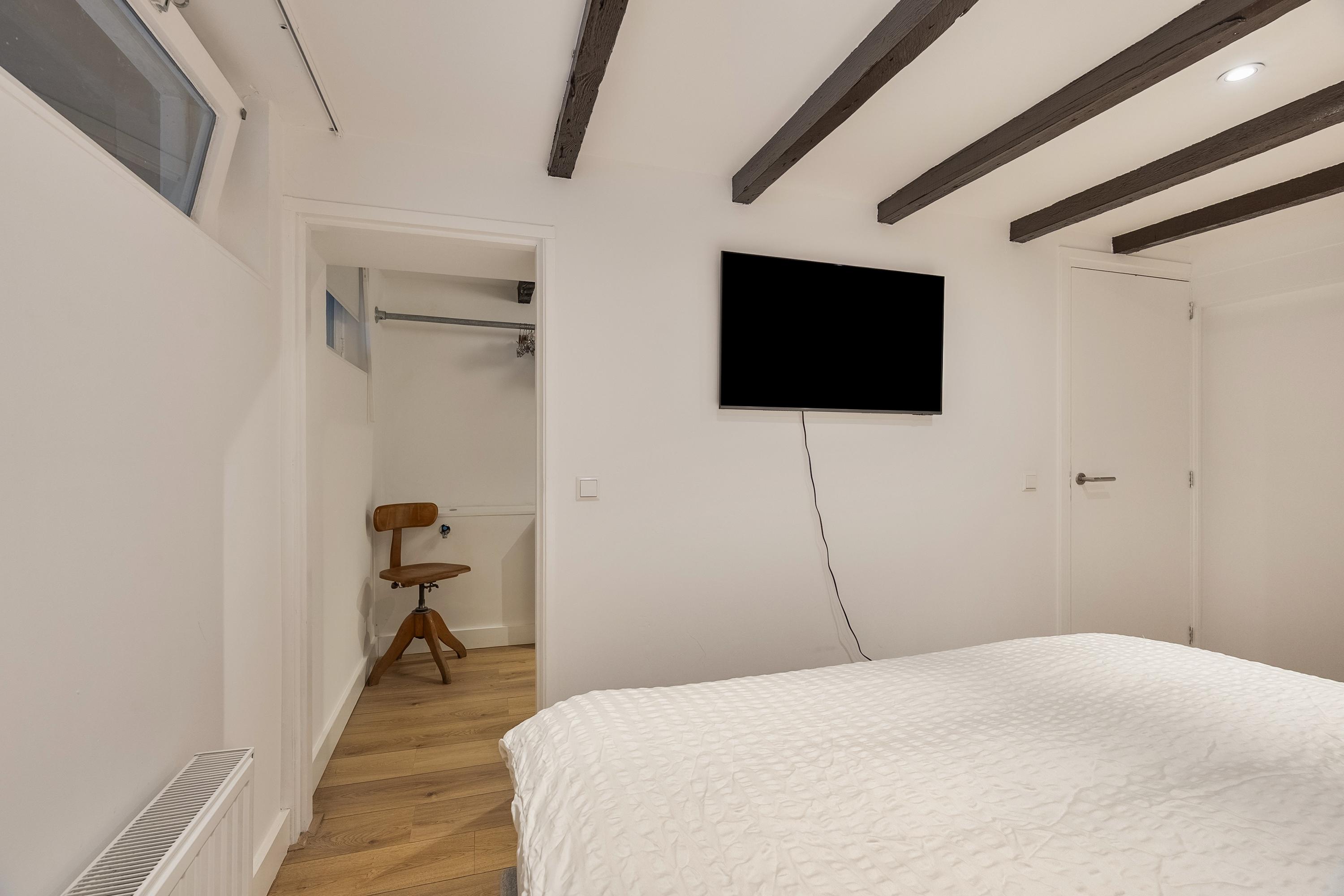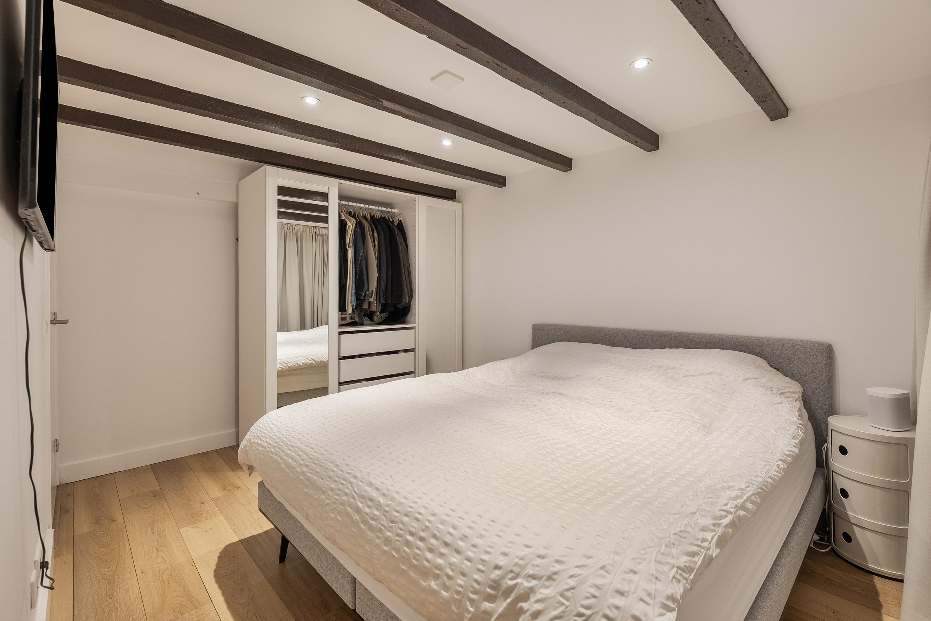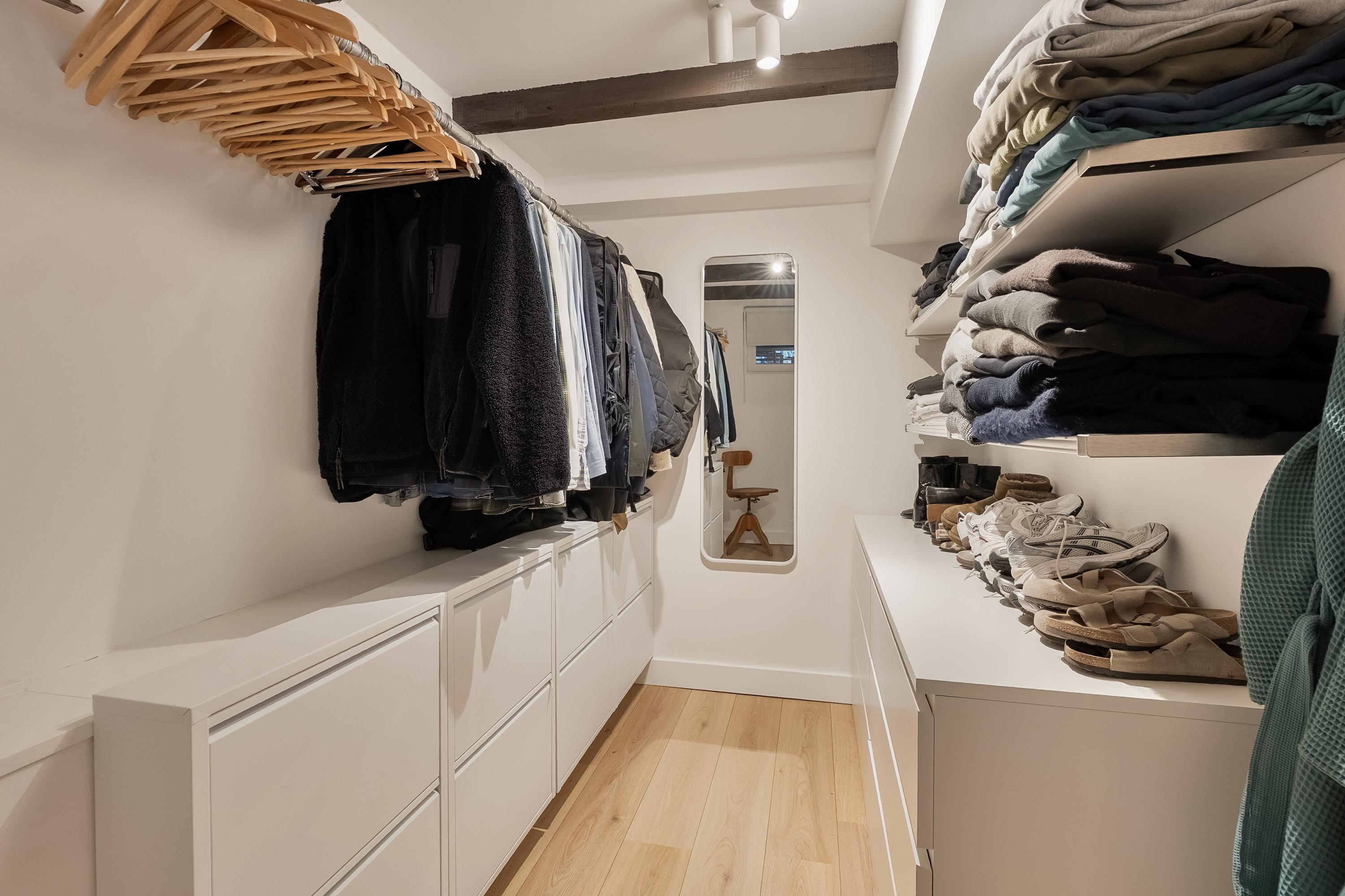 Slapen in het souterrain is echt heerlijk. In de zomer lekker koel en in de winter aangenaam. De slaapkamer is ca. 11 m² groot en biedt voldoende ruimte voor een tweepersoonsbed en een grote kledingkast. Bij de renovatie zijn de vloerbalken verhoogd, waardoor er een riante stahoogte is ontstaan — dit voelt niet als een onderbouw. Aansluitend loop je de walk-in closet in. Dat is en blijft fantastisch! Alle ruimte voor je kleding en schoenen.