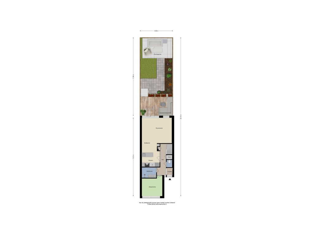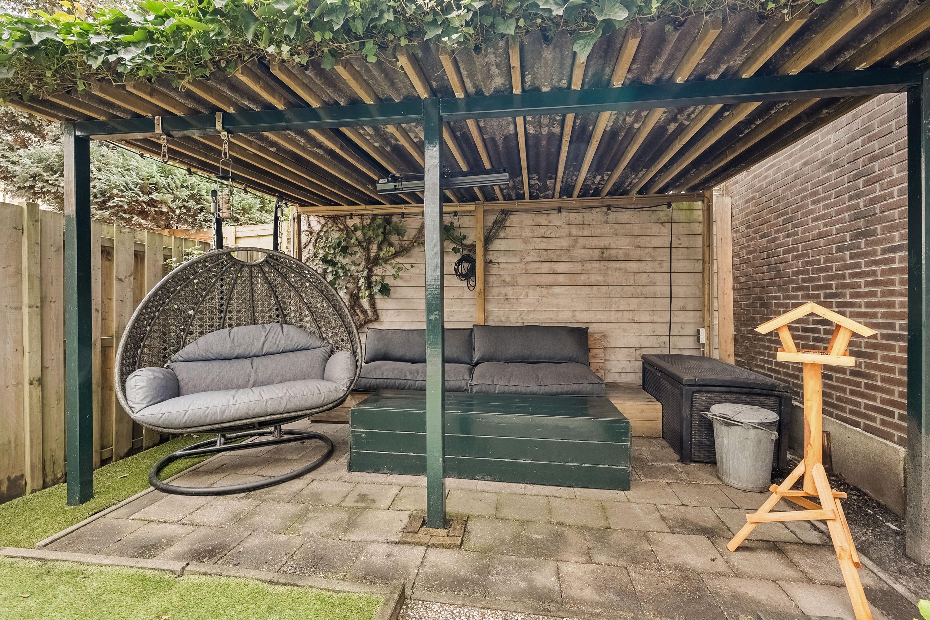 Tijd om de tuin in te stappen. De houten vlonderdelen lopen in dezelfde richting door als de houten vloer in de woonkamer. Tof, want dat verlengt optisch de woonkamer naar buiten. Op de veranda is ruimte genoeg voor een grote loungeset voor je eerste kop koffie in de ochtend. Via de trap naar beneden stap je de tuin in, waar een toffe overkapping is gebouwd. Dat betekent ook lekker buiten zitten als er een buitje valt. Een toptuin!