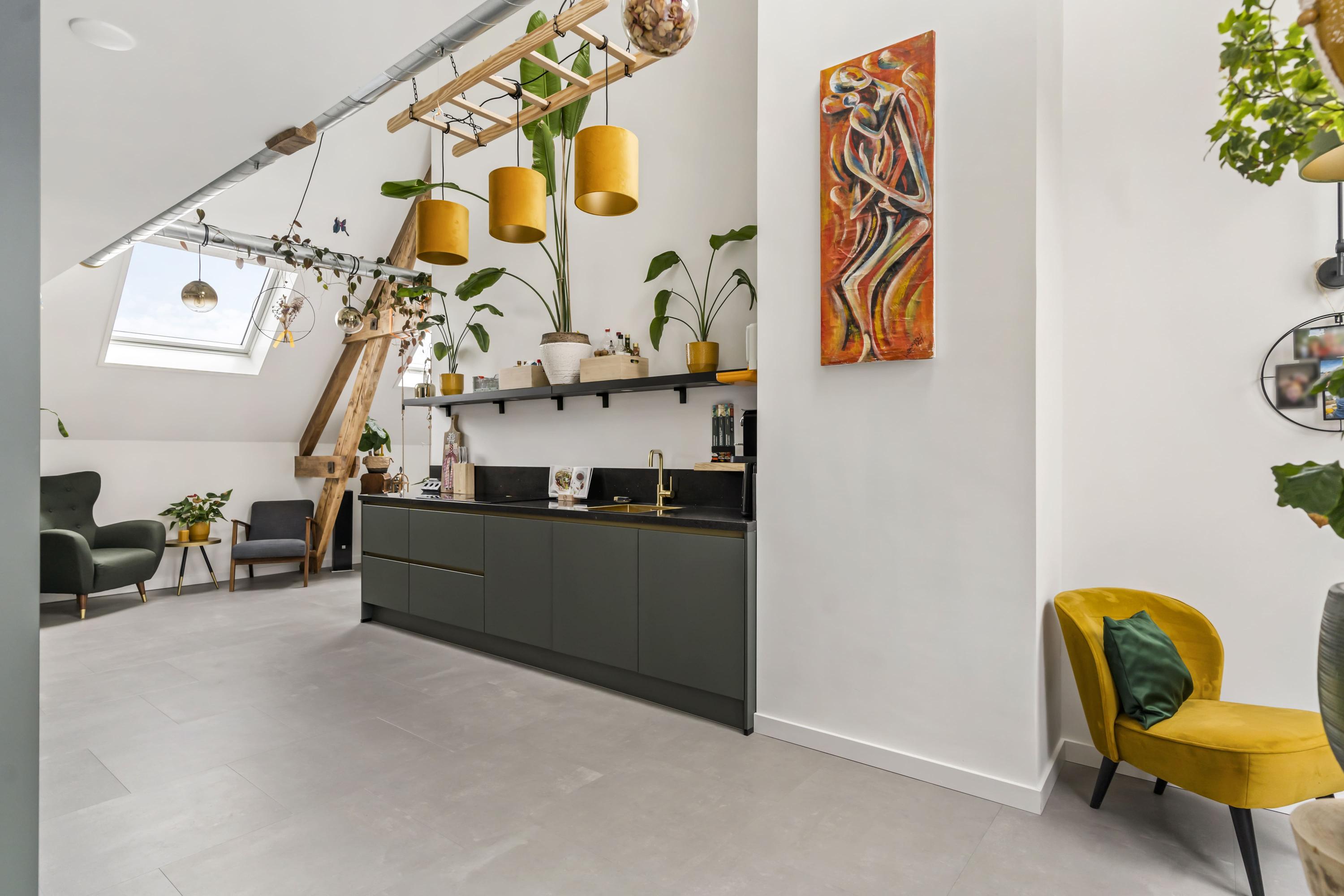Dankzij de speelse indeling zijn er diverse mogelijkheden voor een eetgedeelte, meerdere zitplekken en een aparte zithoek met ruimte voor een comfortabele bank. De op het zuiden gelegen loggia biedt een heerlijke, zonnige zitplaats. De hoge plafonds en grote ramen zorgen voor een aangename en royale lichtinval in het gehele appartement.