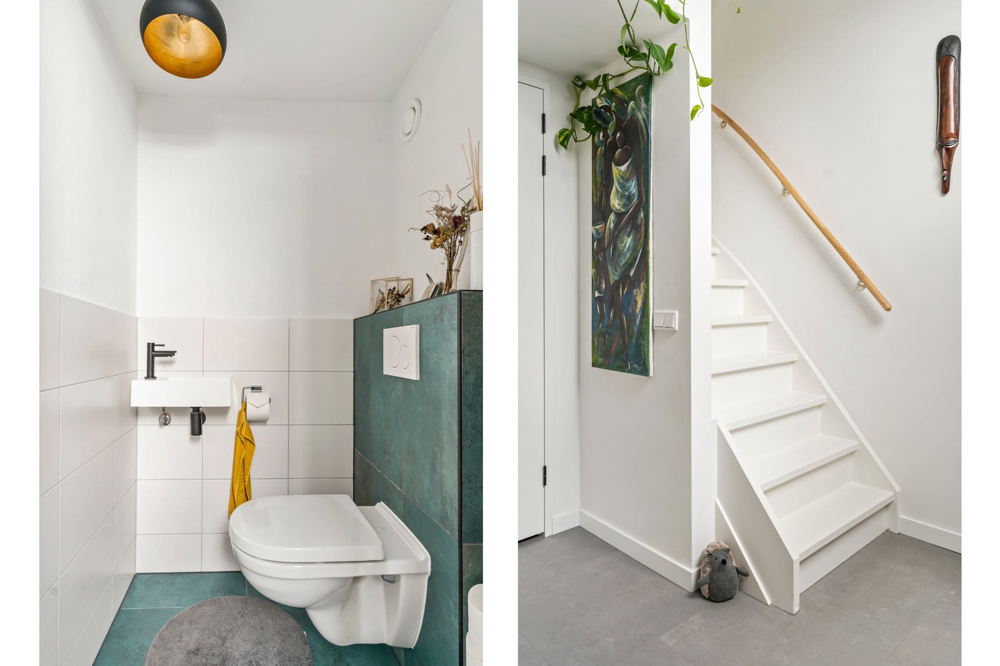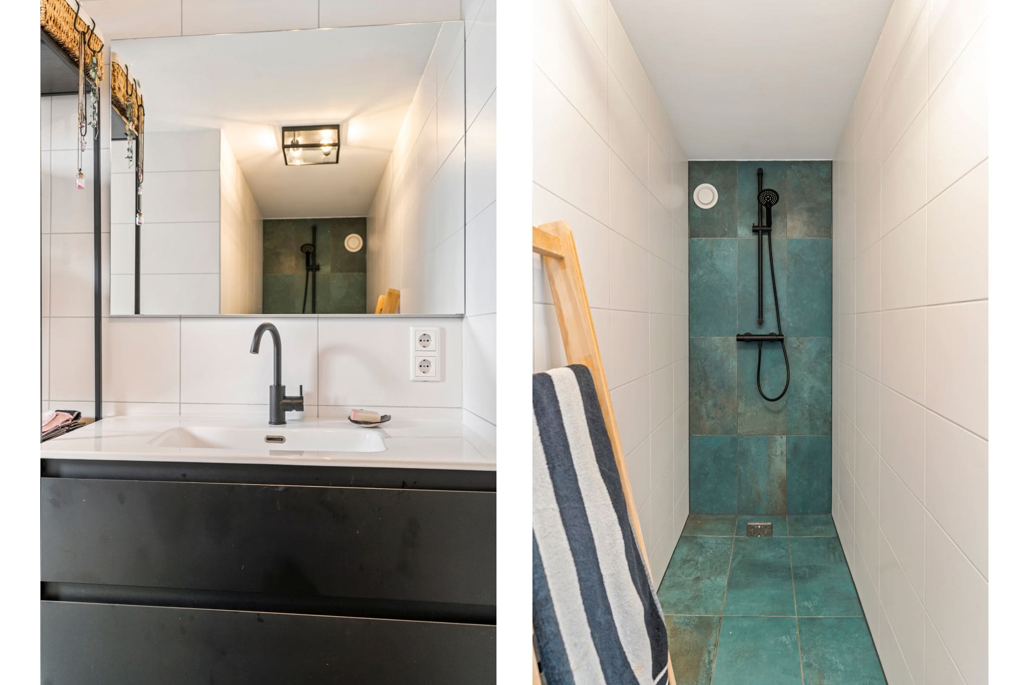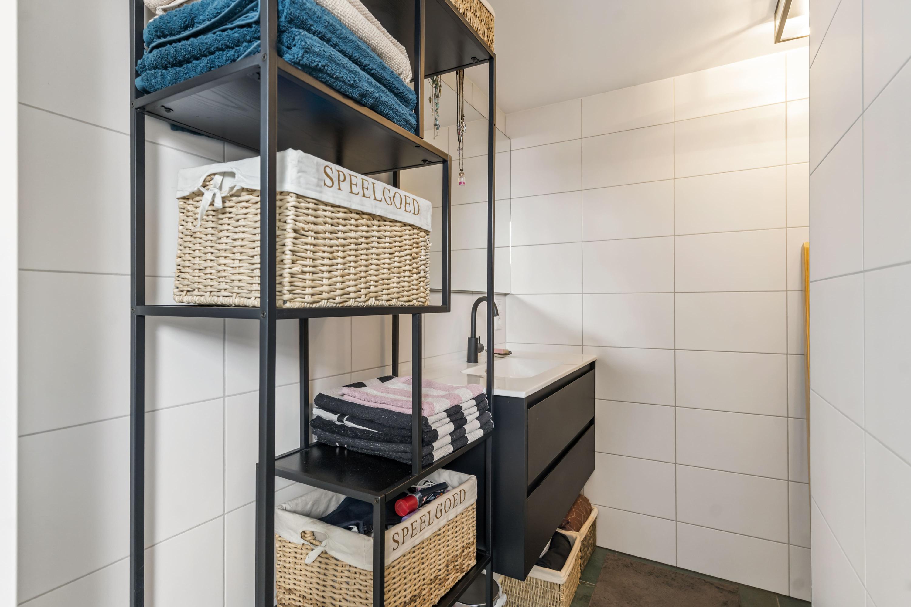 Vanuit de woonkamer is er toegang tot de badkamer met een inloopdouche en een wastafelmeubel en de aparte toiletruimte. Beide betegeld in een wit en azuurblauwe tegel.