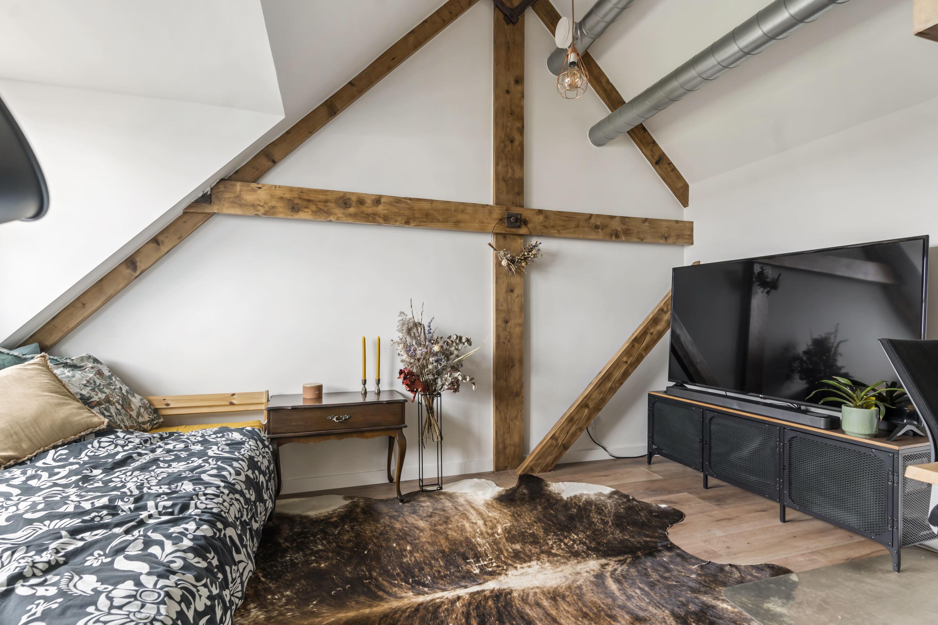 Binnenkomst in de ruime hal met voldoende plek voor jassen en schoenen. Direct bij binnenkomst vallen de karakteristieke balken op, die door de gehele woning zichtbaar zijn en zorgen voor een warme uitstraling.