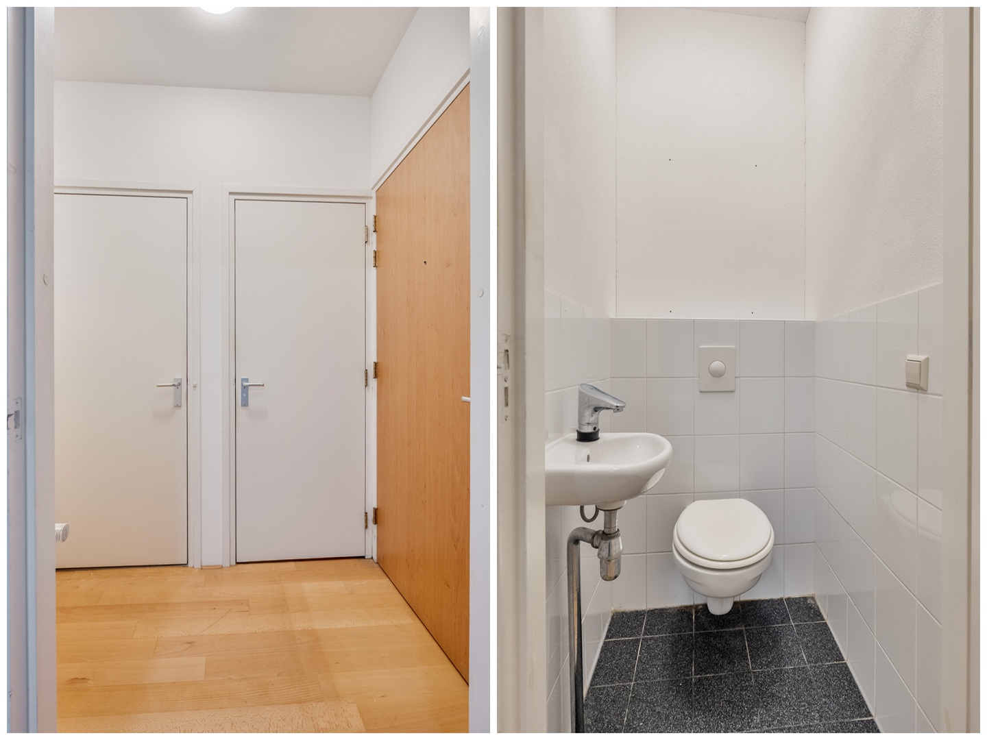 Toiletruimte voorzien van een hangcloset toilet en fonteintje. De toiletruimte is gedeeltelijk betegeld in een wit/grijs kleurstelling.