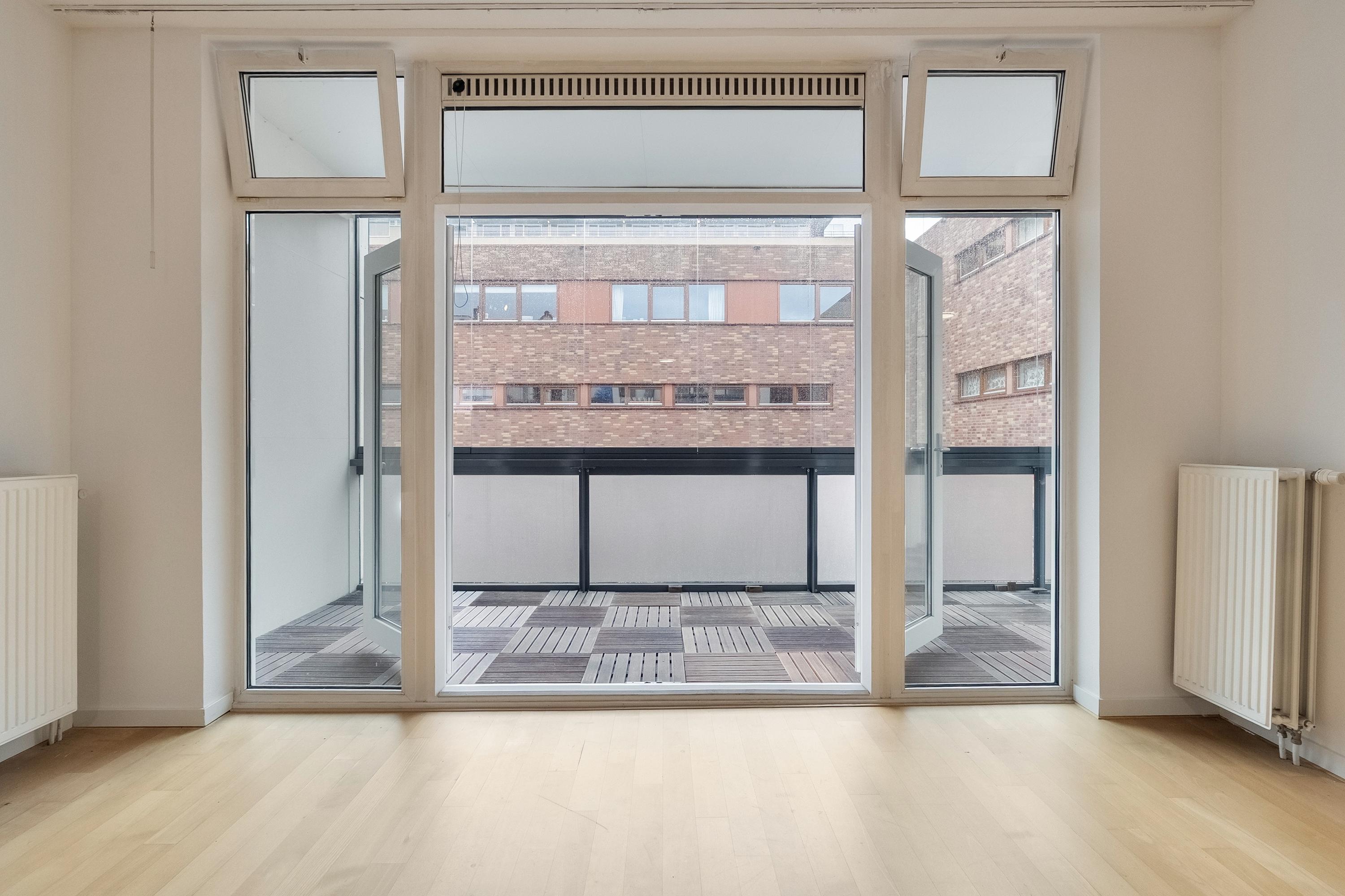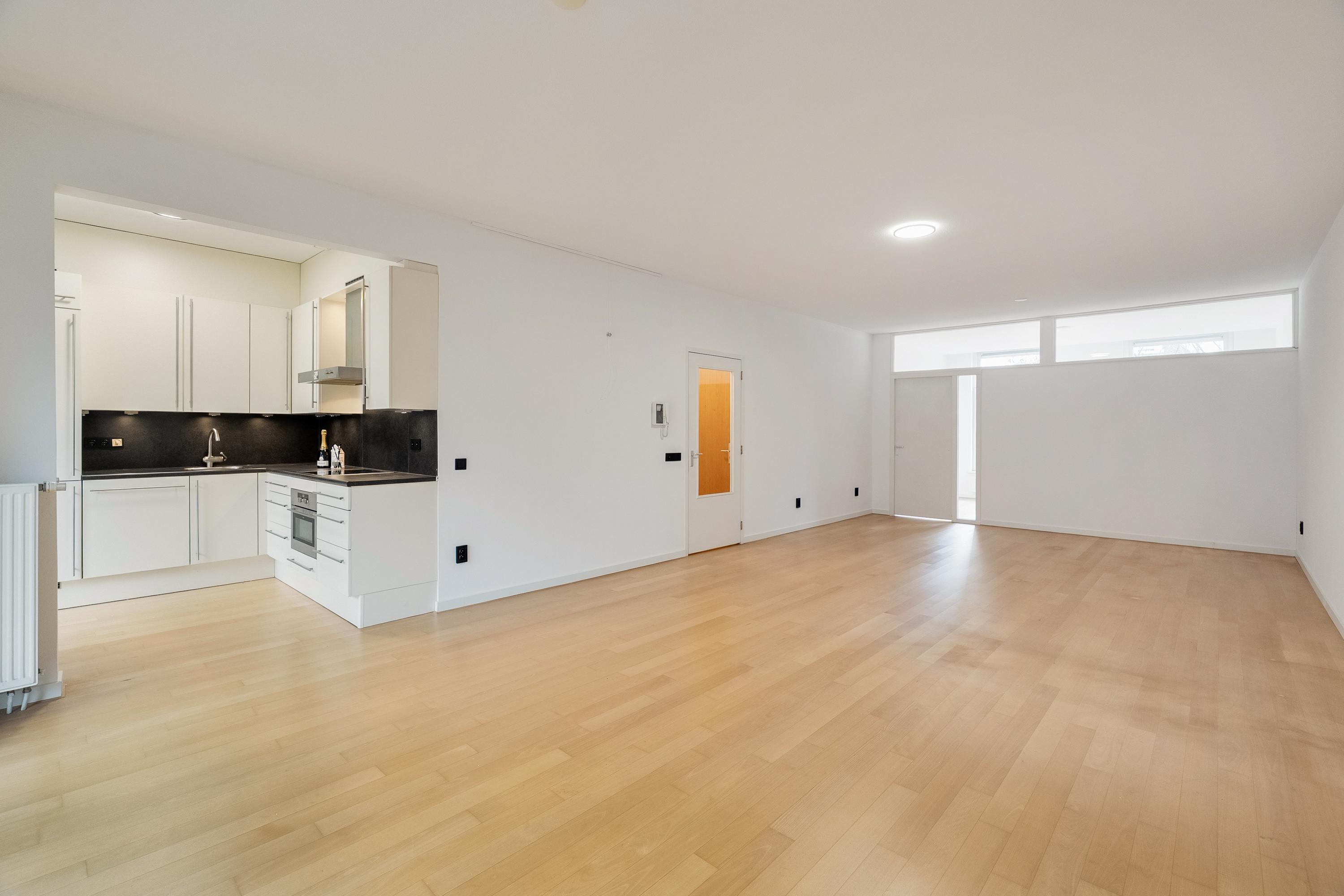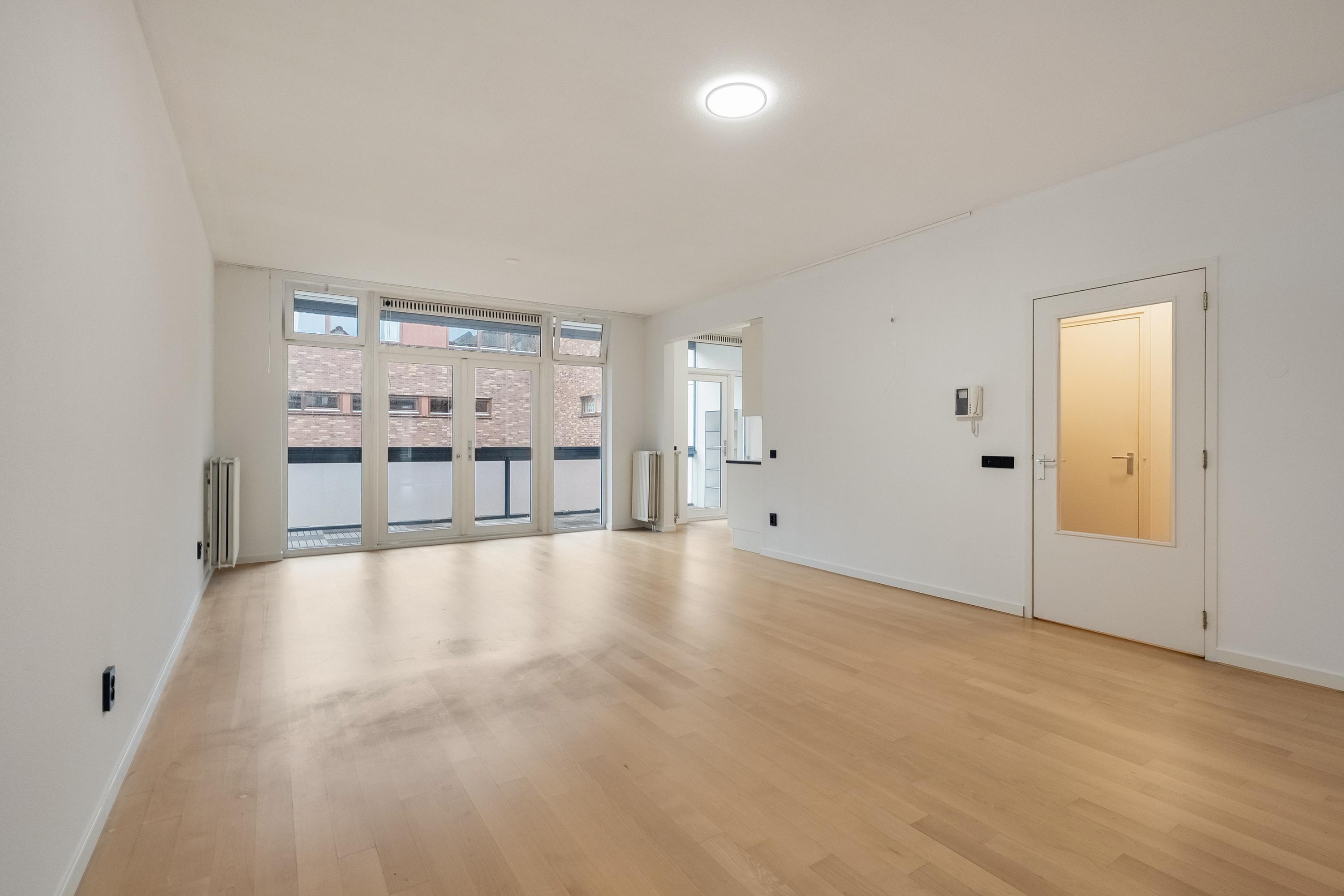 Royale lichte woonkamer (ca. 44 m2) voorzien van een duurzame laminaatvloer. De grote raampartijen aan de achterzijde zorgen voor volop aangename natuurlijke lichtinval. De woonkamer biedt voldoende ruimte voor een gezellige eethoek bij de keuken. Door middel van openslaande deuren heeft u toegang tot de zonnige loggia.