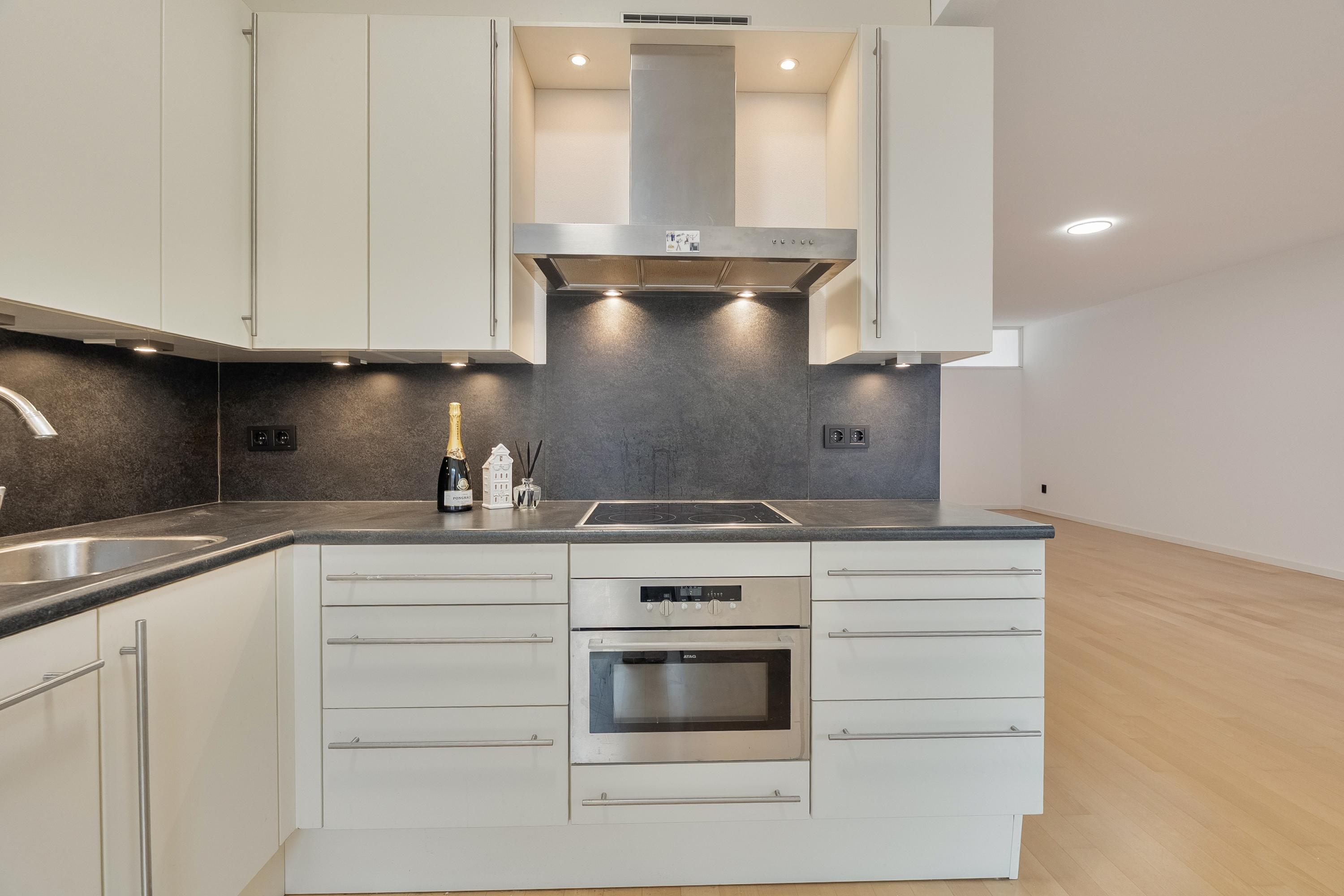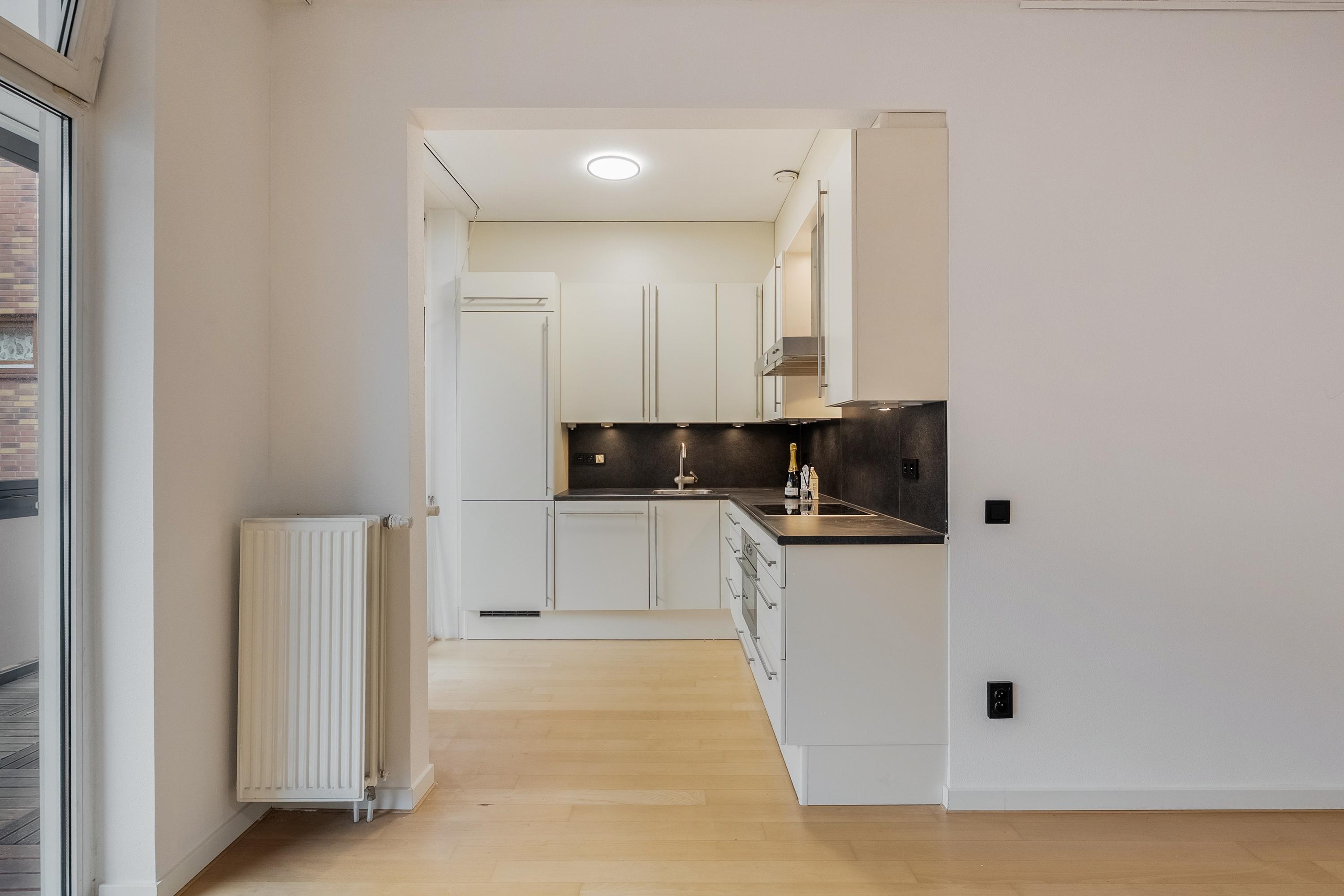 De open keuken (ca. 5 m2) is gelegen aan de achterzijde van het complex en is uitgevoerd in een L-opstelling. De keuken is voorzien van diverse inbouwapparatuur zoals een koelkast, keramische kookplaat, RVS afzuigkap. oven en een vaatwasser. Verder is de keuken voorzien van een enkele spoelbak en kastruimte. Het geheel is uitgevoerd in wit en is afgewerkt met een kunststof aanrechtblad en gedeelte van de wanden achter het aanrecht, laminaatvloer en sfeerverlichting. Door middel van een loopdeur heeft u toegang tot de zonnige loggia.