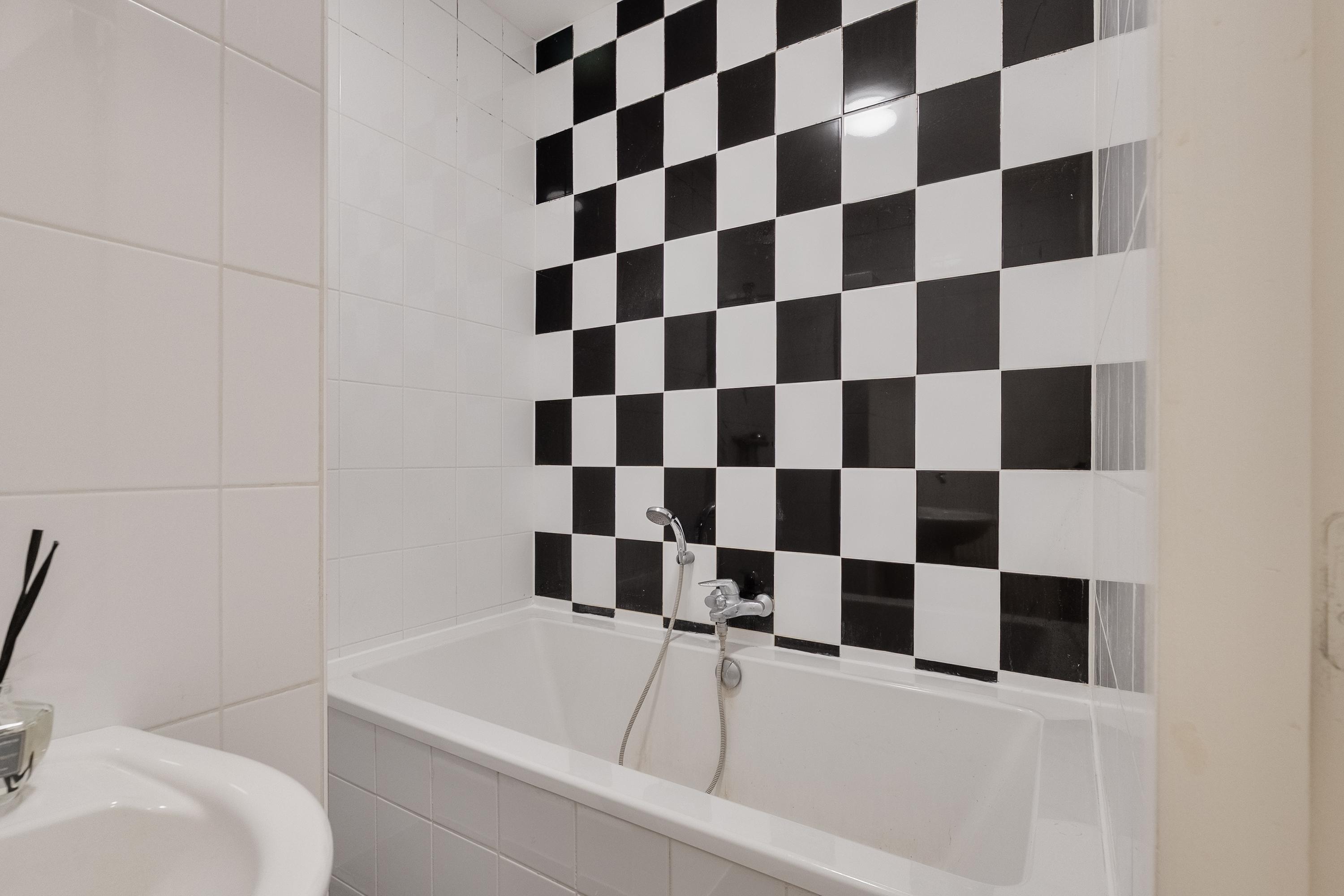 Badkamer (ca. 4 m2) met sanitaire voorzieningen zoals een wastafel, ligbad, een douchecabine en designradiator. De badkamer is geheel betegeld in een wit/grijs kleurstelling.