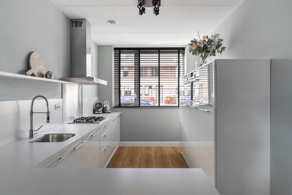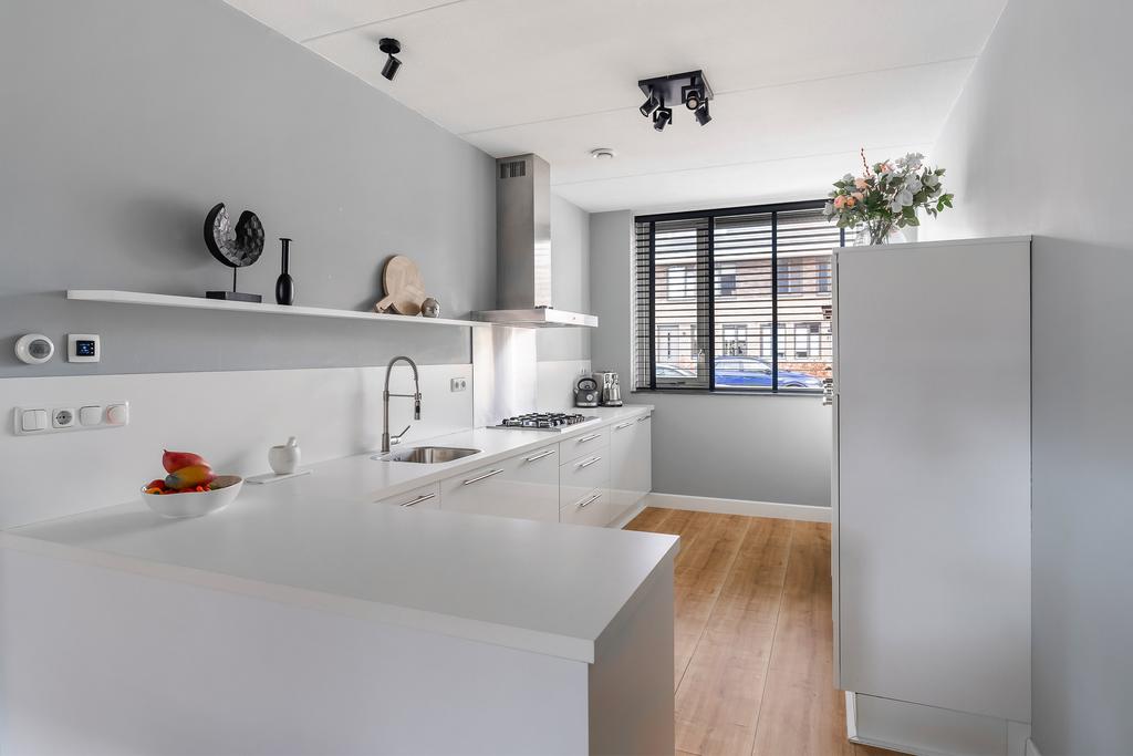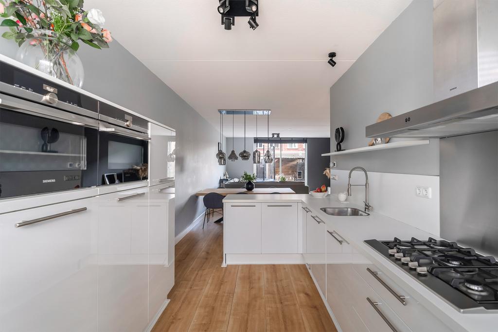 De open woonkeuken (ca. 10 m²) ligt aan de voorzijde en is uitgevoerd in hoogglans wit met een licht kunststof werkblad. De Siemens apparatuur, waaronder een 5-pits gaskookplaat, RVS afzuigkap, oven, combi-oven, koelkast en vriezer, maken deze keuken compleet. De keuken is uitgevoerd in een hoeksopstelling met een vrijstaande kast voor de apparatuur.