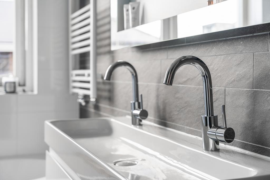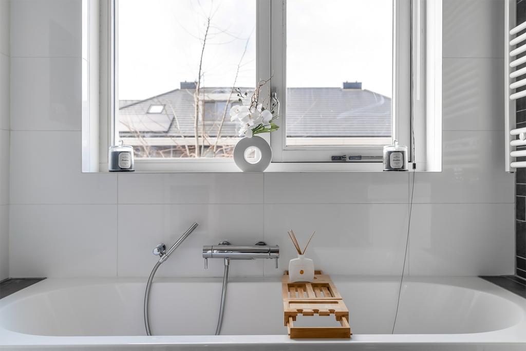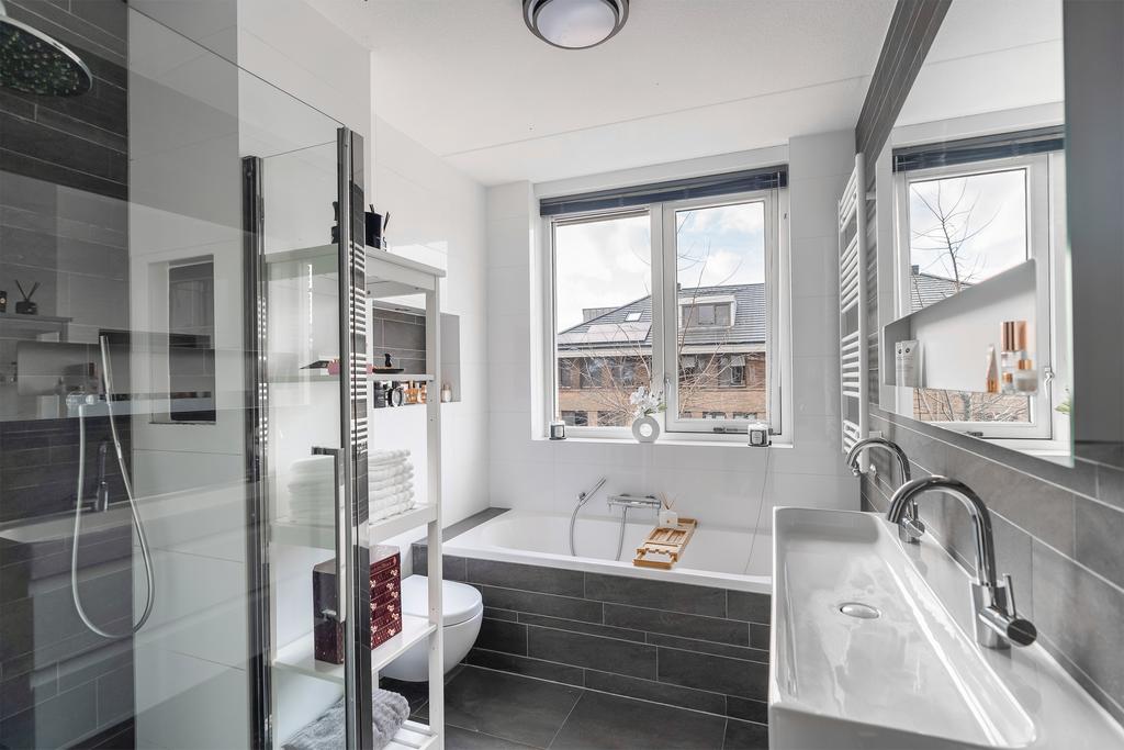 De badkamer (ca. 7 m²) is compleet uitgevoerd met een ligbad, een aparte douchecabine en een dubbel wastafelmeubel. De geheel betegelde ruimte in wit en grijs zorgt voor een strakke en frisse uitstraling.