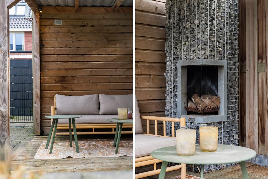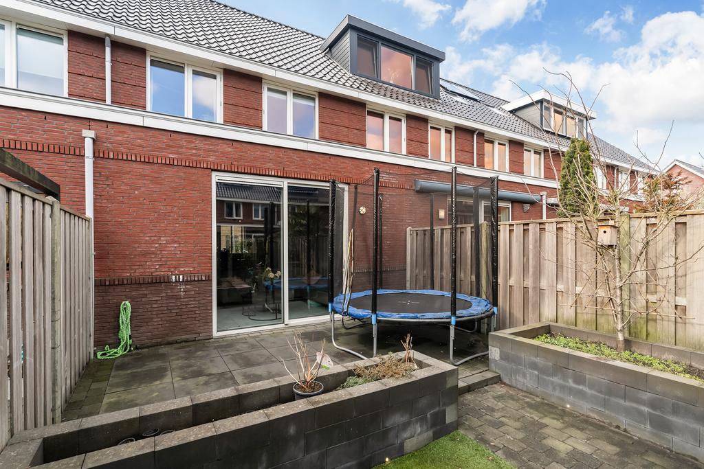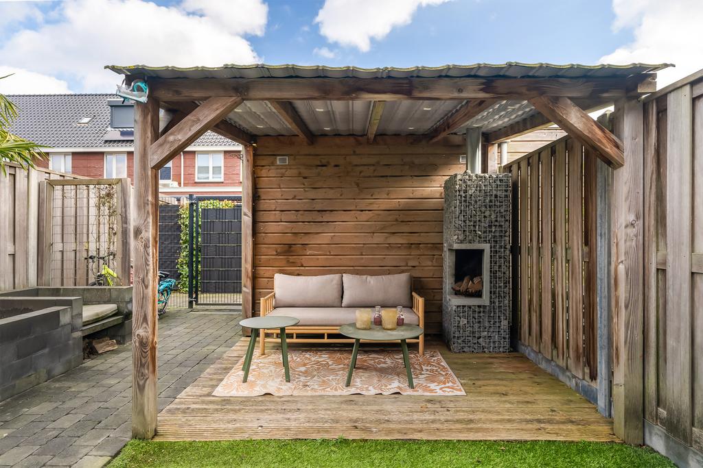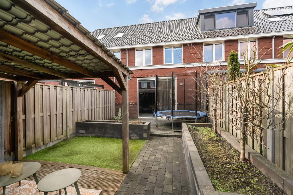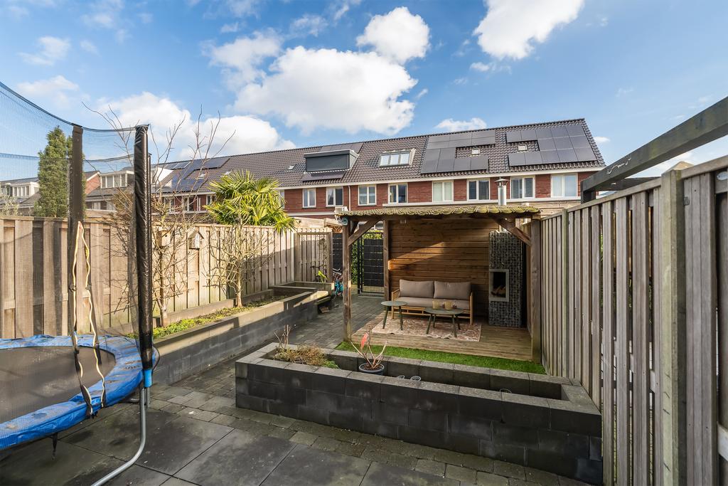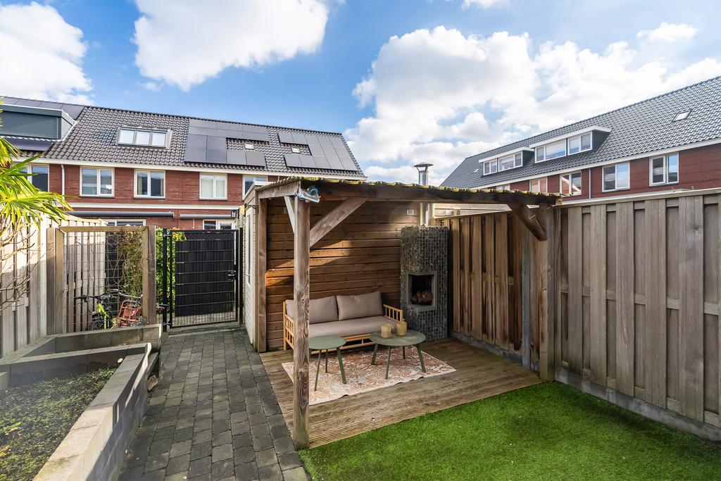 De achtertuin, gelegen op het oosten, is onderhoudsvriendelijk en sfeervol ingericht met sierbestrating, kunstgras, brede plantenbakken en een gezellige overkapping met een houten vlonder en een open haard. De tuin is via een achterom te bereiken en geheel omringd door houten schuttingen, perfect voor ontspanning en gezellige avonden.