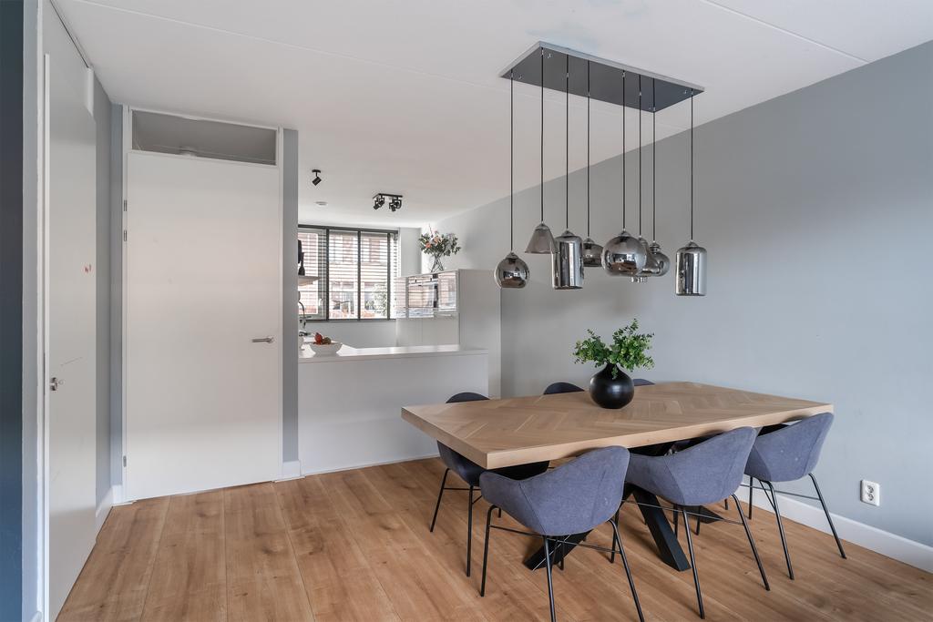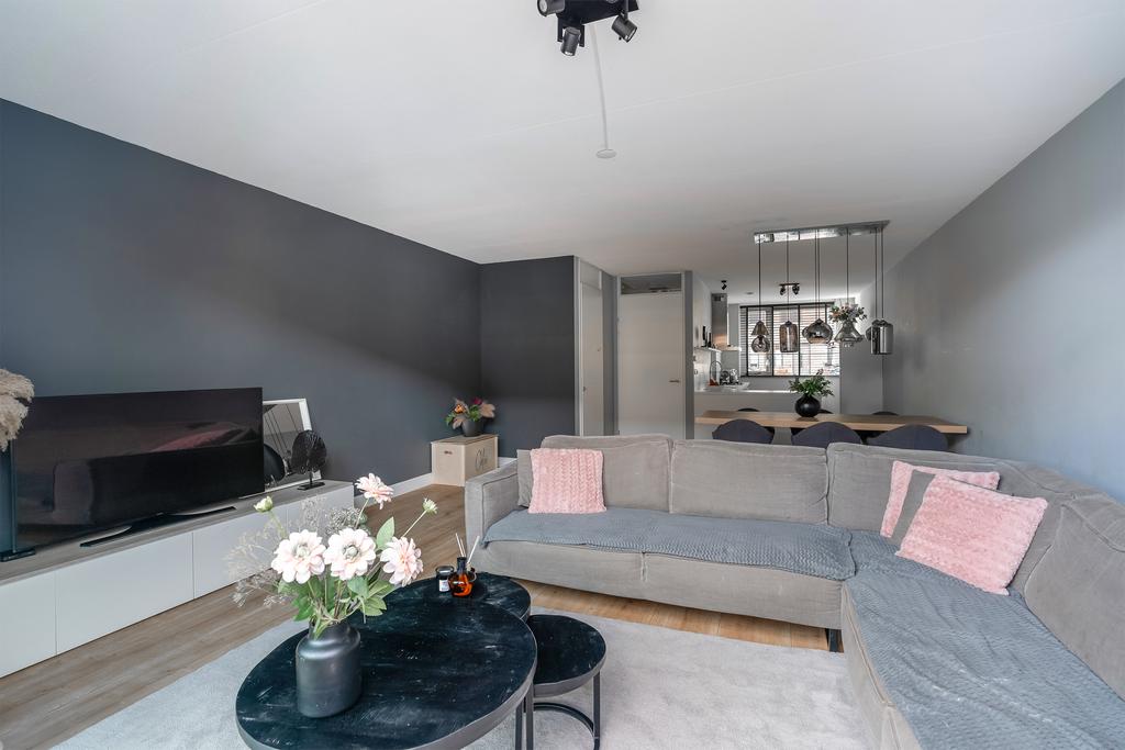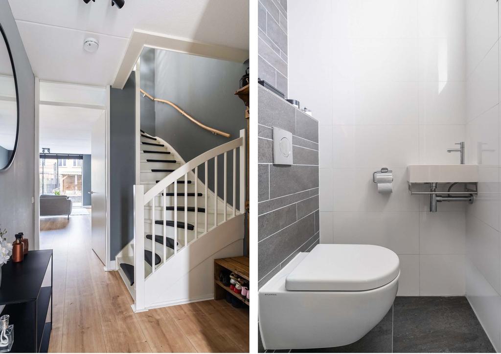 Bij binnenkomst in de ruime voortuin betreed je de hal met garderobe, meterkast en een keurig afgewerkt toilet met hangend closet en fonteintje, geheel in een frisse wit/grijze kleurstelling. De sfeervolle woonkamer (ca. 40 m²), voorzien van een grote glazen schuifpui naar de zonnige achtertuin en is afgewerkt met een laminaatvloer mét vloerverwarming en gladde wanden.