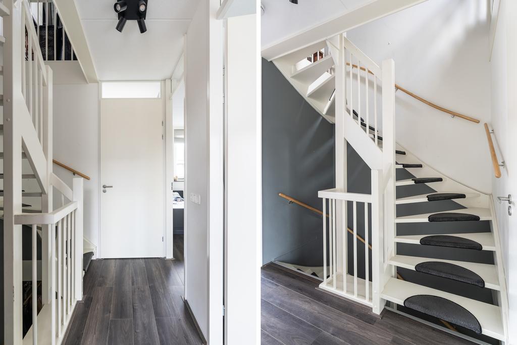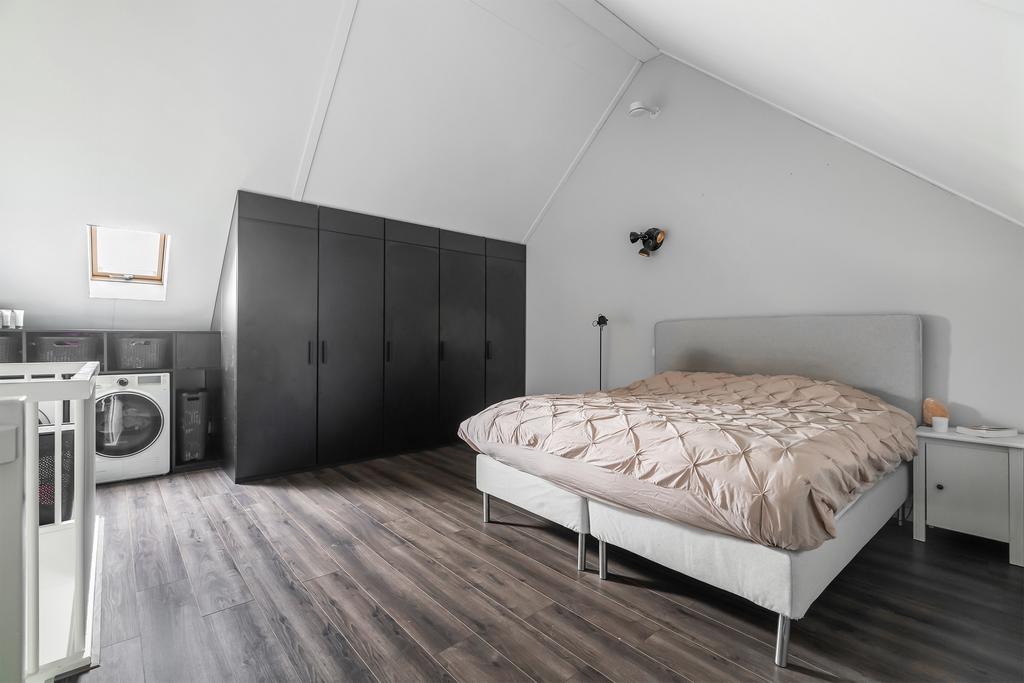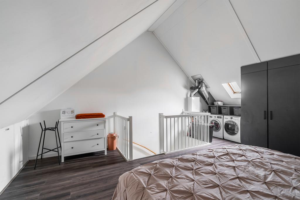 De vloer is afgewerkt met laminaat en op deze verdieping vind je ook de aansluiting voor wasmachine en droger, evenals de opstelling van de CV-ketel. Deze ruimte is flexibel in te richten voor bijvoorbeeld een kantoor, hobbyruimte of extra slaapkamer.