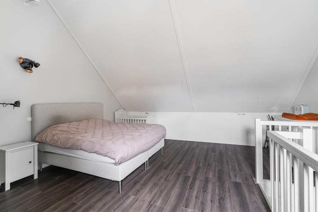 De open zolderverdieping (ca. 34 m²) maakt extra leefruimte mogelijk en is voorzien van een Velux dakraam dat extra daglicht binnenlaat. Vaste op maat gemaakte kasten en bergruimte achter de knieschotten maken deze ruimte extra functioneel.