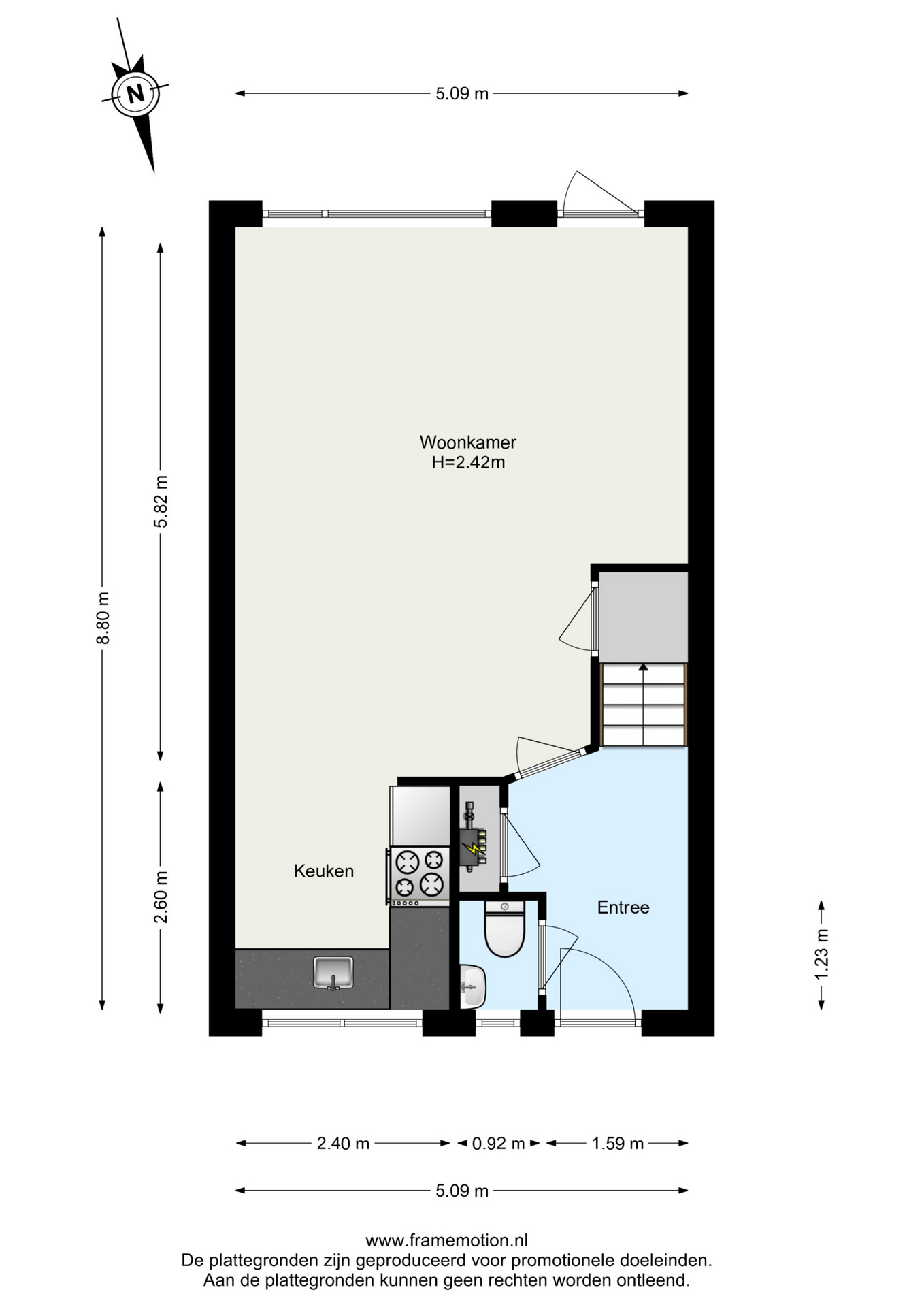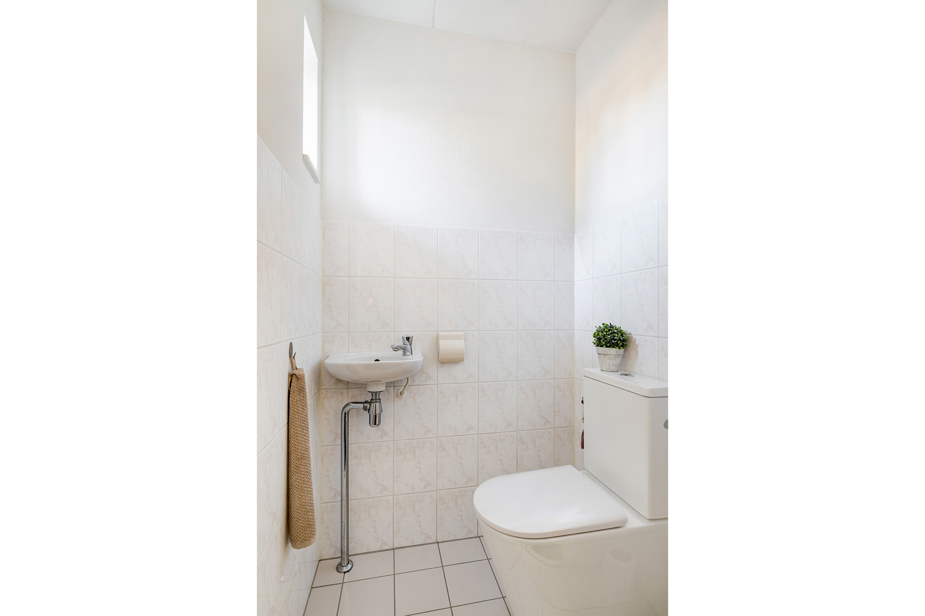 Entree in de hal met meterkast en trapopgang naar de eerste verdieping. De toiletruimte is gedeeltelijk licht betegeld en voorzien van een duoblok toilet. Vanuit de hal betreedt u de tuingerichte woonkamer. Dankzij de grote ramen aan de achterzijde en de loopdeur naar de tuin is er een prettige lichtinval en een directe verbinding met buiten. De woonkamer is afgewerkt met een eikenhouten vloer, glad gestucte wanden en beschikt over een praktische trapkast.