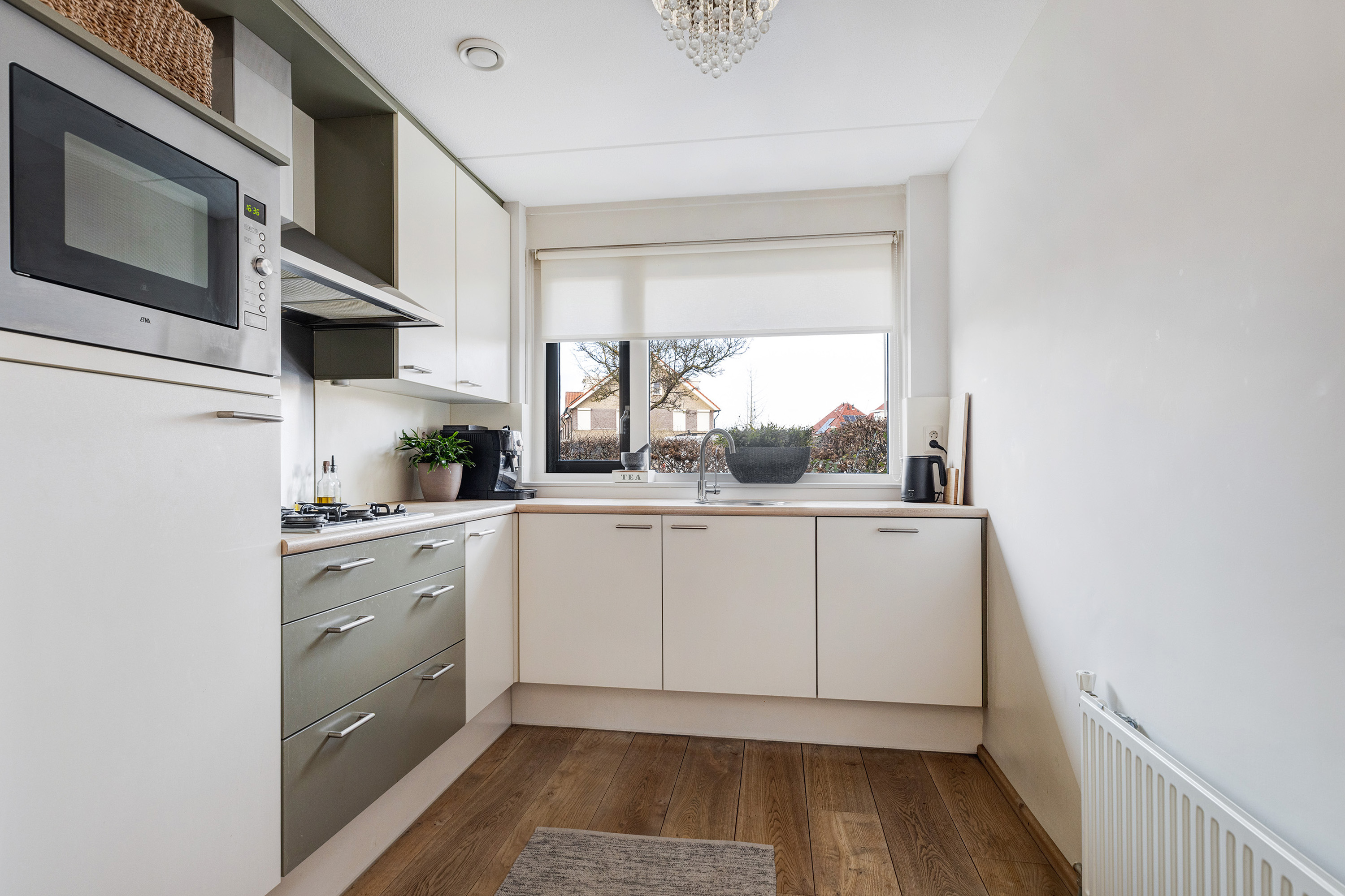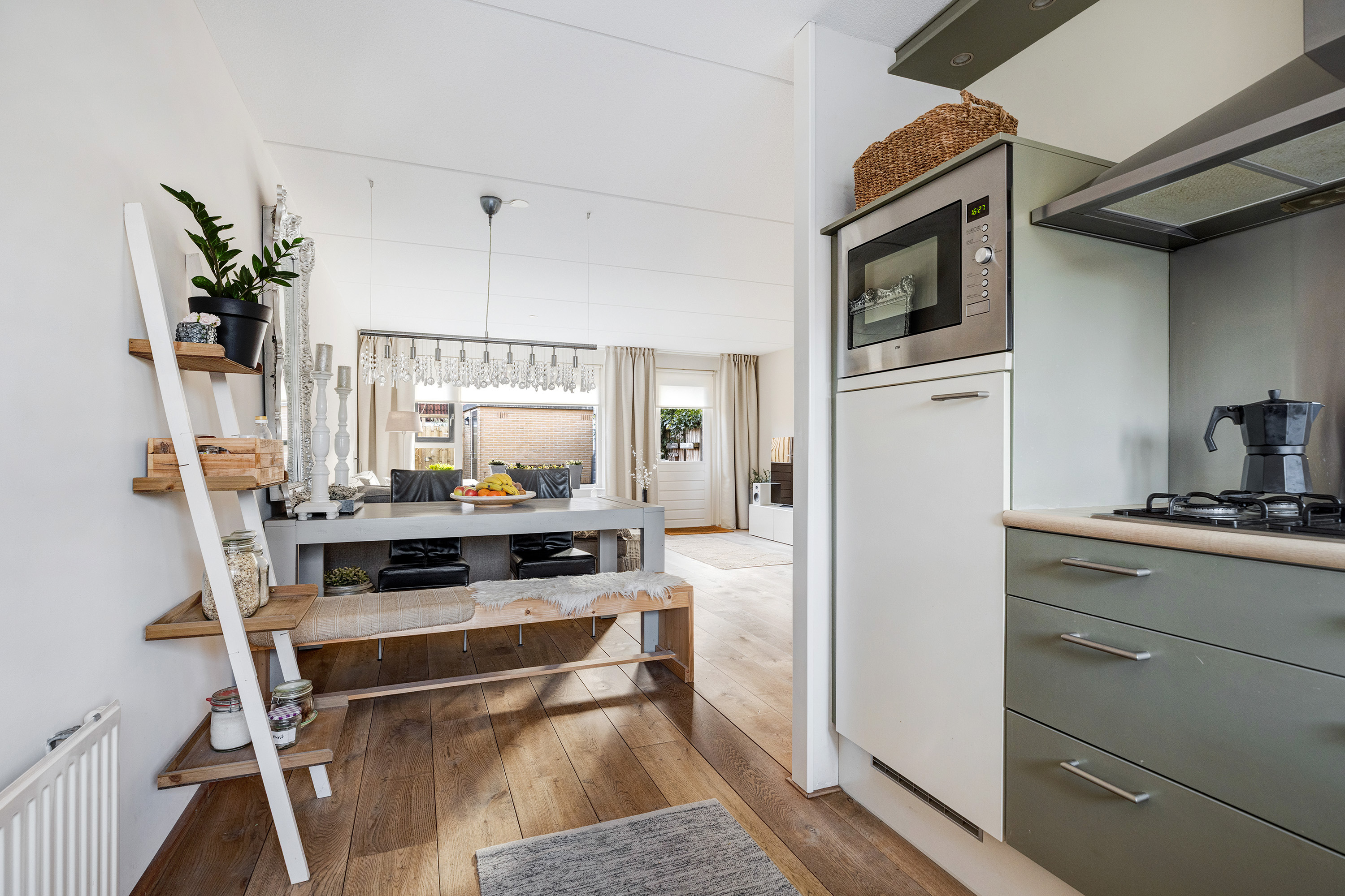 Aan de voorzijde bevindt zich de open keuken, uitgevoerd in een lichte kleurstelling met een kunststof aanrechtblad. De keuken is voorzien van diverse inbouwapparatuur, waaronder een oven, 4-pits gaskookplaat met RVS afzuigkap, vaatwasser en een koelkast met vriesvak. Ook hier ligt een houten vloer, wat zorgt voor een mooie eenheid met de woonkamer.