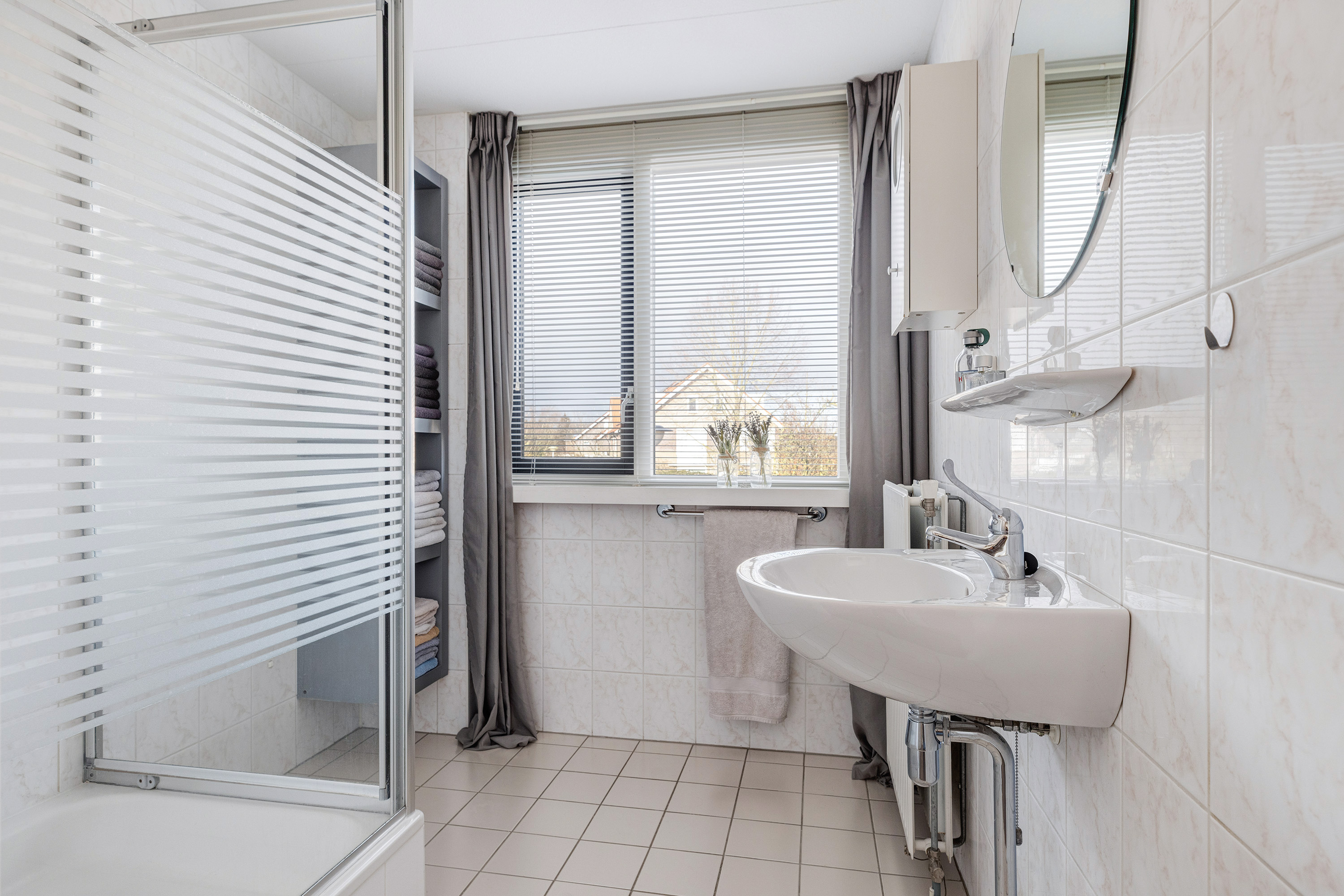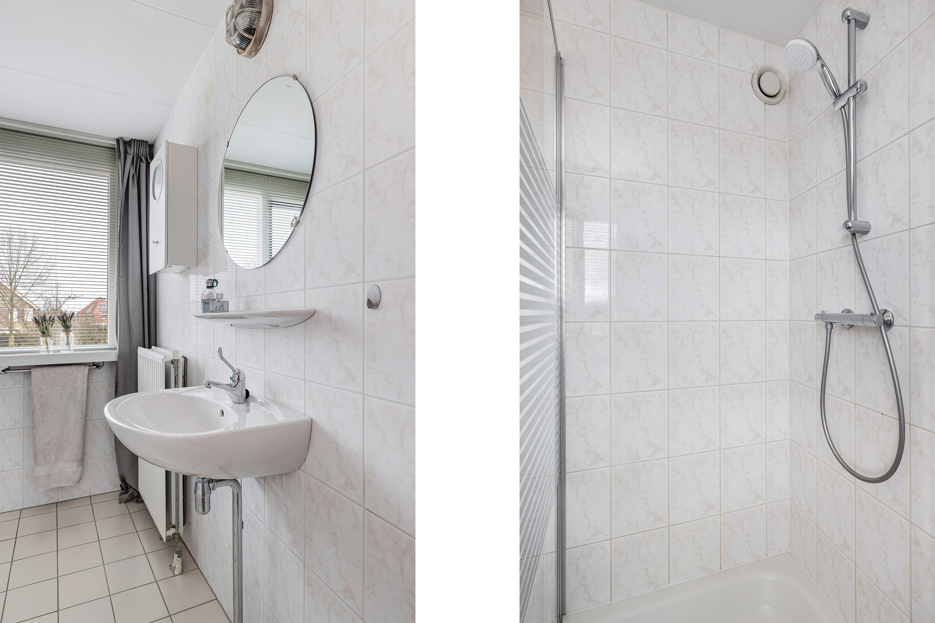 De badkamer is geheel licht betegeld en uitgerust met een douchecabine, vaste wastafel en een groot raam aan de voorzijde, wat zorgt voor natuurlijke ventilatie en daglicht.