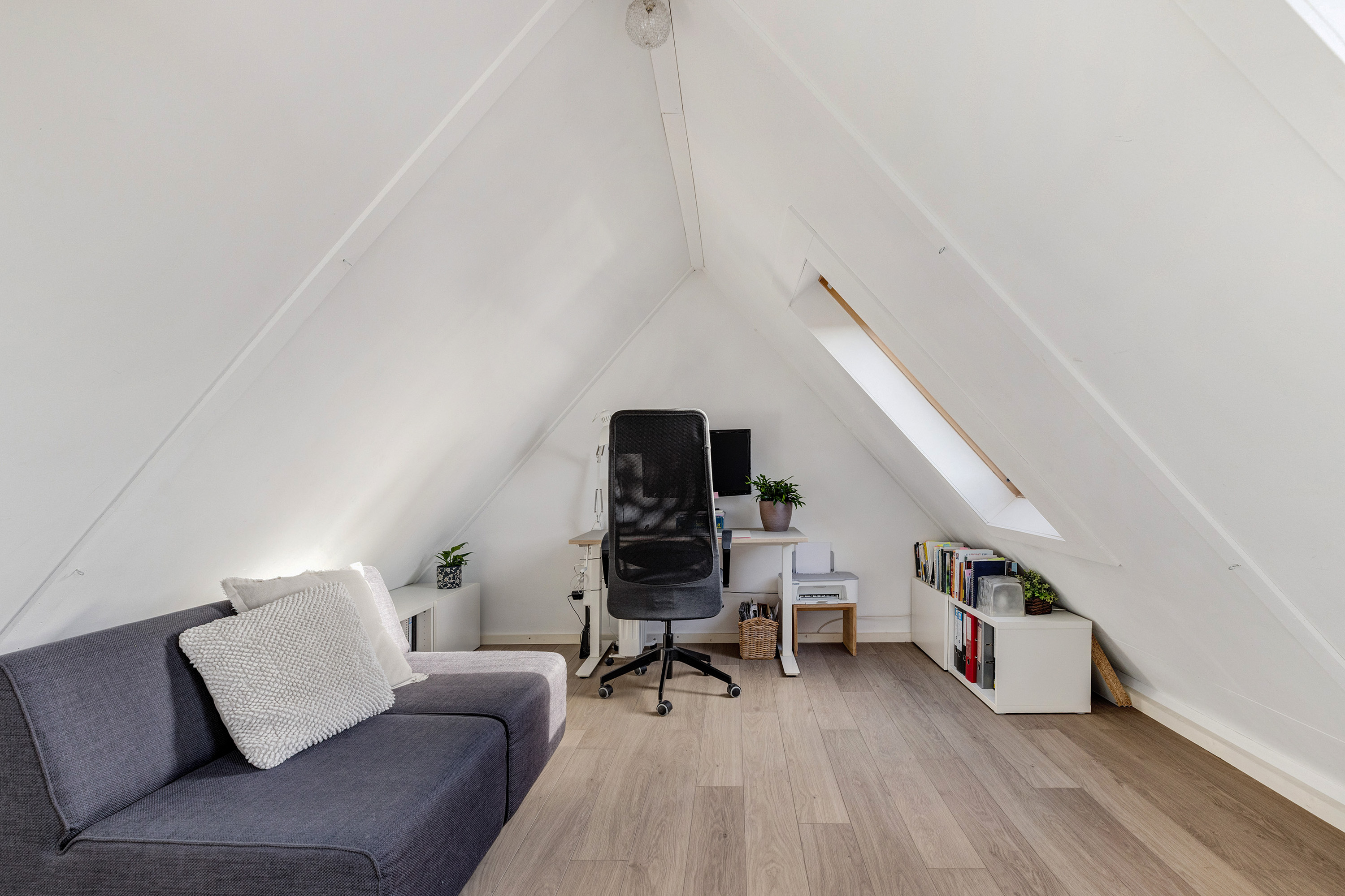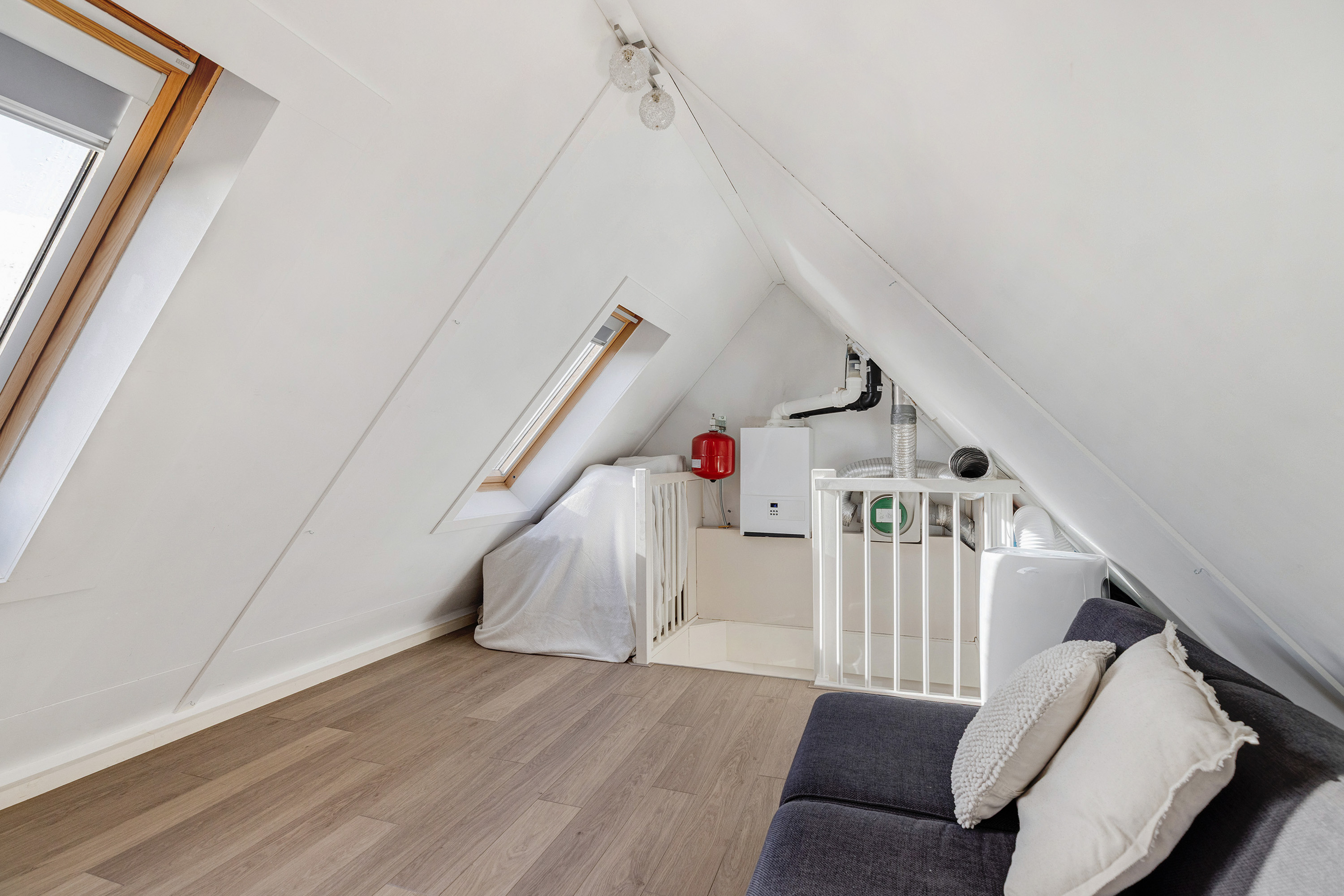 Open zolderverdieping met twee dakramen, laminaatvloer en een schuin dak dat zorgt voor een speels karakter. Hier bevinden zich de CV-opstelling en de mechanische ventilatie-installatie. Deze verdieping biedt volop mogelijkheden voor het realiseren van een extra slaapkamer, werkkamer of hobbyruimte.