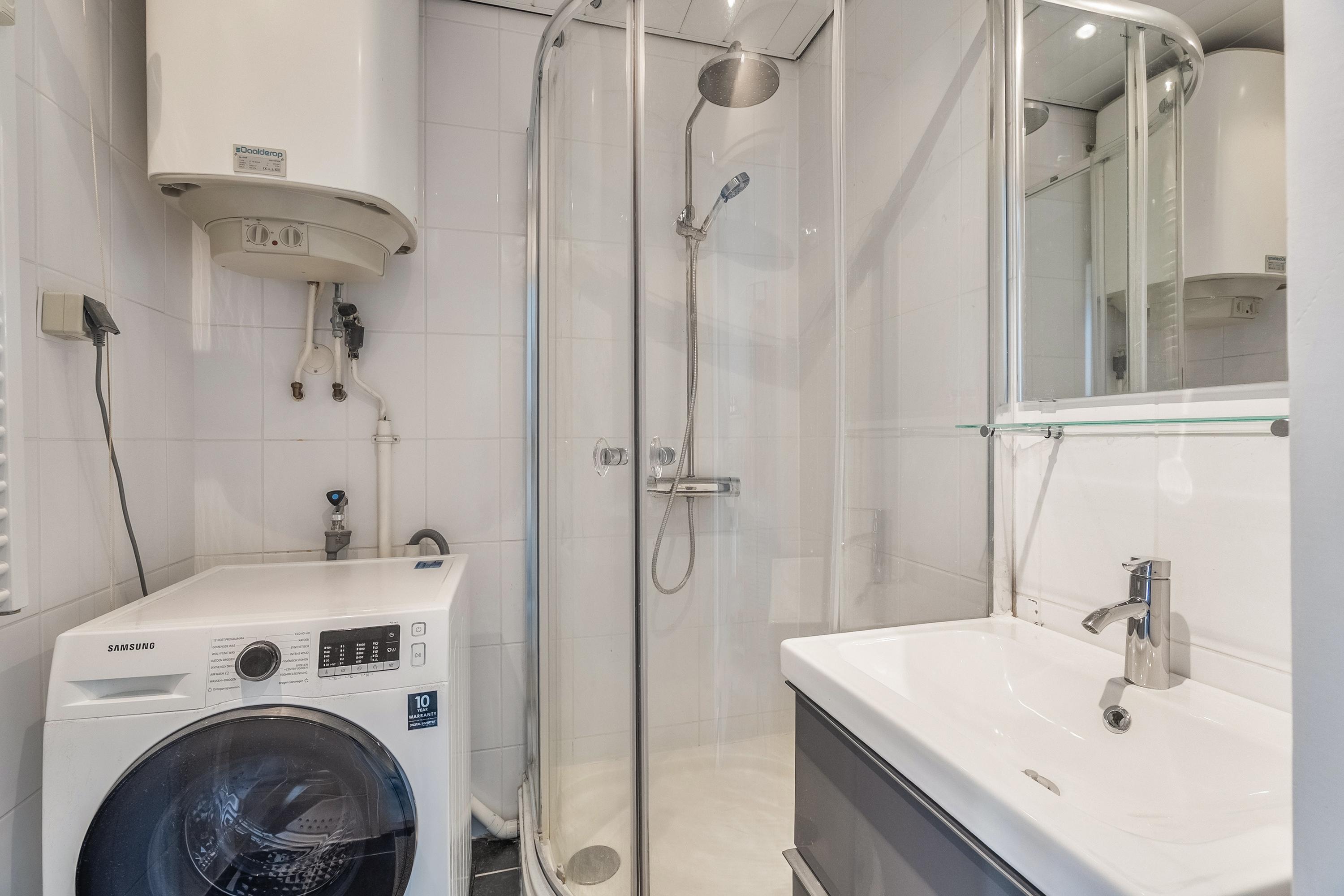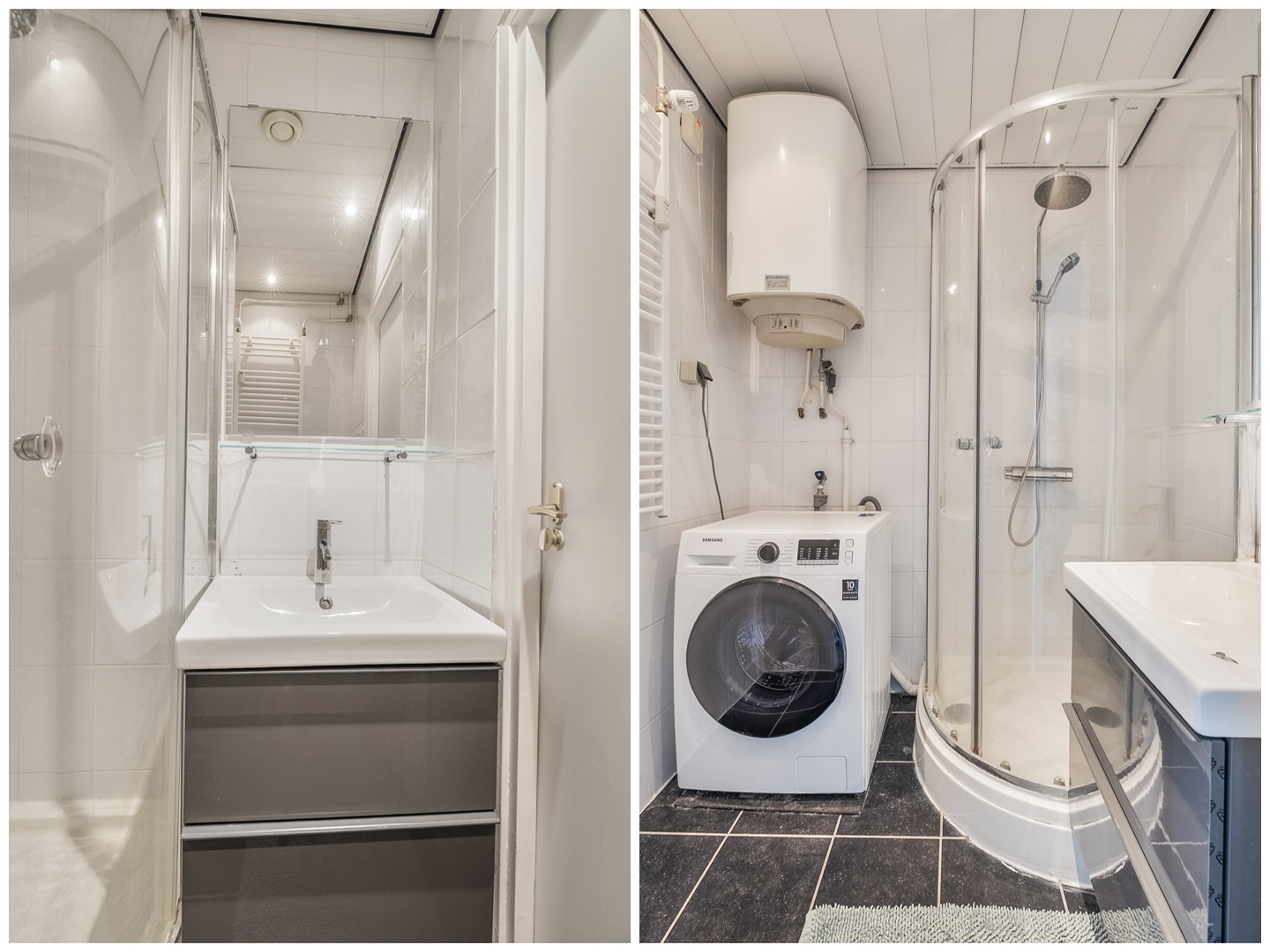 Terug in de entree vinden we de badkamer en het separate toilet. De badkamer is volledig betegeld en netjes uitgerust: een douche, wastafelmeubel, handdoekradiator en een aansluiting voor de wasmachine. Alles heeft zijn eigen plek.