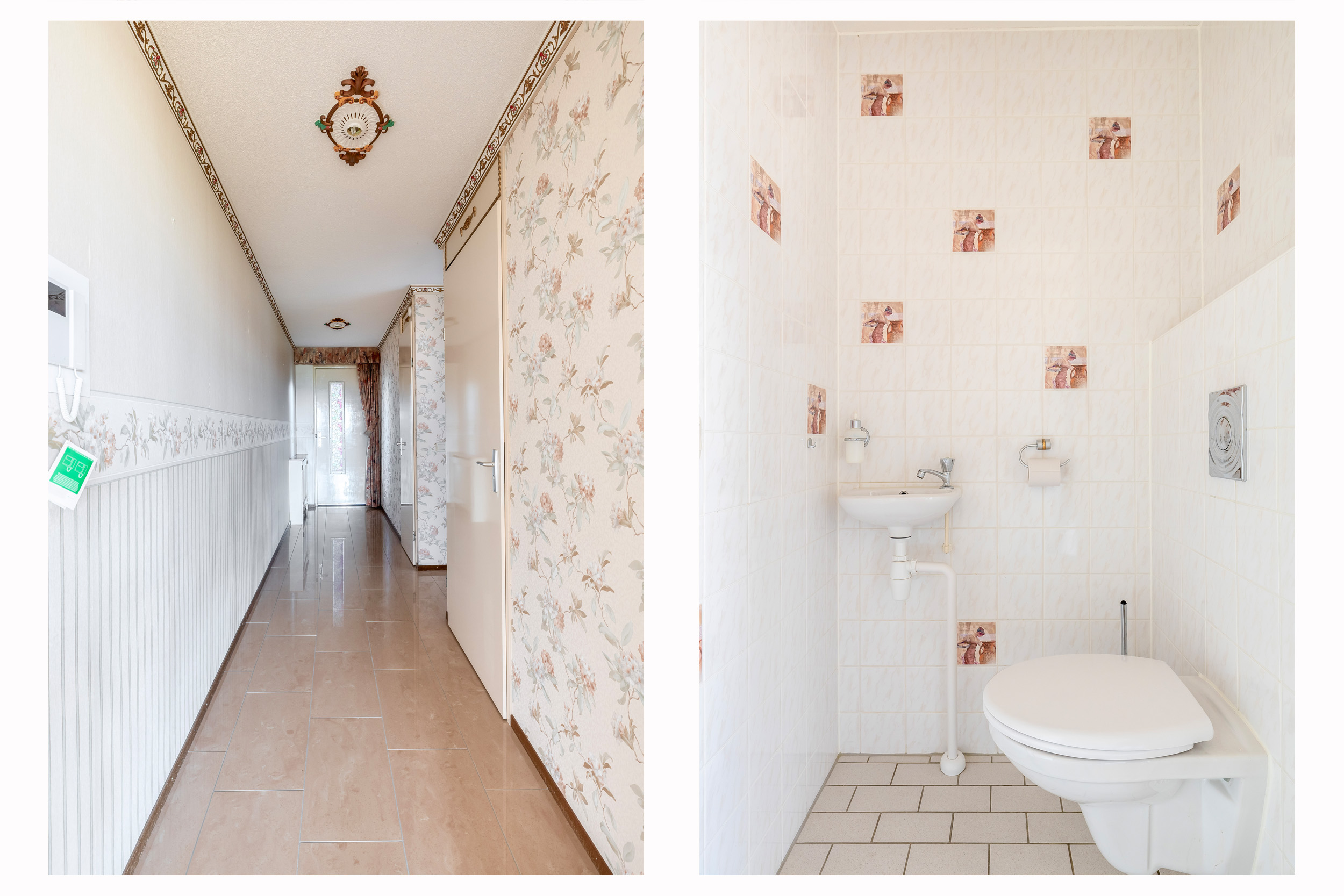 Entree, hal met meterkast, garderobe, vaste kast met de opstelling voor de Cv ketel (Vaillant 2021) en toegang tot alle vertrekken, toiletruimte voorzien van een hangcloset toilet en fonteintje. De toiletruimte is geheel betegeld in een neutrale kleurstelling.