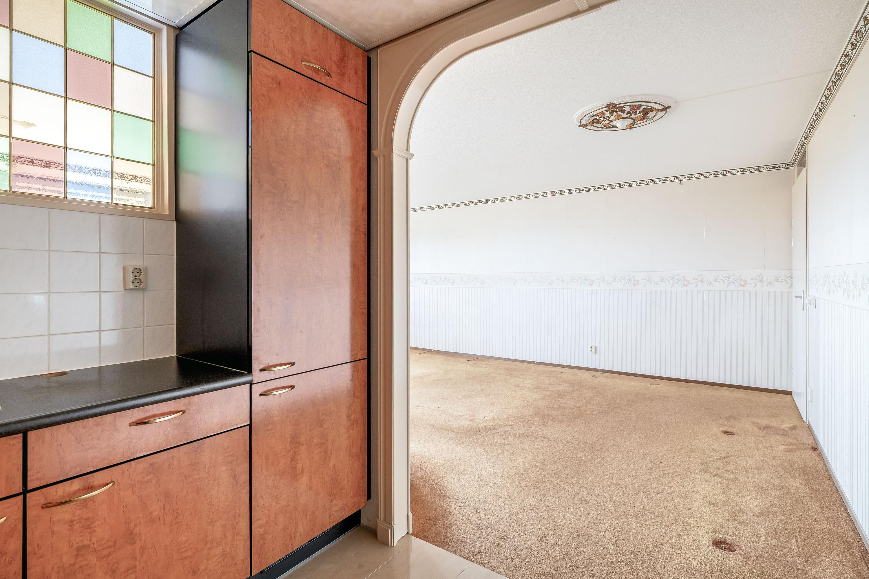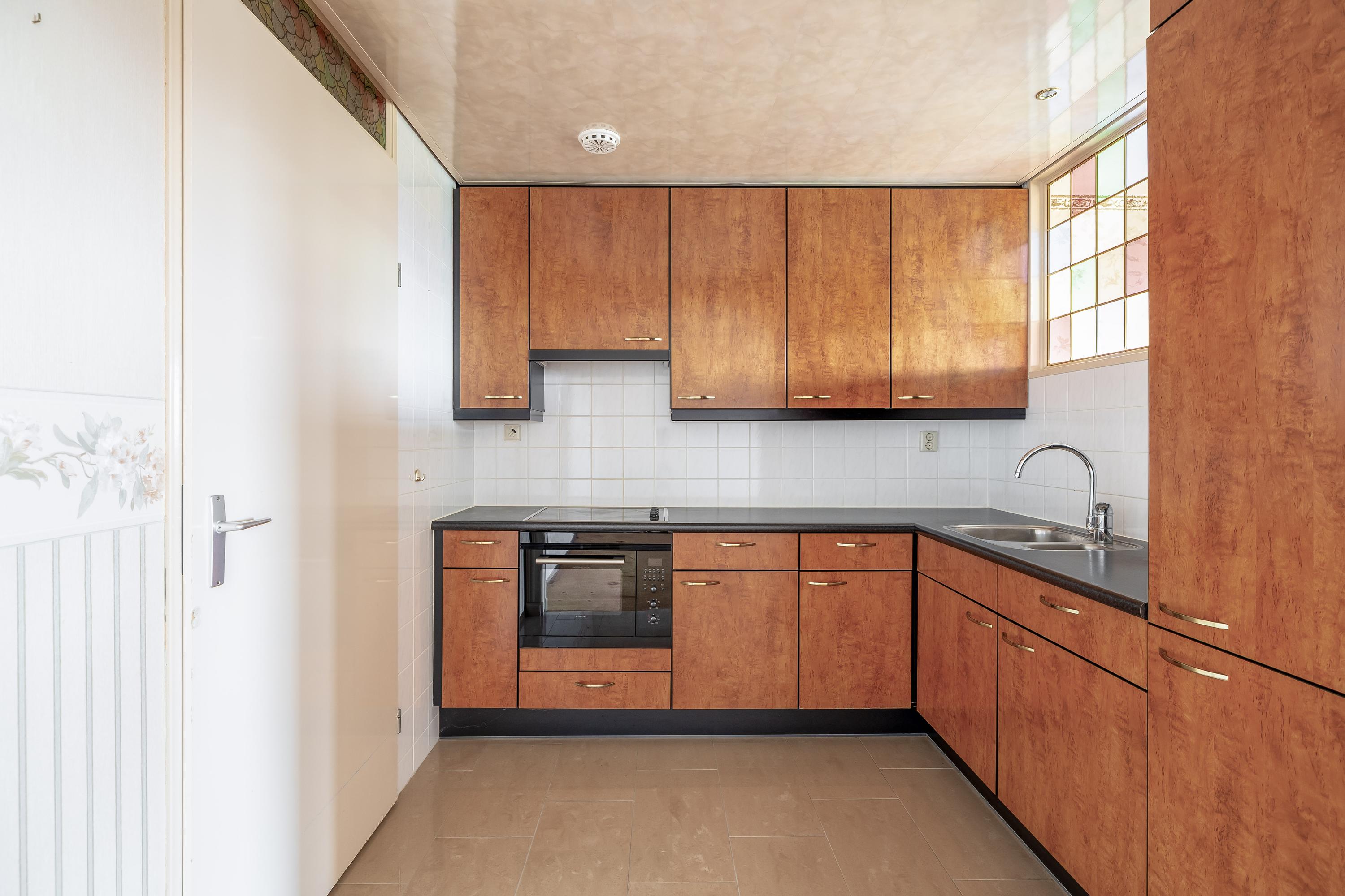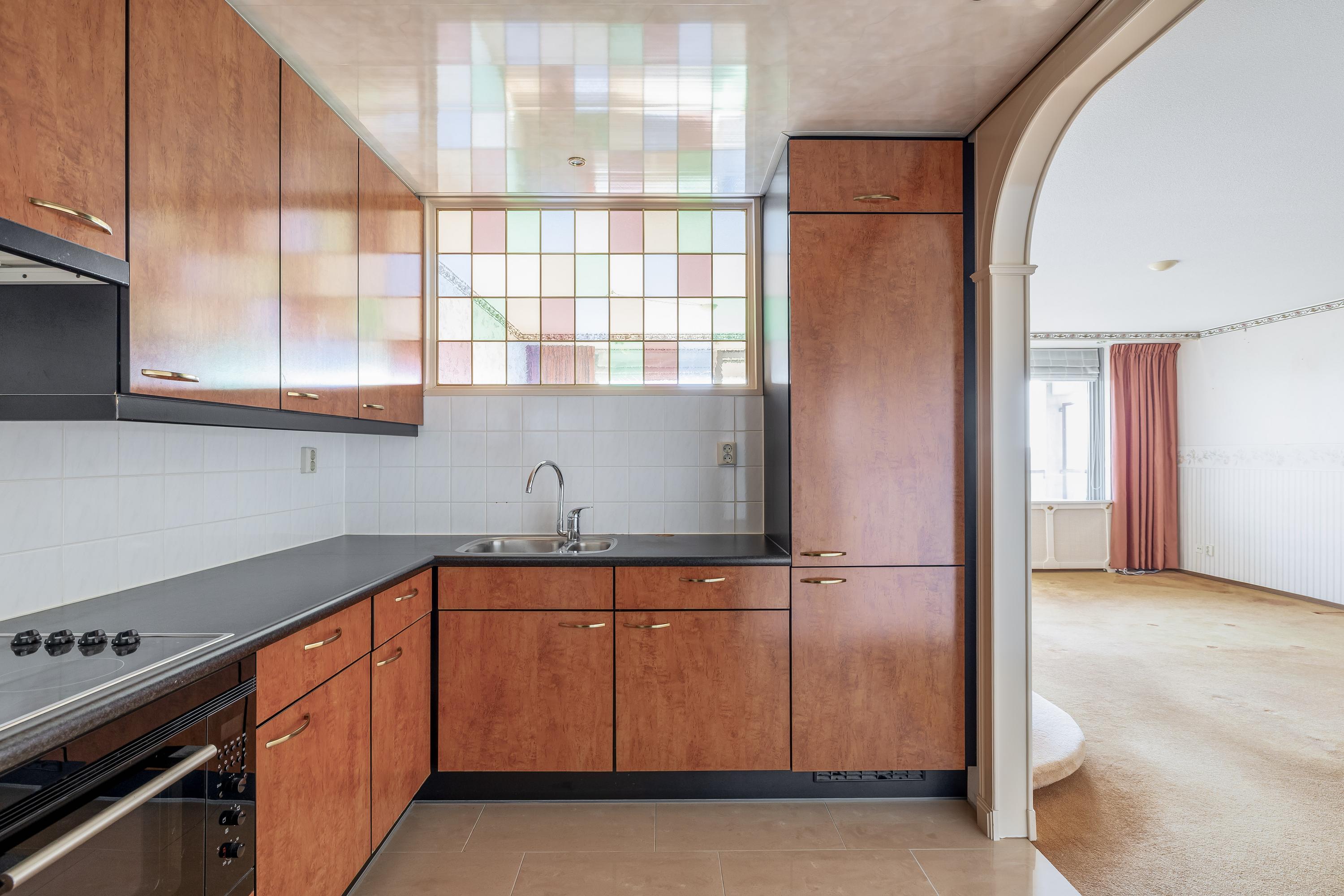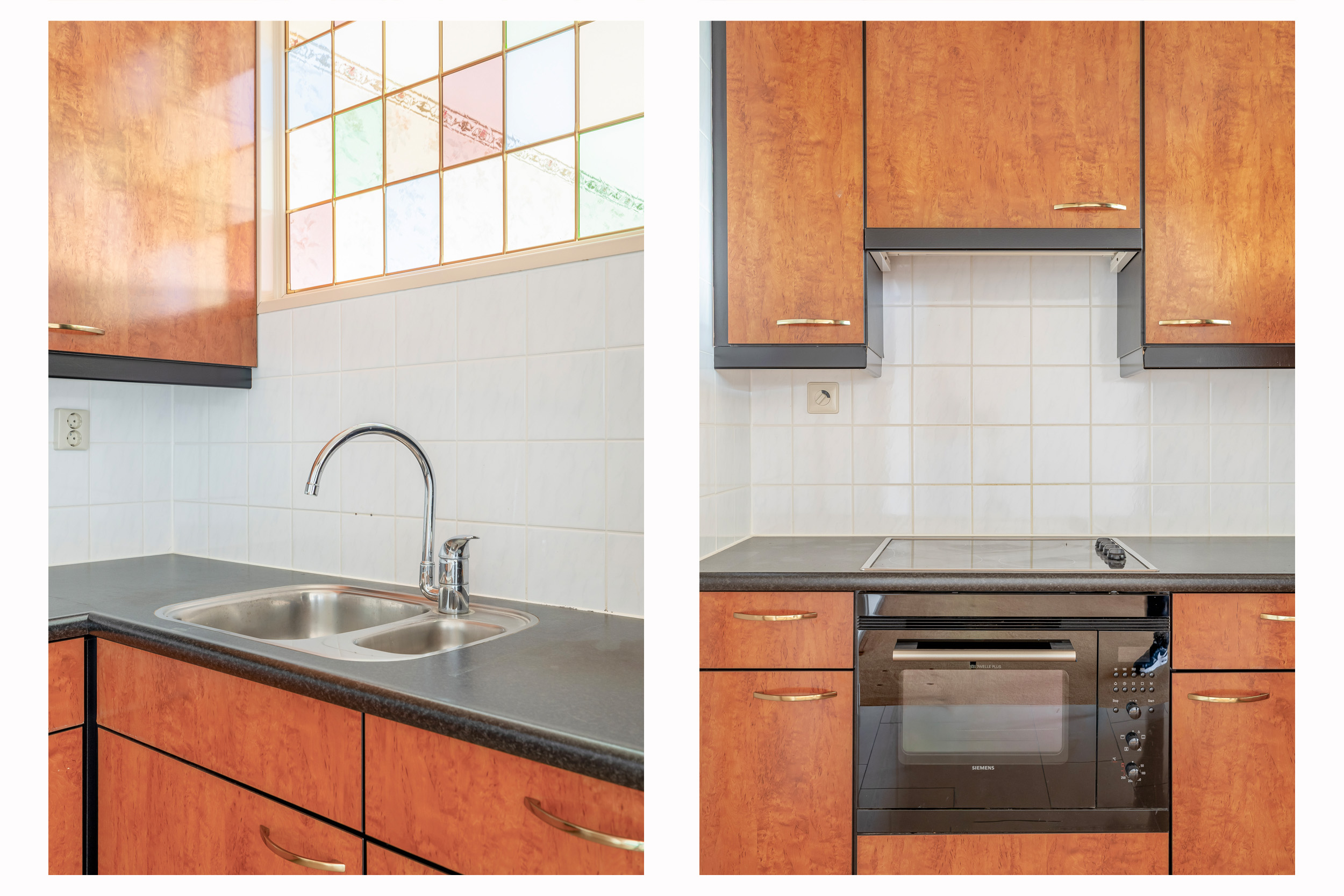 De open keuken (ca. 6 m2) is uitgevoerd in een L-opstelling. De keuken is voorzien van diverse inbouwapparatuur zoals een koelkast, vriezer, inductie kookplaat, afzuigkap en een combimagnetron. Verder is de keuken voorzien van een anderhalve spoelbak en voldoende kastruimte. Het geheel is uitgevoerd in houtlook en is afgewerkt met tegelvloer en een kunststof zwarte aanrechtblad.