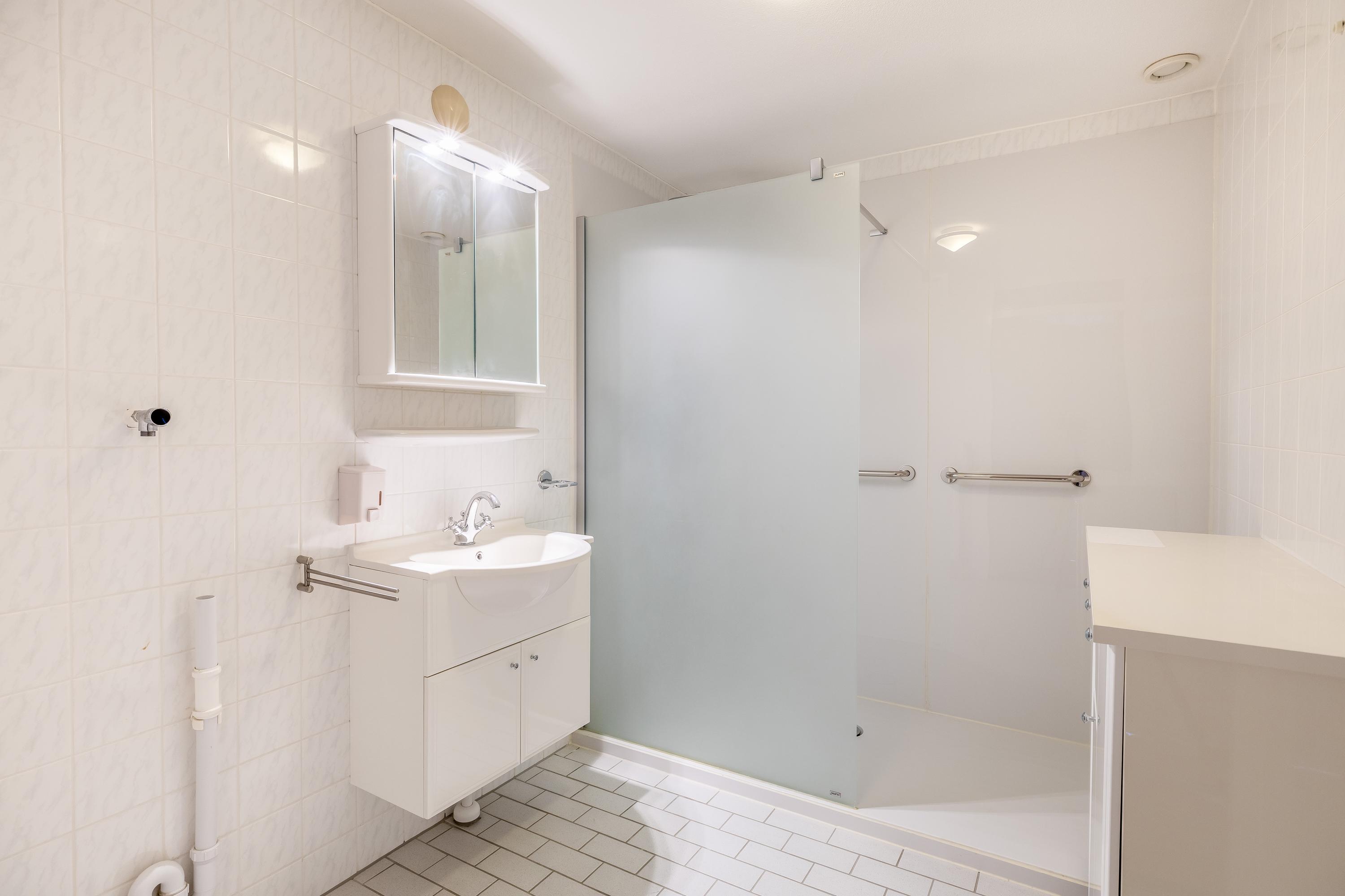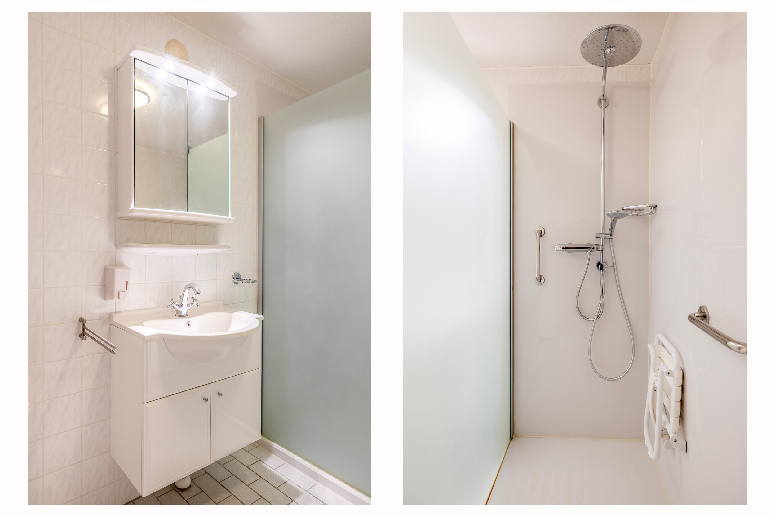 Badkamer (ca. 6 m2) met sanitaire voorzieningen zoals een wastafel met wastafelmeubel, spiegel met spiegelkast en verlichting, een extra vaste kast voor de handdoeken, inloopdouche met regendouche en de aansluiting voor de wasmachine/droger. De badkamer is geheel betegeld in een lichte kleurstelling.